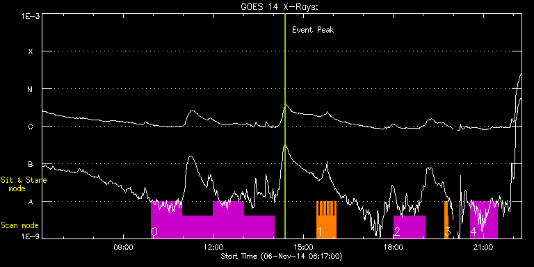 EIS Observation timeline overlay to GOES-Xray curve Code 1" 2" 40" 266" EIS Observations list for this event: STUDY ACRONYM ID DATE OBSERVED DESCRIPTION NOAA# TARGET 0 HPW021_VEL_120x512v1 | 43670 | 2014/11/06 09:55:21 | Flare study | | Active Region TIMELINE ID DATE OBSERVED FITS FILE XCEN (+W/-E) YCEN (+N/-S) DUR ----------------------------------------------------------------------------------------------------------------- 43670 | 2014/11/06 09:55:21.000 | eis_l0_20141106_095521.fits.gz | -651.91 | 93.14 | 1h1m52s 43670 | 2014/11/06 10:57:20.000 | eis_l0_20141106_105720.fits.gz | -646.58 | 92.37 | 1h1m51s 43670 | 2014/11/06 11:59:18.000 | eis_l0_20141106_115918.fits.gz | -641.02 | 92.14 | 1h1m52s 43670 | 2014/11/06 13:01:17.000 | eis_l0_20141106_130117.fits.gz | -635.46 | 91.67 | 59m48s 1 HH_Flare_raster_v6 | 43672 | 2014/11/06 15:26:27 | Flare study | 2205 | Flare TIMELINE ID DATE OBSERVED FITS FILE XCEN (+W/-E) YCEN (+N/-S) DUR ----------------------------------------------------------------------------------------------------------------- 43672 | 2014/11/06 15:26:27.000 | eis_l0_20141106_152627.fits.gz | -742.97 | 220.51 | 3m32s 43672 | 2014/11/06 15:30:02.000 | eis_l0_20141106_153002.fits.gz | -742.58 | 220.59 | 3m31s 43672 | 2014/11/06 15:33:36.000 | eis_l0_20141106_153336.fits.gz | -742.27 | 220.51 | 3m31s 43672 | 2014/11/06 15:37:10.000 | eis_l0_20141106_153710.fits.gz | -741.89 | 220.51 | 3m31s 43672 | 2014/11/06 15:40:44.000 | eis_l0_20141106_154044.fits.gz | -741.58 | 220.59 | 3m32s 43672 | 2014/11/06 15:44:18.000 | eis_l0_20141106_154418.fits.gz | -741.27 | 220.51 | 3m32s 43672 | 2014/11/06 15:47:53.000 | eis_l0_20141106_154753.fits.gz | -740.88 | 220.36 | 3m31s 43672 | 2014/11/06 15:51:27.000 | eis_l0_20141106_155127.fits.gz | -740.57 | 220.44 | 3m31s 43672 | 2014/11/06 15:55:01.000 | eis_l0_20141106_155501.fits.gz | -740.26 | 220.36 | 3m32s 43672 | 2014/11/06 15:58:35.000 | eis_l0_20141106_155835.fits.gz | -739.88 | 220.36 | 3m32s 43672 | 2014/11/06 16:02:10.000 | eis_l0_20141106_160210.fits.gz | -739.57 | 220.36 | 3m10s 2 HPW021_VEL_120x512v1 | 43667 | 2014/11/06 18:01:28 | HOP170 | | Active Region TIMELINE ID DATE OBSERVED FITS FILE XCEN (+W/-E) YCEN (+N/-S) DUR ----------------------------------------------------------------------------------------------------------------- 43667 | 2014/11/06 18:01:28.000 | eis_l0_20141106_180128.fits.gz | -605.83 | 124.74 | 1h1m53s 3 IUU_SCAN_STEPS_002 | 43689 | 2014/11/06 19:42:07 | HOP170 | | Active Region TIMELINE ID DATE OBSERVED FITS FILE XCEN (+W/-E) YCEN (+N/-S) DUR ----------------------------------------------------------------------------------------------------------------- 43689 | 2014/11/06 19:42:07.000 | eis_l0_20141106_194207.fits.gz | -707.08 | 253.97 | 5m23s 43689 | 2014/11/06 19:47:34.000 | eis_l0_20141106_194734.fits.gz | -706.53 | 253.81 | 1m47s 4 HPW021_VEL_120x512v1 | 43690 | 2014/11/06 20:33:40 | HOP170 | | Active Region TIMELINE ID DATE OBSERVED FITS FILE XCEN (+W/-E) YCEN (+N/-S) DUR ----------------------------------------------------------------------------------------------------------------- 43690 | 2014/11/06 20:33:40.000 | eis_l0_20141106_203340.fits.gz | -700.91 | 253.58 | 54m39s : Check study information : Download file : View thumbnails For this event, also check for: