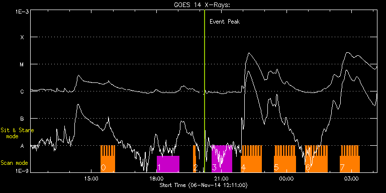 EIS Observation timeline overlay to GOES-Xray curve Code 1" 2" 40" 266" EIS Observations list for this event: STUDY ACRONYM ID DATE OBSERVED DESCRIPTION NOAA# TARGET 0 HH_Flare_raster_v6 | 43672 | 2014/11/06 15:26:27 | Flare study | 2205 | Flare TIMELINE ID DATE OBSERVED FITS FILE XCEN (+W/-E) YCEN (+N/-S) DUR ----------------------------------------------------------------------------------------------------------------- 43672 | 2014/11/06 15:26:27.000 | eis_l0_20141106_152627.fits.gz | -742.97 | 220.51 | 3m32s 43672 | 2014/11/06 15:30:02.000 | eis_l0_20141106_153002.fits.gz | -742.58 | 220.59 | 3m31s 43672 | 2014/11/06 15:33:36.000 | eis_l0_20141106_153336.fits.gz | -742.27 | 220.51 | 3m31s 43672 | 2014/11/06 15:37:10.000 | eis_l0_20141106_153710.fits.gz | -741.89 | 220.51 | 3m31s 43672 | 2014/11/06 15:40:44.000 | eis_l0_20141106_154044.fits.gz | -741.58 | 220.59 | 3m32s 43672 | 2014/11/06 15:44:18.000 | eis_l0_20141106_154418.fits.gz | -741.27 | 220.51 | 3m32s 43672 | 2014/11/06 15:47:53.000 | eis_l0_20141106_154753.fits.gz | -740.88 | 220.36 | 3m31s 43672 | 2014/11/06 15:51:27.000 | eis_l0_20141106_155127.fits.gz | -740.57 | 220.44 | 3m31s 43672 | 2014/11/06 15:55:01.000 | eis_l0_20141106_155501.fits.gz | -740.26 | 220.36 | 3m32s 43672 | 2014/11/06 15:58:35.000 | eis_l0_20141106_155835.fits.gz | -739.88 | 220.36 | 3m32s 43672 | 2014/11/06 16:02:10.000 | eis_l0_20141106_160210.fits.gz | -739.57 | 220.36 | 3m10s 1 HPW021_VEL_120x512v1 | 43667 | 2014/11/06 18:01:28 | HOP170 | | Active Region TIMELINE ID DATE OBSERVED FITS FILE XCEN (+W/-E) YCEN (+N/-S) DUR ----------------------------------------------------------------------------------------------------------------- 43667 | 2014/11/06 18:01:28.000 | eis_l0_20141106_180128.fits.gz | -605.83 | 124.74 | 1h1m53s 2 IUU_SCAN_STEPS_002 | 43689 | 2014/11/06 19:42:07 | HOP170 | | Active Region TIMELINE ID DATE OBSERVED FITS FILE XCEN (+W/-E) YCEN (+N/-S) DUR ----------------------------------------------------------------------------------------------------------------- 43689 | 2014/11/06 19:42:07.000 | eis_l0_20141106_194207.fits.gz | -707.08 | 253.97 | 5m23s 43689 | 2014/11/06 19:47:34.000 | eis_l0_20141106_194734.fits.gz | -706.53 | 253.81 | 1m47s 3 HPW021_VEL_120x512v1 | 43690 | 2014/11/06 20:33:40 | HOP170 | | Active Region TIMELINE ID DATE OBSERVED FITS FILE XCEN (+W/-E) YCEN (+N/-S) DUR ----------------------------------------------------------------------------------------------------------------- 43690 | 2014/11/06 20:33:40.000 | eis_l0_20141106_203340.fits.gz | -700.91 | 253.58 | 54m39s 4 HH_Flare_raster_v6 | 43673 | 2014/11/06 21:53:57 | Flare study | | Flare TIMELINE ID DATE OBSERVED FITS FILE XCEN (+W/-E) YCEN (+N/-S) DUR ----------------------------------------------------------------------------------------------------------------- 43673 | 2014/11/06 21:53:57.000 | eis_l0_20141106_215357.fits.gz | -705.42 | 217.89 | 3m31s 43673 | 2014/11/06 21:57:31.000 | eis_l0_20141106_215731.fits.gz | -705.12 | 217.96 | 3m32s 43673 | 2014/11/06 22:01:06.000 | eis_l0_20141106_220106.fits.gz | -704.73 | 217.96 | 3m31s 43673 | 2014/11/06 22:04:40.000 | eis_l0_20141106_220440.fits.gz | -704.34 | 217.96 | 3m32s 43673 | 2014/11/06 22:08:15.000 | eis_l0_20141106_220815.fits.gz | -704.11 | 218.04 | 3m31s 43673 | 2014/11/06 22:11:48.000 | eis_l0_20141106_221148.fits.gz | -703.65 | 218.04 | 3m32s 43673 | 2014/11/06 22:15:23.000 | eis_l0_20141106_221523.fits.gz | -703.26 | 217.89 | 3m31s 43673 | 2014/11/06 22:18:57.000 | eis_l0_20141106_221857.fits.gz | -702.88 | 217.96 | 3m32s 43673 | 2014/11/06 22:22:32.000 | eis_l0_20141106_222232.fits.gz | -702.57 | 217.96 | 3m31s 43673 | 2014/11/06 22:26:06.000 | eis_l0_20141106_222606.fits.gz | -702.26 | 217.66 | 3m31s 43673 | 2014/11/06 22:29:40.000 | eis_l0_20141106_222940.fits.gz | -701.95 | 217.89 | 3m31s 43673 | 2014/11/06 22:33:14.000 | eis_l0_20141106_223314.fits.gz | -701.49 | 217.89 | 3m32s 43673 | 2014/11/06 22:36:49.000 | eis_l0_20141106_223649.fits.gz | -701.10 | 217.81 | 3m31s 43673 | 2014/11/06 22:40:23.000 | eis_l0_20141106_224023.fits.gz | -700.79 | 217.73 | 3m32s 43673 | 2014/11/06 22:43:58.000 | eis_l0_20141106_224358.fits.gz | -700.40 | 217.73 | 3m31s 43673 | 2014/11/06 22:47:32.000 | eis_l0_20141106_224732.fits.gz | -700.02 | 217.58 | 3m31s 5 HH_Flare_raster_v6 | 43678 | 2014/11/06 23:25:13 | Flare study | | Flare TIMELINE ID DATE OBSERVED FITS FILE XCEN (+W/-E) YCEN (+N/-S) DUR ----------------------------------------------------------------------------------------------------------------- 43678 | 2014/11/06 23:25:13.000 | eis_l0_20141106_232513.fits.gz | -696.23 | 217.50 | 3m32s 43678 | 2014/11/06 23:28:48.000 | eis_l0_20141106_232848.fits.gz | -695.85 | 217.50 | 3m32s 43678 | 2014/11/06 23:32:22.000 | eis_l0_20141106_233222.fits.gz | -695.46 | 217.58 | 3m31s 43678 | 2014/11/06 23:35:56.000 | eis_l0_20141106_233556.fits.gz | -695.15 | 217.42 | 3m31s 43678 | 2014/11/06 23:39:30.000 | eis_l0_20141106_233930.fits.gz | -694.84 | 217.42 | 3m32s 43678 | 2014/11/06 23:43:04.000 | eis_l0_20141106_234304.fits.gz | -694.46 | 217.35 | 3m32s 43678 | 2014/11/06 23:46:39.000 | eis_l0_20141106_234639.fits.gz | -694.07 | 217.27 | 3m32s 43678 | 2014/11/06 23:50:13.000 | eis_l0_20141106_235013.fits.gz | -693.76 | 217.42 | 3m32s 43678 | 2014/11/06 23:53:47.000 | eis_l0_20141106_235347.fits.gz | -693.30 | 217.27 | 3m32s 43678 | 2014/11/06 23:57:22.000 | eis_l0_20141106_235722.fits.gz | -692.91 | 217.27 | 3m31s 43678 | 2014/11/07 00:00:56.000 | eis_l0_20141107_000056.fits.gz | -692.60 | 217.27 | 3m31s 43678 | 2014/11/07 00:04:30.000 | eis_l0_20141107_000430.fits.gz | -692.22 | 217.35 | 3m32s 43678 | 2014/11/07 00:08:04.000 | eis_l0_20141107_000804.fits.gz | -691.83 | 217.27 | 3m32s 43678 | 2014/11/07 00:11:39.000 | eis_l0_20141107_001139.fits.gz | -691.52 | 217.42 | 3m32s 43678 | 2014/11/07 00:15:13.000 | eis_l0_20141107_001513.fits.gz | -691.13 | 217.19 | 3m32s 43678 | 2014/11/07 00:18:48.000 | eis_l0_20141107_0