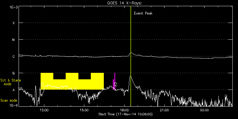 EIS Observation timeline overlay to GOES-Xray curve Code 1" 2" 40" 266" EIS Observations list for this event: STUDY ACRONYM ID DATE OBSERVED DESCRIPTION NOAA# TARGET 0 Flare266_Hunter01 | 43820 | 2014/11/17 11:44:12 | Flare Hunting with XRT Trigger | | Flare TIMELINE ID DATE OBSERVED FITS FILE XCEN (+W/-E) YCEN (+N/-S) DUR ----------------------------------------------------------------------------------------------------------------- 43820 | 2014/11/17 11:44:12.000 | eis_l0_20141117_114412.fits.gz | -681.33 | -452.83 | 55m47s 43820 | 2014/11/17 12:40:51.000 | eis_l0_20141117_124051.fits.gz | -674.46 | -453.21 | 55m47s 43820 | 2014/11/17 13:37:30.000 | eis_l0_20141117_133730.fits.gz | -667.51 | -453.21 | 55m48s 43820 | 2014/11/17 14:34:10.000 | eis_l0_20141117_143410.fits.gz | -660.55 | -453.37 | 55m47s 43820 | 2014/11/17 15:30:49.000 | eis_l0_20141117_153049.fits.gz | -653.60 | -453.37 | 55m47s 1 regcal071 | 43813 | 2014/11/17 17:09:10 | Dark exposures, CCD bottom rows (100s | | Engineering TIMELINE ID DATE OBSERVED FITS FILE XCEN (+W/-E) YCEN (+N/-S) DUR ----------------------------------------------------------------------------------------------------------------- 43813 | 2014/11/17 17:09:10.000 | eis_l0_20141117_170910.fits.gz | -494.16 | -603.98 | 3m22s 2 regcal072 | 43814 | 2014/11/17 17:15:30 | Dark exposures, top CCD rows (100s exp | | Engineering TIMELINE ID DATE OBSERVED FITS FILE XCEN (+W/-E) YCEN (+N/-S) DUR ----------------------------------------------------------------------------------------------------------------- 43814 | 2014/11/17 17:15:30.000 | eis_l0_20141117_171530.fits.gz | -493.32 | -92.91 | 3m22s : Check study information : Download file : View thumbnails For this event, also check for: