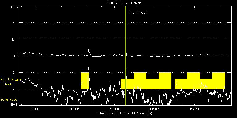 EIS Observation timeline overlay to GOES-Xray curve Code 1" 2" 40" 266" EIS Observations list for this event: STUDY ACRONYM ID DATE OBSERVED DESCRIPTION NOAA# TARGET 0 Flare266_Hunter01 | 43837 | 2014/11/19 18:26:33 | Flare hunting with XRT trigger. | | Flare TIMELINE ID DATE OBSERVED FITS FILE XCEN (+W/-E) YCEN (+N/-S) DUR ----------------------------------------------------------------------------------------------------------------- 43837 | 2014/11/19 18:26:33.000 | eis_l0_20141119_182633.fits.gz | -266.13 | -469.74 | 35m1s 1 Flare266_Hunter01 | 43838 | 2014/11/19 21:28:41 | Flare hunting with XRT trigger. | | Flare TIMELINE ID DATE OBSERVED FITS FILE XCEN (+W/-E) YCEN (+N/-S) DUR ----------------------------------------------------------------------------------------------------------------- 43838 | 2014/11/19 21:28:41.000 | eis_l0_20141119_212841.fits.gz | -239.09 | -469.43 | 55m49s 43838 | 2014/11/19 22:25:22.000 | eis_l0_20141119_222522.fits.gz | -230.67 | -469.43 | 55m47s 43838 | 2014/11/19 23:22:01.000 | eis_l0_20141119_232201.fits.gz | -222.25 | -469.43 | 55m47s 43838 | 2014/11/20 00:18:40.000 | eis_l0_20141120_001840.fits.gz | -213.83 | -469.43 | 55m48s 2 Flare266_Hunter01 | 43839 | 2014/11/20 01:30:26 | Flare hunting with XRT trigger. | | Flare TIMELINE ID DATE OBSERVED FITS FILE XCEN (+W/-E) YCEN (+N/-S) DUR ----------------------------------------------------------------------------------------------------------------- 43839 | 2014/11/20 01:30:26.000 | eis_l0_20141120_013026.fits.gz | -203.25 | -469.28 | 55m47s 43839 | 2014/11/20 02:27:05.000 | eis_l0_20141120_022705.fits.gz | -194.75 | -469.28 | 55m48s 43839 | 2014/11/20 03:23:45.000 | eis_l0_20141120_032345.fits.gz | -186.33 | -469.28 | 55m50s 43839 | 2014/11/20 04:20:26.000 | eis_l0_20141120_042026.fits.gz | -177.83 | -469.20 | 55m48s : Check study information : Download file : View thumbnails For this event, also check for: