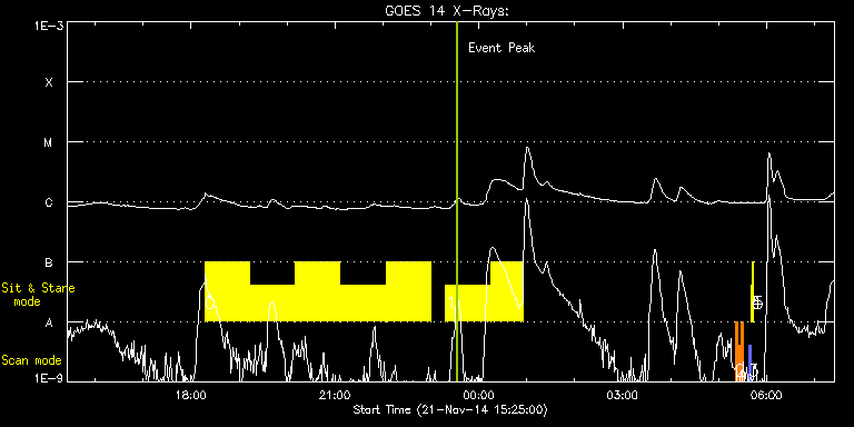 EIS Observation timeline overlay to GOES-Xray curve Code 1" 2" 40" 266" EIS Observations list for this event: STUDY ACRONYM ID DATE OBSERVED DESCRIPTION NOAA# TARGET 0 Flare266_Hunter01 | 43850 | 2014/11/21 18:17:03 | Flare Hunting. | | Flare TIMELINE ID DATE OBSERVED FITS FILE XCEN (+W/-E) YCEN (+N/-S) DUR ----------------------------------------------------------------------------------------------------------------- 43850 | 2014/11/21 18:17:03.000 | eis_l0_20141121_181703.fits.gz | 157.11 | -464.49 | 55m48s 43850 | 2014/11/21 19:13:42.000 | eis_l0_20141121_191342.fits.gz | 165.07 | -464.03 | 55m48s 43850 | 2014/11/21 20:10:22.000 | eis_l0_20141121_201022.fits.gz | 173.18 | -464.10 | 55m48s 43850 | 2014/11/21 21:07:02.000 | eis_l0_20141121_210702.fits.gz | 181.06 | -463.80 | 55m49s 43850 | 2014/11/21 22:03:42.000 | eis_l0_20141121_220342.fits.gz | 188.94 | -463.72 | 55m48s 1 Flare266_Hunter01 | 43857 | 2014/11/21 23:18:41 | Flare Hunting. | | Flare TIMELINE ID DATE OBSERVED FITS FILE XCEN (+W/-E) YCEN (+N/-S) DUR ----------------------------------------------------------------------------------------------------------------- 43857 | 2014/11/21 23:18:41.000 | eis_l0_20141121_231841.fits.gz | 199.45 | -463.41 | 55m49s 43857 | 2014/11/22 00:15:22.000 | eis_l0_20141122_001522.fits.gz | 207.32 | -463.26 | 40m41s 2 HH_Flare_raster_v6 | 43851 | 2014/11/22 05:20:42 | Flare mode observations. | | Flare TIMELINE ID DATE OBSERVED FITS FILE XCEN (+W/-E) YCEN (+N/-S) DUR ----------------------------------------------------------------------------------------------------------------- 43851 | 2014/11/22 05:20:42.000 | eis_l0_20141122_052042.fits.gz | 385.68 | -293.33 | 3m32s 43851 | 2014/11/22 05:24:16.000 | eis_l0_20141122_052416.fits.gz | 386.22 | -293.40 | 3m32s 43851 | 2014/11/22 05:27:51.000 | eis_l0_20141122_052751.fits.gz | 386.69 | -293.17 | 3m32s 3 PRY_slot_contextLITE | 43853 | 2014/11/22 05:37:19 | EIS pointing monitoring. | | Active Region TIMELINE ID DATE OBSERVED FITS FILE XCEN (+W/-E) YCEN (+N/-S) DUR ----------------------------------------------------------------------------------------------------------------- 43853 | 2014/11/22 05:37:19.000 | eis_l0_20141122_053719.fits.gz | -15.29 | -0.27 | 2m56s 4 Alignment_266 | 43854 | 2014/11/22 05:40:33 | EIS pointing monitoring. | | Quiet Sun TIMELINE ID DATE OBSERVED FITS FILE XCEN (+W/-E) YCEN (+N/-S) DUR ----------------------------------------------------------------------------------------------------------------- 43854 | 2014/11/22 05:40:33.000 | eis_l0_20141122_054033.fits.gz | -132.57 | -0.50 | 1m23s 5 XRT_synop_AIA | 43855 | 2014/11/22 05:42:41 | EIS pointing monitoring. | | Quiet Sun TIMELINE ID DATE OBSERVED FITS FILE XCEN (+W/-E) YCEN (+N/-S) DUR ----------------------------------------------------------------------------------------------------------------- 43855 | 2014/11/22 05:42:41.000 | eis_l0_20141122_054241.fits.gz | -132.49 | -0.50 | 10s : Check study information : Download file : View thumbnails For this event, also check for: