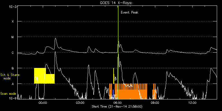 EIS Observation timeline overlay to GOES-Xray curve Code 1" 2" 40" 266" EIS Observations list for this event: STUDY ACRONYM ID DATE OBSERVED DESCRIPTION NOAA# TARGET 0 Flare266_Hunter01 | 43857 | 2014/11/21 23:18:41 | Flare Hunting. | | Flare TIMELINE ID DATE OBSERVED FITS FILE XCEN (+W/-E) YCEN (+N/-S) DUR ----------------------------------------------------------------------------------------------------------------- 43857 | 2014/11/21 23:18:41.000 | eis_l0_20141121_231841.fits.gz | 199.45 | -463.41 | 55m49s 43857 | 2014/11/22 00:15:22.000 | eis_l0_20141122_001522.fits.gz | 207.32 | -463.26 | 40m41s 1 HH_Flare_raster_v6 | 43851 | 2014/11/22 05:20:42 | Flare mode observations. | | Flare TIMELINE ID DATE OBSERVED FITS FILE XCEN (+W/-E) YCEN (+N/-S) DUR ----------------------------------------------------------------------------------------------------------------- 43851 | 2014/11/22 05:20:42.000 | eis_l0_20141122_052042.fits.gz | 385.68 | -293.33 | 3m32s 43851 | 2014/11/22 05:24:16.000 | eis_l0_20141122_052416.fits.gz | 386.22 | -293.40 | 3m32s 43851 | 2014/11/22 05:27:51.000 | eis_l0_20141122_052751.fits.gz | 386.69 | -293.17 | 3m32s 2 PRY_slot_contextLITE | 43853 | 2014/11/22 05:37:19 | EIS pointing monitoring. | | Active Region TIMELINE ID DATE OBSERVED FITS FILE XCEN (+W/-E) YCEN (+N/-S) DUR ----------------------------------------------------------------------------------------------------------------- 43853 | 2014/11/22 05:37:19.000 | eis_l0_20141122_053719.fits.gz | -15.29 | -0.27 | 2m56s 3 Alignment_266 | 43854 | 2014/11/22 05:40:33 | EIS pointing monitoring. | | Quiet Sun TIMELINE ID DATE OBSERVED FITS FILE XCEN (+W/-E) YCEN (+N/-S) DUR ----------------------------------------------------------------------------------------------------------------- 43854 | 2014/11/22 05:40:33.000 | eis_l0_20141122_054033.fits.gz | -132.57 | -0.50 | 1m23s 4 XRT_synop_AIA | 43855 | 2014/11/22 05:42:41 | EIS pointing monitoring. | | Quiet Sun TIMELINE ID DATE OBSERVED FITS FILE XCEN (+W/-E) YCEN (+N/-S) DUR ----------------------------------------------------------------------------------------------------------------- 43855 | 2014/11/22 05:42:41.000 | eis_l0_20141122_054241.fits.gz | -132.49 | -0.50 | 10s 5 HH_Flare_raster_v6 | 43852 | 2014/11/22 05:47:19 | Flare mode observations. | | Flare TIMELINE ID DATE OBSERVED FITS FILE XCEN (+W/-E) YCEN (+N/-S) DUR ----------------------------------------------------------------------------------------------------------------- 43852 | 2014/11/22 05:47:19.000 | eis_l0_20141122_054719.fits.gz | 389.31 | -293.17 | 3m32s 43852 | 2014/11/22 05:50:53.000 | eis_l0_20141122_055053.fits.gz | 389.85 | -293.17 | 3m32s 43852 | 2014/11/22 05:54:28.000 | eis_l0_20141122_055428.fits.gz | 390.24 | -293.25 | 3m31s 43852 | 2014/11/22 05:58:02.000 | eis_l0_20141122_055802.fits.gz | 390.86 | -293.25 | 3m33s 43852 | 2014/11/22 06:01:37.000 | eis_l0_20141122_060137.fits.gz | 391.24 | -293.10 | 3m32s 43852 | 2014/11/22 06:05:12.000 | eis_l0_20141122_060512.fits.gz | 391.71 | -293.02 | 3m32s 43852 | 2014/11/22 06:08:47.000 | eis_l0_20141122_060847.fits.gz | 392.17 | -292.94 | 3m31s 43852 | 2014/11/22 06:12:20.000 | eis_l0_20141122_061220.fits.gz | 392.79 | -293.10 | 3m32s 43852 | 2014/11/22 06:15:55.000 | eis_l0_20141122_061555.fits.gz | 393.25 | -293.10 | 3m32s 43852 | 2014/11/22 06:19:29.000 | eis_l0_20141122_061929.fits.gz | 393.64 | -293.10 | 3m32s 43852 | 2014/11/22 06:23:04.000 | eis_l0_20141122_062304.fits.gz | 394.18 | -293.17 | 3m31s 43852 | 2014/11/22 06:26:38.000 | eis_l0_20141122_062638.fits.gz | 394.57 | -292.94 | 3m32s 43852 | 2014/11/22 06:30:13.000 | eis_l0_20141122_063013.fits.gz | 395.11 | -293.02 | 3m31s 43852 | 2014/11/22 06:33:47.000 | eis_l0_20141122_063347.fits.gz | 395.57 | -292.94 | 3m31s 43852 | 2014/11/22 06:37:20.000 | eis_l0_20141122_063720.fits.gz | 396.11 | -292.86 | 3m32s 43852 | 2014/11/22 06:40:55.000 | eis_l0_20141122_064055.fits.gz | 396.65 | -293.02 | 3m32s 43852 | 2014/11/22 06:44:30.000 | eis_l0_20141122_064430.fits.gz | 397.04 | -292.94 | 3m31s 43852 | 2014/11/22 06:48:04.000 | eis_l0_20141122_064804.fits.gz | 397.50 | -292.94 | 3m31s 43852 | 2014/11/22 06:51:38.000 | eis_l0_20141122_065138.fits.gz | 398.04 | -292.94 | 3m32s 43852 | 2014/11/22 06:55:13.000 | eis_l0_20141122_065513.fits.gz | 398.58 | -293.02 | 3m31s 43852 | 2014/11/22 06:58:47.000 | eis_l0_20141122_065847.fits.gz | 398.97 | -292.94 | 3m32s 43852 | 2014/11/22 07:02:21.000 | eis_l0_20141122_070221.fits.gz | 399.43 | -292.94 | 3m32s 43852 | 2014/11/22 07:05:56.000 | eis_l0_20141122_070556.fits.gz | 399.97 | -292.86 | 3m31s 43852 | 2014/11/22 07:09:30.000 | eis_l0_20141122_070930.fits.gz | 400.44 | -292.79 | 3m32s 43852 | 2014/11/22 07:13:04.000 | eis_l0_20141122_071304.fits.gz | 400.82 | -292.94 | 3m32s 43852 | 2014/11/22 07:16:39.000 | eis_l0_20141122_071639.fits.gz | 401.44 | -292.86 | 3m31s 43852 | 2014/11/22 07:20:13.000 | eis_l0_20141122_072013.fits.gz | 401.90 | -292.86 | 3m32s 43852 | 2014/11/22 07:23:48.000 | eis_l0_20141122_072348.fits.gz | 402.37 | -292.86 | 3m31s 43852 | 2014/11/22 07:27:21.000 | eis_l0_20141122_072721.fits.gz | 402.83 | -292.86 | 3m32s 43852 | 2014/11/22 07:30:56.000 | eis_l0_20141122_073056.fits.gz | 403.29 | -292.79 | 3m31s 43852 | 2014/11/22 07:34:30.000 | eis_l0_20141122_073430.fits.gz | 403.83 | -292.79 | 3m32s 43852 | 2014/11/22 07:38:05.000 | eis_l0_20141122_073805.fits.gz | 404.30 | -292.79 | 3m31s 43852 | 2014/11/22 07:41:39.000 | eis_l0_20141122_074139.fits.gz | 404.76 | -292.79 | 3m31s 43852 | 2014/11/22 07:45:13.000 | eis_l0_20141122_074513.fits.gz | 405.30 | -292.63 | 3m32s 43852 | 2014/11/22 07:48:48.000 | eis_l0_20141122_074848.fits.gz | 405.69 | -292.63 | 3m31s 43852 | 2014/11/22 07:52:22.000 | eis_l0_20141122_075222.fits.gz | 406.23 | -292.63 | 3m31s 43852 | 2014/11/22 07:55:56.000 | eis_l0_20141122_075556.fits.gz | 406.77 | -292.63 | 3m32s 43852 | 2014/11/22 07:59:30.000 | eis_l0_20141122_075930.fits.gz | 407.16 | -292.63 | 3m31s 4