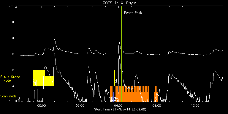 EIS Observation timeline overlay to GOES-Xray curve Code 1" 2" 40" 266" EIS Observations list for this event: STUDY ACRONYM ID DATE OBSERVED DESCRIPTION NOAA# TARGET 0 Flare266_Hunter01 | 43857 | 2014/11/21 23:18:41 | Flare Hunting. | | Flare TIMELINE ID DATE OBSERVED FITS FILE XCEN (+W/-E) YCEN (+N/-S) DUR ----------------------------------------------------------------------------------------------------------------- 43857 | 2014/11/21 23:18:41.000 | eis_l0_20141121_231841.fits.gz | 199.45 | -463.41 | 55m49s 43857 | 2014/11/22 00:15:22.000 | eis_l0_20141122_001522.fits.gz | 207.32 | -463.26 | 40m41s 1 HH_Flare_raster_v6 | 43851 | 2014/11/22 05:20:42 | Flare mode observations. | | Flare TIMELINE ID DATE OBSERVED FITS FILE XCEN (+W/-E) YCEN (+N/-S) DUR ----------------------------------------------------------------------------------------------------------------- 43851 | 2014/11/22 05:20:42.000 | eis_l0_20141122_052042.fits.gz | 385.68 | -293.33 | 3m32s 43851 | 2014/11/22 05:24:16.000 | eis_l0_20141122_052416.fits.gz | 386.22 | -293.40 | 3m32s 43851 | 2014/11/22 05:27:51.000 | eis_l0_20141122_052751.fits.gz | 386.69 | -293.17 | 3m32s 2 PRY_slot_contextLITE | 43853 | 2014/11/22 05:37:19 | EIS pointing monitoring. | | Active Region TIMELINE ID DATE OBSERVED FITS FILE XCEN (+W/-E) YCEN (+N/-S) DUR ----------------------------------------------------------------------------------------------------------------- 43853 | 2014/11/22 05:37:19.000 | eis_l0_20141122_053719.fits.gz | -15.29 | -0.27 | 2m56s 3 Alignment_266 | 43854 | 2014/11/22 05:40:33 | EIS pointing monitoring. | | Quiet Sun TIMELINE ID DATE OBSERVED FITS FILE XCEN (+W/-E) YCEN (+N/-S) DUR ----------------------------------------------------------------------------------------------------------------- 43854 | 2014/11/22 05:40:33.000 | eis_l0_20141122_054033.fits.gz | -132.57 | -0.50 | 1m23s 4 XRT_synop_AIA | 43855 | 2014/11/22 05:42:41 | EIS pointing monitoring. | | Quiet Sun TIMELINE ID DATE OBSERVED FITS FILE XCEN (+W/-E) YCEN (+N/-S) DUR ----------------------------------------------------------------------------------------------------------------- 43855 | 2014/11/22 05:42:41.000 | eis_l0_20141122_054241.fits.gz | -132.49 | -0.50 | 10s 5 HH_Flare_raster_v6 | 43852 | 2014/11/22 05:47:19 | Flare mode observations. | | Flare TIMELINE ID DATE OBSERVED FITS FILE XCEN (+W/-E) YCEN (+N/-S) DUR ----------------------------------------------------------------------------------------------------------------- 43852 | 2014/11/22 05:47:19.000 | eis_l0_20141122_054719.fits.gz | 389.31 | -293.17 | 3m32s 43852 | 2014/11/22 05:50:53.000 | eis_l0_20141122_055053.fits.gz | 389.85 | -293.17 | 3m32s 43852 | 2014/11/22 05:54:28.000 | eis_l0_20141122_055428.fits.gz | 390.24 | -293.25 | 3m31s 43852 | 2014/11/22 05:58:02.000 | eis_l0_20141122_055802.fits.gz | 390.86 | -293.25 | 3m33s 43852 | 2014/11/22 06:01:37.000 | eis_l0_20141122_060137.fits.gz | 391.24 | -293.10 | 3m32s 43852 | 2014/11/22 06:05:12.000 | eis_l0_20141122_060512.fits.gz | 391.71 | -293.02 | 3m32s 43852 | 2014/11/22 06:08:47.000 | eis_l0_20141122_060847.fits.gz | 392.17 | -292.94 | 3m31s 43852 | 2014/11/22 06:12:20.000 | eis_l0_20141122_061220.fits.gz | 392.79 | -293.10 | 3m32s 43852 | 2014/11/22 06:15:55.000 | eis_l0_20141122_061555.fits.gz | 393.25 | -293.10 | 3m32s 43852 | 2014/11/22 06:19:29.000 | eis_l0_20141122_061929.fits.gz | 393.64 | -293.10 | 3m32s 43852 | 2014/11/22 06:23:04.000 | eis_l0_20141122_062304.fits.gz | 394.18 | -293.17 | 3m31s 43852 | 2014/11/22 06:26:38.000 | eis_l0_20141122_062638.fits.gz | 394.57 | -292.94 | 3m32s 43852 | 2014/11/22 06:30:13.000 | eis_l0_20141122_063013.fits.gz | 395.11 | -293.02 | 3m31s 43852 | 2014/11/22 06:33:47.000 | eis_l0_20141122_063347.fits.gz | 395.57 | -292.94 | 3m31s 43852 | 2014/11/22 06:37:20.000 | eis_l0_20141122_063720.fits.gz | 396.11 | -292.86 | 3m32s 43852 | 2014/11/22 06:40:55.000 | eis_l0_20141122_064055.fits.gz | 396.65 | -293.02 | 3m32s 43852 | 2014/11/22 06:44:30.000 | eis_l0_20141122_064430.fits.gz | 397.04 | -292.94 | 3m31s 43852 | 2014/11/22 06:48:04.000 | eis_l0_20141122_064804.fits.gz | 397.50 | -292.94 | 3m31s 43852 | 2014/11/22 06:51:38.000 | eis_l0_20141122_065138.fits.gz | 398.04 | -292.94 | 3m32s 43852 | 2014/11/22 06:55:13.000 | eis_l0_20141122_065513.fits.gz | 398.58 | -293.02 | 3m31s 43852 | 2014/11/22 06:58:47.000 | eis_l0_20141122_065847.fits.gz | 398.97 | -292.94 | 3m32s 43852 | 2014/11/22 07:02:21.000 | eis_l0_20141122_070221.fits.gz | 399.43 | -292.94 | 3m32s 43852 | 2014/11/22 07:05:56.000 | eis_l0_20141122_070556.fits.gz | 399.97 | -292.86 | 3m31s 43852 | 2014/11/22 07:09:30.000 | eis_l0_20141122_070930.fits.gz | 400.44 | -292.79 | 3m32s 43852 | 2014/11/22 07:13:04.000 | eis_l0_20141122_071304.fits.gz | 400.82 | -292.94 | 3m32s 43852 | 2014/11/22 07:16:39.000 | eis_l0_20141122_071639.fits.gz | 401.44 | -292.86 | 3m31s 43852 | 2014/11/22 07:20:13.000 | eis_l0_20141122_072013.fits.gz | 401.90 | -292.86 | 3m32s 43852 | 2014/11/22 07:23:48.000 | eis_l0_20141122_072348.fits.gz | 402.37 | -292.86 | 3m31s 43852 | 2014/11/22 07:27:21.000 | eis_l0_20141122_072721.fits.gz | 402.83 | -292.86 | 3m32s 43852 | 2014/11/22 07:30:56.000 | eis_l0_20141122_073056.fits.gz | 403.29 | -292.79 | 3m31s 43852 | 2014/11/22 07:34:30.000 | eis_l0_20141122_073430.fits.gz | 403.83 | -292.79 | 3m32s 43852 | 2014/11/22 07:38:05.000 | eis_l0_20141122_073805.fits.gz | 404.30 | -292.79 | 3m31s 43852 | 2014/11/22 07:41:39.000 | eis_l0_20141122_074139.fits.gz | 404.76 | -292.79 | 3m31s 43852 | 2014/11/22 07:45:13.000 | eis_l0_20141122_074513.fits.gz | 405.30 | -292.63 | 3m32s 43852 | 2014/11/22 07:48:48.000 | eis_l0_20141122_074848.fits.gz | 405.69 | -292.63 | 3m31s 43852 | 2014/11/22 07:52:22.000 | eis_l0_20141122_075222.fits.gz | 406.23 | -292.63 | 3m31s 43852 | 2014/11/22 07:55:56.000 | eis_l0_20141122_075556.fits.gz | 406.77 | -292.63 | 3m32s 43852 | 2014/11/22 07:59:30.000 | eis_l0_20141122_075930.fits.gz | 407.16 | -292.63 | 3m31s 4
