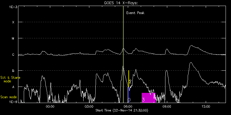 EIS Observation timeline overlay to GOES-Xray curve Code 1" 2" 40" 266" EIS Observations list for this event: STUDY ACRONYM ID DATE OBSERVED DESCRIPTION NOAA# TARGET 0 PRY_slot_contextLITE | 43859 | 2014/11/23 05:58:49 | alignment | | Active Region TIMELINE ID DATE OBSERVED FITS FILE XCEN (+W/-E) YCEN (+N/-S) DUR ----------------------------------------------------------------------------------------------------------------- 43859 | 2014/11/23 05:58:49.000 | eis_l0_20141123_055849.fits.gz | -34.26 | -0.35 | 2m57s 1 Alignment_266 | 43860 | 2014/11/23 06:02:04 | alignment | | Quiet Sun TIMELINE ID DATE OBSERVED FITS FILE XCEN (+W/-E) YCEN (+N/-S) DUR ----------------------------------------------------------------------------------------------------------------- 43860 | 2014/11/23 06:02:04.000 | eis_l0_20141123_060204.fits.gz | -151.78 | -0.50 | 1m22s 2 XRT_synop_AIA | 43861 | 2014/11/23 06:04:11 | alignment | | Quiet Sun TIMELINE ID DATE OBSERVED FITS FILE XCEN (+W/-E) YCEN (+N/-S) DUR ----------------------------------------------------------------------------------------------------------------- 43861 | 2014/11/23 06:04:11.000 | eis_l0_20141123_060411.fits.gz | -151.71 | -0.58 | 10s 3 HPW021_VEL_120x512v1 | 43877 | 2014/11/23 07:04:05 | Flare study | | Active Region TIMELINE ID DATE OBSERVED FITS FILE XCEN (+W/-E) YCEN (+N/-S) DUR ----------------------------------------------------------------------------------------------------------------- 43877 | 2014/11/23 07:04:05.000 | eis_l0_20141123_070405.fits.gz | 558.90 | -301.07 | 1h1m52s : Check study information : Download file : View thumbnails For this event, also check for: