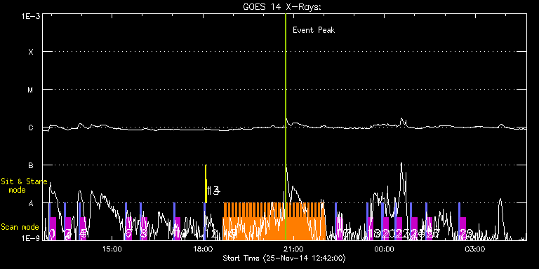 EIS Observation timeline overlay to GOES-Xray curve Code 1" 2" 40" 266" EIS Observations list for this event: STUDY ACRONYM ID DATE OBSERVED DESCRIPTION NOAA# TARGET 0 PRY_slot_context_v3 | 43924 | 2014/11/25 12:54:34 | HOP79 | 2216 | Active Region TIMELINE ID DATE OBSERVED FITS FILE XCEN (+W/-E) YCEN (+N/-S) DUR ----------------------------------------------------------------------------------------------------------------- 43924 | 2014/11/25 12:54:34.000 | eis_l0_20141125_125434.fits.gz | -46.38 | -324.47 | 2m57s 1 SK_DEEP_5x512_SLIT1 | 43925 | 2014/11/25 12:57:42 | HOP79 | | Quiet Sun TIMELINE ID DATE OBSERVED FITS FILE XCEN (+W/-E) YCEN (+N/-S) DUR ----------------------------------------------------------------------------------------------------------------- 43925 | 2014/11/25 12:57:42.000 | eis_l0_20141125_125742.fits.gz | -31.33 | -324.32 | 10m8s 2 PRY_slot_context_v3 | 43926 | 2014/11/25 13:24:34 | HOP79 | 2216 | Active Region TIMELINE ID DATE OBSERVED FITS FILE XCEN (+W/-E) YCEN (+N/-S) DUR ----------------------------------------------------------------------------------------------------------------- 43926 | 2014/11/25 13:24:34.000 | eis_l0_20141125_132434.fits.gz | -46.30 | -224.36 | 2m57s 3 SK_DEEP_5x512_SLIT1 | 43927 | 2014/11/25 13:27:42 | HOP79 | | Quiet Sun TIMELINE ID DATE OBSERVED FITS FILE XCEN (+W/-E) YCEN (+N/-S) DUR ----------------------------------------------------------------------------------------------------------------- 43927 | 2014/11/25 13:27:42.000 | eis_l0_20141125_132742.fits.gz | -31.33 | -224.28 | 10m8s 4 PRY_slot_context_v3 | 43928 | 2014/11/25 13:54:34 | HOP79 | 2216 | Active Region TIMELINE ID DATE OBSERVED FITS FILE XCEN (+W/-E) YCEN (+N/-S) DUR ----------------------------------------------------------------------------------------------------------------- 43928 | 2014/11/25 13:54:34.000 | eis_l0_20141125_135434.fits.gz | -46.30 | -124.25 | 2m57s 5 SK_DEEP_5x512_SLIT1 | 43929 | 2014/11/25 13:57:42 | HOP79 | | Quiet Sun TIMELINE ID DATE OBSERVED FITS FILE XCEN (+W/-E) YCEN (+N/-S) DUR ----------------------------------------------------------------------------------------------------------------- 43929 | 2014/11/25 13:57:42.000 | eis_l0_20141125_135742.fits.gz | -31.25 | -124.40 | 10m8s 6 PRY_slot_context_v3 | 43932 | 2014/11/25 15:25:34 | HOP79 | | Active Region TIMELINE ID DATE OBSERVED FITS FILE XCEN (+W/-E) YCEN (+N/-S) DUR ----------------------------------------------------------------------------------------------------------------- 43932 | 2014/11/25 15:25:34.000 | eis_l0_20141125_152534.fits.gz | -46.30 | 65.39 | 2m57s 7 SK_DEEP_5x512_SLIT1 | 43933 | 2014/11/25 15:28:42 | HOP79 | | Quiet Sun TIMELINE ID DATE OBSERVED FITS FILE XCEN (+W/-E) YCEN (+N/-S) DUR ----------------------------------------------------------------------------------------------------------------- 43933 | 2014/11/25 15:28:42.000 | eis_l0_20141125_152842.fits.gz | -31.40 | 65.47 | 10m8s 8 PRY_slot_context_v3 | 43961 | 2014/11/25 15:55:34 | HOP79 | | Active Region TIMELINE ID DATE OBSERVED FITS FILE XCEN (+W/-E) YCEN (+N/-S) DUR ----------------------------------------------------------------------------------------------------------------- 43961 | 2014/11/25 15:55:34.000 | eis_l0_20141125_155534.fits.gz | -46.30 | 165.59 | 2m57s 9 SK_DEEP_5x512_SLIT1 | 43962 | 2014/11/25 15:58:42 | HOP79 | | Quiet Sun TIMELINE ID DATE OBSERVED FITS FILE XCEN (+W/-E) YCEN (+N/-S) DUR ----------------------------------------------------------------------------------------------------------------- 43962 | 2014/11/25 15:58:42.000 | eis_l0_20141125_155842.fits.gz | -31.33 | 165.51 | 10m8s 10 PRY_slot_context_v3 | 43936 | 2014/11/25 17:02:04 | HOP79 | | Active Region TIMELINE ID DATE OBSERVED FITS FILE XCEN (+W/-E) YCEN (+N/-S) DUR ----------------------------------------------------------------------------------------------------------------- 43936 | 2014/11/25 17:02:04.000 | eis_l0_20141125_170204.fits.gz | 1.90 | 265.47 | 2m57s 11 SK_DEEP_5x512_SLIT1 | 43937 | 2014/11/25 17:05:12 | HOP79 | | Quiet Sun TIMELINE ID DATE OBSERVED FITS FILE XCEN (+W/-E) YCEN (+N/-S) DUR ----------------------------------------------------------------------------------------------------------------- 43937 | 2014/11/25 17:05:12.000 | eis_l0_20141125_170512.fits.gz | 16.80 | 265.54 | 10m8s 12 PRY_slot_contextLITE | 43903 | 2014/11/25 18:02:04 | alignment | | Active Region TIMELINE ID DATE OBSERVED FITS FILE XCEN (+W/-E) YCEN (+N/-S) DUR ----------------------------------------------------------------------------------------------------------------- 43903 | 2014/11/25 18:02:04.000 | eis_l0_20141125_180204.fits.gz | -34.43 | 0.58 | 2m56s 13 Alignment_266 | 43904 | 2014/11/25 18:05:19 | alignment | | Quiet Sun TIMELINE ID DATE OBSERVED FITS FILE XCEN (+W/-E) YCEN (+N/-S) DUR ----------------------------------------------------------------------------------------------------------------- 43904 | 2014/11/25 18:05:19.000 | eis_l0_20141125_180519.fits.gz | -151.71 | 0.58 | 1m22s 14 XRT_synop_AIA | 43905 | 2014/11/25 18:07:53 | alignment | | Quiet Sun TIMELINE ID DATE OBSERVED FITS FILE XCEN (+W/-E) YCEN (+N/-S) DUR ----------------------------------------------------------------------------------------------------------------- 43905 | 2014/11/25 18:07:53.000 | eis_l0_20141125_180753.fits.gz | -151.78 | 0.50 | 10s 15 HH_Flare_raster_v6 | 43963 | 2014/11/25 18:39:20 | Flare study | | Flare TIMELINE ID DATE OBSERVED FITS FILE XCEN (+W/-E) YCEN (+N/-S) DUR ----------------------------------------------------------------------------------------------------------------- 43963 | 2014/11/25 18:39:20.000 | eis_l0_20141125_183920.fits.gz | -112.21 | -259.98 | 3m32s 43963 | 2014/11/25 18:42:55.000 | eis_l0_20141125_184255.fits.gz | -111.60 | -260.13 | 3m31s 43963 | 2014/11/25 18:46:29.000 | eis_l0_20141125_184629.fits.gz | -111.13 | -260.13 | 3m31s 43963 | 2014/11/25 18:50:03.000 | eis_l0_20141125_185003.fits.gz | -110.51 | -26