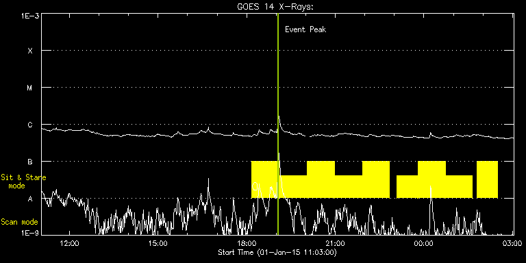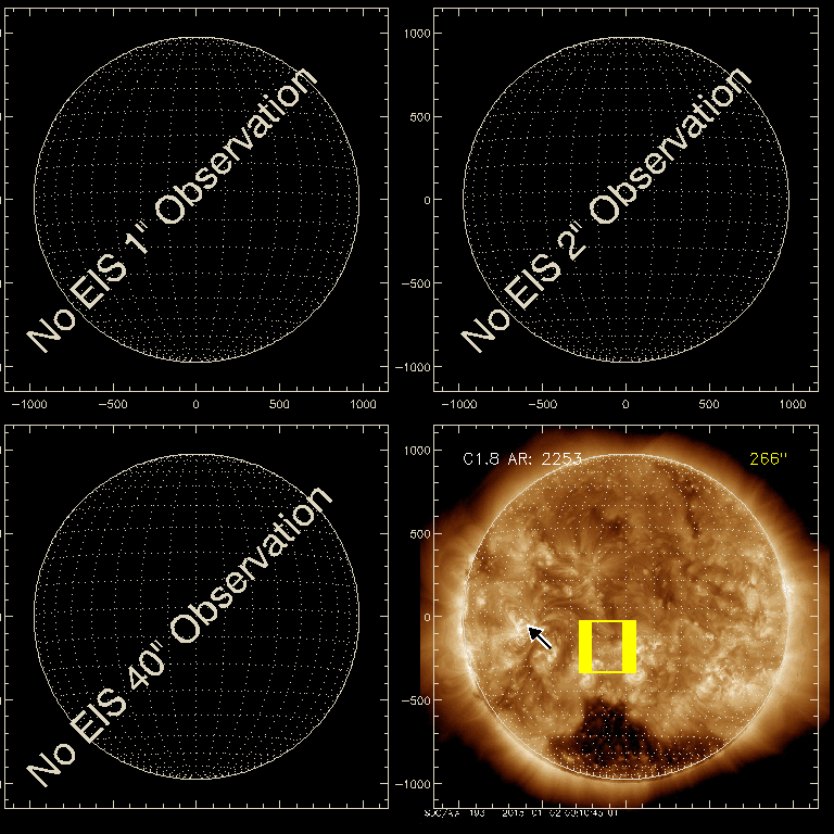 EIS Observation timeline overlay to GOES-Xray curve Code 1" 2" 40" 266" EIS Observations list for this event: STUDY ACRONYM ID DATE OBSERVED DESCRIPTION NOAA# TARGET 0 Flare266_Hunter03 | 44540 | 2015/01/01 18:10:13 | Flare study | 2251 | Flare TIMELINE ID DATE OBSERVED FITS FILE XCEN (+W/-E) YCEN (+N/-S) DUR ----------------------------------------------------------------------------------------------------------------- 44540 | 2015/01/01 18:10:13.000 | eis_l0_20150101_181013.fits.gz | -143.55 | -183.75 | 55m50s 44540 | 2015/01/01 19:06:29.000 | eis_l0_20150101_190629.fits.gz | -135.06 | -183.44 | 55m49s 44540 | 2015/01/01 20:02:45.000 | eis_l0_20150101_200245.fits.gz | -126.41 | -183.59 | 55m49s 44540 | 2015/01/01 20:59:00.000 | eis_l0_20150101_205900.fits.gz | -117.75 | -183.36 | 55m49s 44540 | 2015/01/01 21:55:16.000 | eis_l0_20150101_215516.fits.gz | -109.26 | -183.36 | 54m46s 44540 | 2015/01/01 23:05:43.000 | eis_l0_20150101_230543.fits.gz | -98.52 | -183.13 | 41m38s 44540 | 2015/01/01 23:47:47.000 | eis_l0_20150101_234747.fits.gz | -92.26 | -183.36 | 55m49s 44540 | 2015/01/02 00:44:03.000 | eis_l0_20150102_004403.fits.gz | -83.53 | -183.21 | 54m15s 44540 | 2015/01/02 01:47:40.000 | eis_l0_20150102_014740.fits.gz | -73.95 | -183.21 | 41m38s : Check study information : Download file : View thumbnails For this event, also check for: