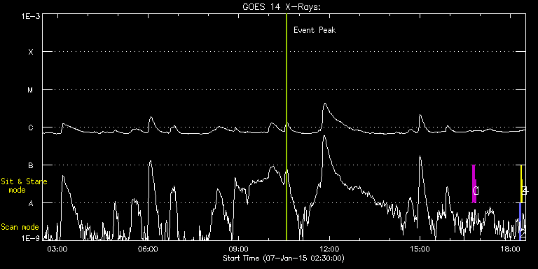 EIS Observation timeline overlay to GOES-Xray curve Code 1" 2" 40" 266" EIS Observations list for this event: STUDY ACRONYM ID DATE OBSERVED DESCRIPTION NOAA# TARGET 0 regcal071 | 44553 | 2015/01/07 16:44:41 | Dark exposures, CCD bottom rows (100s | | Engineering TIMELINE ID DATE OBSERVED FITS FILE XCEN (+W/-E) YCEN (+N/-S) DUR ----------------------------------------------------------------------------------------------------------------- 44553 | 2015/01/07 16:44:41.000 | eis_l0_20150107_164441.fits.gz | 594.02 | -373.86 | 3m22s 1 regcal072 | 44554 | 2015/01/07 16:48:30 | Dark exposures, top CCD rows (100s exp | | Engineering TIMELINE ID DATE OBSERVED FITS FILE XCEN (+W/-E) YCEN (+N/-S) DUR ----------------------------------------------------------------------------------------------------------------- 44554 | 2015/01/07 16:48:30.000 | eis_l0_20150107_164830.fits.gz | 594.49 | 136.98 | 3m22s 2 PRY_slot_contextLITE | 44545 | 2015/01/07 18:17:26 | alignment | 2255 | Active Region TIMELINE ID DATE OBSERVED FITS FILE XCEN (+W/-E) YCEN (+N/-S) DUR ----------------------------------------------------------------------------------------------------------------- 44545 | 2015/01/07 18:17:26.000 | eis_l0_20150107_181726.fits.gz | -34.59 | 2.65 | 2m57s 3 Alignment_266 | 44546 | 2015/01/07 18:20:41 | alignment | 2255 | Quiet Sun TIMELINE ID DATE OBSERVED FITS FILE XCEN (+W/-E) YCEN (+N/-S) DUR ----------------------------------------------------------------------------------------------------------------- 44546 | 2015/01/07 18:20:41.000 | eis_l0_20150107_182041.fits.gz | -151.71 | 3.50 | 1m22s 4 XRT_synop_AIA | 44547 | 2015/01/07 18:23:16 | alignment | 2255 | Quiet Sun TIMELINE ID DATE OBSERVED FITS FILE XCEN (+W/-E) YCEN (+N/-S) DUR ----------------------------------------------------------------------------------------------------------------- 44547 | 2015/01/07 18:23:16.000 | eis_l0_20150107_182316.fits.gz | -152.03 | 2.58 | 10s : Check study information : Download file : View thumbnails For this event, also check for: