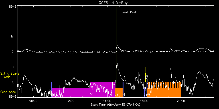 EIS Observation timeline overlay to GOES-Xray curve Code 1" 2" 40" 266" EIS Observations list for this event: STUDY ACRONYM ID DATE OBSERVED DESCRIPTION NOAA# TARGET 0 PRY_slot_context_v3 | 44555 | 2015/01/08 10:26:27 | Large map of ARs 12255 and 12257 | 2255 | Active Region TIMELINE ID DATE OBSERVED FITS FILE XCEN (+W/-E) YCEN (+N/-S) DUR ----------------------------------------------------------------------------------------------------------------- 44555 | 2015/01/08 10:26:27.000 | eis_l0_20150108_102627.fits.gz | 89.52 | 35.13 | 2m57s 1 HPW021VEL360x512v1_b | 44578 | 2015/01/08 10:29:35 | Large map of ARs 12255 and 12257 | 2255 | Active Region TIMELINE ID DATE OBSERVED FITS FILE XCEN (+W/-E) YCEN (+N/-S) DUR ----------------------------------------------------------------------------------------------------------------- 44578 | 2015/01/08 10:29:35.000 | eis_l0_20150108_102935.fits.gz | 112.77 | 56.06 | 3h5m42s 2 HPW021VEL240x512v1_b | 44579 | 2015/01/08 13:35:49 | Map of large fan loop of AR 12257 | 2257 | Active Region TIMELINE ID DATE OBSERVED FITS FILE XCEN (+W/-E) YCEN (+N/-S) DUR ----------------------------------------------------------------------------------------------------------------- 44579 | 2015/01/08 13:35:49.000 | eis_l0_20150108_133549.fits.gz | 68.26 | 253.21 | 2h3m49s 3 EL_FULL_CCD_RASTER | 44582 | 2015/01/08 15:39:56 | Deep exposure of large fan loop (full | | Active Region TIMELINE ID DATE OBSERVED FITS FILE XCEN (+W/-E) YCEN (+N/-S) DUR ----------------------------------------------------------------------------------------------------------------- 44582 | 2015/01/08 15:39:56.000 | eis_l0_20150108_153956.fits.gz | 94.73 | 355.90 | 35m12s 4 PRY_slot_context_v3 | 44583 | 2015/01/08 16:15:35 | Context raster for AR 12257 | 2257 | Active Region TIMELINE ID DATE OBSERVED FITS FILE XCEN (+W/-E) YCEN (+N/-S) DUR ----------------------------------------------------------------------------------------------------------------- 44583 | 2015/01/08 16:15:35.000 | eis_l0_20150108_161535.fits.gz | 116.08 | 152.98 | 2m56s 5 PRY_slot_contextLITE | 44560 | 2015/01/08 18:00:41 | alignment | 2255 | Active Region TIMELINE ID DATE OBSERVED FITS FILE XCEN (+W/-E) YCEN (+N/-S) DUR ----------------------------------------------------------------------------------------------------------------- 44560 | 2015/01/08 18:00:41.000 | eis_l0_20150108_180041.fits.gz | -34.43 | 2.65 | 2m56s 6 Alignment_266 | 44561 | 2015/01/08 18:03:56 | alignment | | Quiet Sun TIMELINE ID DATE OBSERVED FITS FILE XCEN (+W/-E) YCEN (+N/-S) DUR ----------------------------------------------------------------------------------------------------------------- 44561 | 2015/01/08 18:03:56.000 | eis_l0_20150108_180356.fits.gz | -151.78 | 3.50 | 1m22s 7 XRT_synop_AIA | 44562 | 2015/01/08 18:06:30 | alignment | | Quiet Sun TIMELINE ID DATE OBSERVED FITS FILE XCEN (+W/-E) YCEN (+N/-S) DUR ----------------------------------------------------------------------------------------------------------------- 44562 | 2015/01/08 18:06:30.000 | eis_l0_20150108_180630.fits.gz | -151.96 | 2.50 | 10s 8 PRY_slot_context_v3 | 44574 | 2015/01/08 18:12:27 | HOP 268 - transition region and corona | 2257 | Active Region TIMELINE ID DATE OBSERVED FITS FILE XCEN (+W/-E) YCEN (+N/-S) DUR ----------------------------------------------------------------------------------------------------------------- 44574 | 2015/01/08 18:12:27.000 | eis_l0_20150108_181227.fits.gz | 152.96 | 150.06 | 2m56s 9 Cor_Hole_Jet_v1 | 44575 | 2015/01/08 18:15:48 | HOP 268 - transition region and corona | | Quiet Sun TIMELINE ID DATE OBSERVED FITS FILE XCEN (+W/-E) YCEN (+N/-S) DUR ----------------------------------------------------------------------------------------------------------------- 44575 | 2015/01/08 18:15:48.000 | eis_l0_20150108_181548.fits.gz | 149.69 | 171.06 | 5m47s 44575 | 2015/01/08 18:21:38.000 | eis_l0_20150108_182138.fits.gz | 150.62 | 170.98 | 5m47s 44575 | 2015/01/08 18:27:28.000 | eis_l0_20150108_182728.fits.gz | 151.46 | 171.06 | 5m47s 44575 | 2015/01/08 18:33:18.000 | eis_l0_20150108_183318.fits.gz | 152.31 | 171.06 | 5m46s 44575 | 2015/01/08 18:39:07.000 | eis_l0_20150108_183907.fits.gz | 153.40 | 170.98 | 5m47s 44575 | 2015/01/08 18:44:57.000 | eis_l0_20150108_184457.fits.gz | 154.17 | 170.90 | 5m47s 44575 | 2015/01/08 18:50:47.000 | eis_l0_20150108_185047.fits.gz | 155.10 | 170.98 | 5m47s 44575 | 2015/01/08 18:56:36.000 | eis_l0_20150108_185636.fits.gz | 156.02 | 170.82 | 5m47s 44575 | 2015/01/08 19:02:26.000 | eis_l0_20150108_190226.fits.gz | 156.87 | 170.90 | 5m47s 44575 | 2015/01/08 19:08:15.000 | eis_l0_20150108_190815.fits.gz | 157.80 | 170.90 | 5m47s 44575 | 2015/01/08 19:14:05.000 | eis_l0_20150108_191405.fits.gz | 158.65 | 170.90 | 5m47s 44575 | 2015/01/08 19:19:55.000 | eis_l0_20150108_191955.fits.gz | 159.65 | 170.98 | 5m46s 44575 | 2015/01/08 19:25:44.000 | eis_l0_20150108_192544.fits.gz | 160.50 | 170.98 | 5m47s 44575 | 2015/01/08 19:31:34.000 | eis_l0_20150108_193134.fits.gz | 161.43 | 170.98 | 5m46s 44575 | 2015/01/08 19:37:23.000 | eis_l0_20150108_193723.fits.gz | 162.36 | 170.90 | 5m47s 44575 | 2015/01/08 19:43:13.000 | eis_l0_20150108_194313.fits.gz | 163.21 | 170.98 | 5m46s 44575 | 2015/01/08 19:49:02.000 | eis_l0_20150108_194902.fits.gz | 164.13 | 171.06 | 5m47s 44575 | 2015/01/08 19:54:52.000 | eis_l0_20150108_195452.fits.gz | 165.06 | 170.98 | 5m46s 44575 | 2015/01/08 20:00:41.000 | eis_l0_20150108_200041.fits.gz | 165.91 | 170.90 | 5m47s 44575 | 2015/01/08 20:06:31.000 | eis_l0_20150108_200631.fits.gz | 166.84 | 170.98 | 5m47s 44575 | 2015/01/08 20:12:21.000 | eis_l0_20150108_201221.fits.gz | 167.76 | 170.98 | 5m46s 44575 | 2015/01/08 20:18:10.000 | eis_l0_20150108_201810.fits.gz | 168.77 | 170.82 | 5m47s 44575 | 2015/01/08 20:24:00.000 | eis_l0_20150108_202400.fits.gz | 169.54 | 170.90 | 5m47s 44575 | 2015/01/08 20:29:50.000 | eis_l0_20150108_202950.fits.gz | 170.47 | 170.98 | 5m47s 44575 | 2015/01/08 20:35:39.000 | eis_l