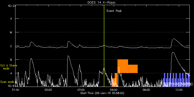EIS Observation timeline overlay to GOES-Xray curve Code 1" 2" 40" 266" EIS Observations list for this event: STUDY ACRONYM ID DATE OBSERVED DESCRIPTION NOAA# TARGET 0 PRY_slot_context_v3 | 44566 | 2015/01/10 05:48:20 | HOP 266 - small-scale reconnection in | | Active Region TIMELINE ID DATE OBSERVED FITS FILE XCEN (+W/-E) YCEN (+N/-S) DUR ----------------------------------------------------------------------------------------------------------------- 44566 | 2015/01/10 05:48:20.000 | eis_l0_20150110_054820.fits.gz | -20.06 | -35.28 | 2m56s 1 Cool_loop_resp_v2 | 44567 | 2015/01/10 05:51:42 | HOP 266 - small-scale reconnection in | | Active Region TIMELINE ID DATE OBSERVED FITS FILE XCEN (+W/-E) YCEN (+N/-S) DUR ----------------------------------------------------------------------------------------------------------------- 44567 | 2015/01/10 05:51:42.000 | eis_l0_20150110_055142.fits.gz | 10.60 | -13.43 | 14m47s 44567 | 2015/01/10 06:06:31.000 | eis_l0_20150110_060631.fits.gz | 12.76 | -13.36 | 14m47s 2 Cool_loop_stare | 44568 | 2015/01/10 06:21:23 | HOP 266 - small-scale reconnection in | | Quiet Sun TIMELINE ID DATE OBSERVED FITS FILE XCEN (+W/-E) YCEN (+N/-S) DUR ----------------------------------------------------------------------------------------------------------------- 44568 | 2015/01/10 06:21:23.000 | eis_l0_20150110_062123.fits.gz | 46.10 | -12.43 | 57m7s 44568 | 2015/01/10 07:18:33.000 | eis_l0_20150110_071833.fits.gz | 55.14 | -12.36 | 52m59s 3 full_sun_slot_scan_2 | 44584 | 2015/01/10 10:32:21 | HOP130 Multi-temperature Full Disk Slo | 2253 | Quiet Sun TIMELINE ID DATE OBSERVED FITS FILE XCEN (+W/-E) YCEN (+N/-S) DUR ----------------------------------------------------------------------------------------------------------------- 44584 | 2015/01/10 10:32:21.000 | eis_l0_20150110_103221.fits.gz | 901.58 | 3.58 | 5m26s 4 full_sun_slot_scan_2 | 44586 | 2015/01/10 10:37:53 | HOP130 Multi-temperature Full Disk Slo | 2253 | Quiet Sun TIMELINE ID DATE OBSERVED FITS FILE XCEN (+W/-E) YCEN (+N/-S) DUR ----------------------------------------------------------------------------------------------------------------- 44586 | 2015/01/10 10:37:53.000 | eis_l0_20150110_103753.fits.gz | 901.58 | 3.50 | 5m27s 5 full_sun_slot_scan_2 | 44591 | 2015/01/10 10:48:14 | HOP130 Multi-temperature Full Disk Slo | 2255 | Quiet Sun TIMELINE ID DATE OBSERVED FITS FILE XCEN (+W/-E) YCEN (+N/-S) DUR ----------------------------------------------------------------------------------------------------------------- 44591 | 2015/01/10 10:48:14.000 | eis_l0_20150110_104814.fits.gz | 433.46 | 3.42 | 5m27s 6 full_sun_slot_scan_2 | 44592 | 2015/01/10 10:53:46 | HOP130 Multi-temperature Full Disk Slo | 2255 | Quiet Sun TIMELINE ID DATE OBSERVED FITS FILE XCEN (+W/-E) YCEN (+N/-S) DUR ----------------------------------------------------------------------------------------------------------------- 44592 | 2015/01/10 10:53:46.000 | eis_l0_20150110_105346.fits.gz | 433.53 | 3.35 | 5m27s 7 full_sun_slot_scan_2 | 44593 | 2015/01/10 11:04:14 | HOP130 Multi-temperature Full Disk Slo | 2260 | Quiet Sun TIMELINE ID DATE OBSERVED FITS FILE XCEN (+W/-E) YCEN (+N/-S) DUR ----------------------------------------------------------------------------------------------------------------- 44593 | 2015/01/10 11:04:14.000 | eis_l0_20150110_110414.fits.gz | -34.51 | 3.50 | 5m27s 8 full_sun_slot_scan_2 | 44594 | 2015/01/10 11:09:46 | HOP130 Multi-temperature Full Disk Slo | 2260 | Quiet Sun TIMELINE ID DATE OBSERVED FITS FILE XCEN (+W/-E) YCEN (+N/-S) DUR ----------------------------------------------------------------------------------------------------------------- 44594 | 2015/01/10 11:09:46.000 | eis_l0_20150110_110946.fits.gz | -34.51 | 3.58 | 5m28s 9 full_sun_slot_scan_2 | 44595 | 2015/01/10 11:20:14 | HOP130 Multi-temperature Full Disk Slo | | Quiet Sun TIMELINE ID DATE OBSERVED FITS FILE XCEN (+W/-E) YCEN (+N/-S) DUR ----------------------------------------------------------------------------------------------------------------- 44595 | 2015/01/10 11:20:14.000 | eis_l0_20150110_112014.fits.gz | -502.48 | 3.58 | 5m27s 10 full_sun_slot_scan_2 | 44596 | 2015/01/10 11:25:46 | HOP130 Multi-temperature Full Disk Slo | | Quiet Sun TIMELINE ID DATE OBSERVED FITS FILE XCEN (+W/-E) YCEN (+N/-S) DUR ----------------------------------------------------------------------------------------------------------------- 44596 | 2015/01/10 11:25:46.000 | eis_l0_20150110_112546.fits.gz | -502.48 | 3.65 | 5m27s 11 full_sun_slot_scan_2 | 44597 | 2015/01/10 11:36:14 | HOP130 Multi-temperature Full Disk Slo | | Quiet Sun TIMELINE ID DATE OBSERVED FITS FILE XCEN (+W/-E) YCEN (+N/-S) DUR ----------------------------------------------------------------------------------------------------------------- 44597 | 2015/01/10 11:36:14.000 | eis_l0_20150110_113614.fits.gz | -9903.91 | -9959.20 | 5m27s 12 full_sun_slot_scan_2 | 44598 | 2015/01/10 11:41:46 | HOP130 Multi-temperature Full Disk Slo | | Quiet Sun TIMELINE ID DATE OBSERVED FITS FILE XCEN (+W/-E) YCEN (+N/-S) DUR ----------------------------------------------------------------------------------------------------------------- 44598 | 2015/01/10 11:41:46.000 | eis_l0_20150110_114146.fits.gz | -9903.91 | -9959.20 | 5m27s 13 full_sun_slot_scan_2 | 44587 | 2015/01/10 11:52:14 | HOP130 Multi-temperature Full Disk Slo | | Quiet Sun TIMELINE ID DATE OBSERVED FITS FILE XCEN (+W/-E) YCEN (+N/-S) DUR ----------------------------------------------------------------------------------------------------------------- 44587 | 2015/01/10 11:52:14.000 | eis_l0_20150110_115214.fits.gz | 715.49 | 473.63 | 5m27s 14 full_sun_slot_scan_2 | 44589 | 2015/01/10 12:02:14 | HOP130 Multi-temperature Full Disk Slo | | Quiet Sun TIMELINE ID DATE OBSERVED FITS FILE XCEN (+W/-E) YCEN (+N/-S) DUR ----------------------------------------------------------------------------------------------------------------- 44589 | 2015/01/10 12:02:14.000 | 