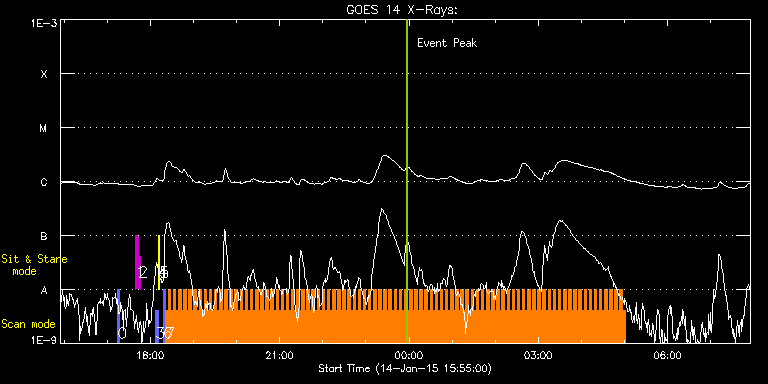 EIS Observation timeline overlay to GOES-Xray curve Code 1" 2" 40" 266" EIS Observations list for this event: STUDY ACRONYM ID DATE OBSERVED DESCRIPTION NOAA# TARGET 0 PRY_slot_context_v3 | 44657 | 2015/01/14 17:14:33 | HOP 274 - energy propagation from phot | 2259 | Active Region TIMELINE ID DATE OBSERVED FITS FILE XCEN (+W/-E) YCEN (+N/-S) DUR ----------------------------------------------------------------------------------------------------------------- 44657 | 2015/01/14 17:14:33.000 | eis_l0_20150114_171433.fits.gz | 32.60 | -182.57 | 2m56s 1 regcal071 | 44674 | 2015/01/14 17:39:41 | Dark exposures, CCD bottom rows (100s | | Engineering TIMELINE ID DATE OBSERVED FITS FILE XCEN (+W/-E) YCEN (+N/-S) DUR ----------------------------------------------------------------------------------------------------------------- 44674 | 2015/01/14 17:39:41.000 | eis_l0_20150114_173941.fits.gz | 66.27 | -487.42 | 3m22s 2 regcal072 | 44675 | 2015/01/14 17:43:30 | Dark exposures, top CCD rows (100s exp | | Engineering TIMELINE ID DATE OBSERVED FITS FILE XCEN (+W/-E) YCEN (+N/-S) DUR ----------------------------------------------------------------------------------------------------------------- 44675 | 2015/01/14 17:43:30.000 | eis_l0_20150114_174330.fits.gz | 66.73 | 23.35 | 3m22s 3 PRY_slot_contextLITE | 44681 | 2015/01/14 18:07:44 | alignment | 2259 | Active Region TIMELINE ID DATE OBSERVED FITS FILE XCEN (+W/-E) YCEN (+N/-S) DUR ----------------------------------------------------------------------------------------------------------------- 44681 | 2015/01/14 18:07:44.000 | eis_l0_20150114_180744.fits.gz | -15.29 | -0.35 | 2m56s 4 Alignment_266 | 44682 | 2015/01/14 18:10:58 | alignment | | Quiet Sun TIMELINE ID DATE OBSERVED FITS FILE XCEN (+W/-E) YCEN (+N/-S) DUR ----------------------------------------------------------------------------------------------------------------- 44682 | 2015/01/14 18:10:58.000 | eis_l0_20150114_181058.fits.gz | -132.49 | -0.50 | 1m22s 5 XRT_synop_AIA | 44683 | 2015/01/14 18:13:06 | alignment | | Quiet Sun TIMELINE ID DATE OBSERVED FITS FILE XCEN (+W/-E) YCEN (+N/-S) DUR ----------------------------------------------------------------------------------------------------------------- 44683 | 2015/01/14 18:13:06.000 | eis_l0_20150114_181306.fits.gz | -132.57 | -0.42 | 10s 6 PRY_slot_context_v3 | 44708 | 2015/01/14 18:17:57 | AR12259 observation | 2259 | Active Region TIMELINE ID DATE OBSERVED FITS FILE XCEN (+W/-E) YCEN (+N/-S) DUR ----------------------------------------------------------------------------------------------------------------- 44708 | 2015/01/14 18:17:57.000 | eis_l0_20150114_181757.fits.gz | 42.18 | -182.49 | 2m57s 7 HH_Flare_raster_v6 | 44709 | 2015/01/14 18:21:19 | AR12259 observation | 2259 | Flare TIMELINE ID DATE OBSERVED FITS FILE XCEN (+W/-E) YCEN (+N/-S) DUR ----------------------------------------------------------------------------------------------------------------- 44709 | 2015/01/14 18:21:19.000 | eis_l0_20150114_182119.fits.gz | 37.74 | -178.57 | 3m31s 44709 | 2015/01/14 18:24:53.000 | eis_l0_20150114_182453.fits.gz | 38.21 | -178.57 | 3m32s 44709 | 2015/01/14 18:28:28.000 | eis_l0_20150114_182828.fits.gz | 38.83 | -178.65 | 3m31s 44709 | 2015/01/14 18:32:02.000 | eis_l0_20150114_183202.fits.gz | 39.37 | -178.49 | 3m32s 44709 | 2015/01/14 18:35:37.000 | eis_l0_20150114_183537.fits.gz | 39.83 | -178.42 | 3m30s 44709 | 2015/01/14 18:39:10.000 | eis_l0_20150114_183910.fits.gz | 40.45 | -178.49 | 3m31s 44709 | 2015/01/14 18:42:44.000 | eis_l0_20150114_184244.fits.gz | 40.91 | -178.42 | 3m32s 44709 | 2015/01/14 18:46:19.000 | eis_l0_20150114_184619.fits.gz | 41.45 | -178.57 | 3m32s 44709 | 2015/01/14 18:49:54.000 | eis_l0_20150114_184954.fits.gz | 41.99 | -178.34 | 3m31s 44709 | 2015/01/14 18:53:28.000 | eis_l0_20150114_185328.fits.gz | 42.61 | -178.49 | 3m31s 44709 | 2015/01/14 18:57:01.000 | eis_l0_20150114_185701.fits.gz | 43.07 | -178.42 | 3m32s 44709 | 2015/01/14 19:00:36.000 | eis_l0_20150114_190036.fits.gz | 43.69 | -178.49 | 3m31s 44709 | 2015/01/14 19:04:10.000 | eis_l0_20150114_190410.fits.gz | 44.08 | -178.34 | 3m31s 44709 | 2015/01/14 19:07:43.000 | eis_l0_20150114_190743.fits.gz | 44.70 | -178.65 | 3m33s 44709 | 2015/01/14 19:11:18.000 | eis_l0_20150114_191118.fits.gz | 45.24 | -178.34 | 3m31s 44709 | 2015/01/14 19:14:52.000 | eis_l0_20150114_191452.fits.gz | 45.78 | -178.49 | 3m31s 44709 | 2015/01/14 19:18:26.000 | eis_l0_20150114_191826.fits.gz | 46.32 | -178.73 | 3m32s 44709 | 2015/01/14 19:22:01.000 | eis_l0_20150114_192201.fits.gz | 46.86 | -178.49 | 3m31s 44709 | 2015/01/14 19:25:35.000 | eis_l0_20150114_192535.fits.gz | 47.40 | -178.57 | 3m32s 44709 | 2015/01/14 19:29:10.000 | eis_l0_20150114_192910.fits.gz | 47.94 | -178.57 | 3m31s 44709 | 2015/01/14 19:32:44.000 | eis_l0_20150114_193244.fits.gz | 48.48 | -178.57 | 3m31s 44709 | 2015/01/14 19:36:18.000 | eis_l0_20150114_193618.fits.gz | 49.10 | -178.65 | 3m31s 44709 | 2015/01/14 19:39:52.000 | eis_l0_20150114_193952.fits.gz | 49.56 | -178.57 | 3m31s 44709 | 2015/01/14 19:43:26.000 | eis_l0_20150114_194326.fits.gz | 50.03 | -178.42 | 3m32s 44709 | 2015/01/14 19:47:01.000 | eis_l0_20150114_194701.fits.gz | 50.64 | -178.57 | 3m31s 44709 | 2015/01/14 19:50:35.000 | eis_l0_20150114_195035.fits.gz | 51.11 | -178.57 | 3m31s 44709 | 2015/01/14 19:54:09.000 | eis_l0_20150114_195409.fits.gz | 51.73 | -178.49 | 3m31s 44709 | 2015/01/14 19:57:43.000 | eis_l0_20150114_195743.fits.gz | 52.27 | -178.49 | 3m32s 44709 | 2015/01/14 20:01:18.000 | eis_l0_20150114_200118.fits.gz | 52.73 | -178.57 | 3m31s 44709 | 2015/01/14 20:04:51.000 | eis_l0_20150114_200451.fits.gz | 53.35 | -178.57 | 3m32s 44709 | 2015/01/14 20:08:26.000 | eis_l0_20150114_200826.fits.gz | 53.81 | -178.34 | 3m32s 44709 | 2015/01/14 20:12:00.000 | eis_l0_20150114_201200.fits.gz | 54.43 | -178.42 | 3m32s 44709 | 2015/01/14 20:15:35.000 | eis_l0_20150114_201535.fits.gz | 54.97 | -178.34 | 3m31s 44709 | 2015/01/14 20:19:09.0
