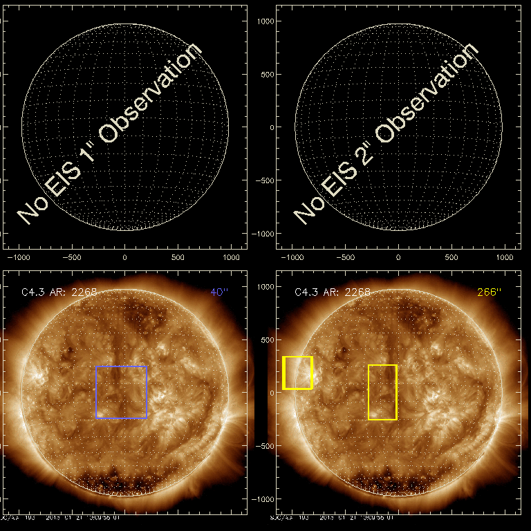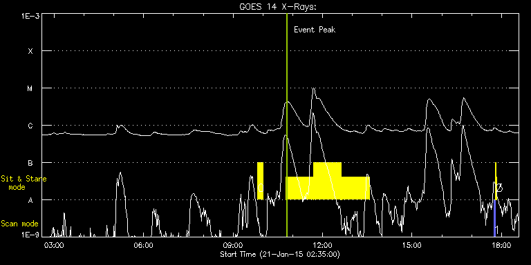 EIS Observation timeline overlay to GOES-Xray curve Code 1" 2" 40" 266" EIS Observations list for this event: STUDY ACRONYM ID DATE OBSERVED DESCRIPTION NOAA# TARGET 0 Flare266_Hunter03 | 44796 | 2015/01/21 09:49:34 | Flare study | | Flare TIMELINE ID DATE OBSERVED FITS FILE XCEN (+W/-E) YCEN (+N/-S) DUR ----------------------------------------------------------------------------------------------------------------- 44796 | 2015/01/21 09:49:34.000 | eis_l0_20150121_094934.fits.gz | -952.43 | 183.27 | 10m4s 44796 | 2015/01/21 10:45:50.000 | eis_l0_20150121_104550.fits.gz | -947.41 | 183.73 | 55m49s 44796 | 2015/01/21 11:42:06.000 | eis_l0_20150121_114206.fits.gz | -942.47 | 184.27 | 55m49s 44796 | 2015/01/21 12:38:21.000 | eis_l0_20150121_123821.fits.gz | -937.37 | 184.97 | 55m50s 1 PRY_slot_contextLITE | 44763 | 2015/01/21 17:44:28 | alignment | | Active Region TIMELINE ID DATE OBSERVED FITS FILE XCEN (+W/-E) YCEN (+N/-S) DUR ----------------------------------------------------------------------------------------------------------------- 44763 | 2015/01/21 17:44:28.000 | eis_l0_20150121_174428.fits.gz | -31.86 | 0.58 | 2m56s 2 Alignment_266 | 44764 | 2015/01/21 17:47:42 | alignment | | Quiet Sun TIMELINE ID DATE OBSERVED FITS FILE XCEN (+W/-E) YCEN (+N/-S) DUR ----------------------------------------------------------------------------------------------------------------- 44764 | 2015/01/21 17:47:42.000 | eis_l0_20150121_174742.fits.gz | -149.29 | 0.58 | 1m22s 3 XRT_synop_AIA | 44765 | 2015/01/21 17:49:49 | alignment | | Quiet Sun TIMELINE ID DATE OBSERVED FITS FILE XCEN (+W/-E) YCEN (+N/-S) DUR ----------------------------------------------------------------------------------------------------------------- 44765 | 2015/01/21 17:49:49.000 | eis_l0_20150121_174949.fits.gz | -149.21 | 0.42 | 11s : Check study information : Download file : View thumbnails For this event, also check for: