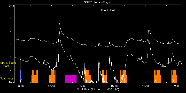 EIS Observation timeline overlay to GOES-Xray curve Code 1" 2" 40" 266" EIS Observations list for this event: STUDY ACRONYM ID DATE OBSERVED DESCRIPTION NOAA# TARGET 0 PRY_slot_contextLITE | 47061 | 2015/06/21 05:59:20 | XRT synoptic | 2371 | Active Region TIMELINE ID DATE OBSERVED FITS FILE XCEN (+W/-E) YCEN (+N/-S) DUR ----------------------------------------------------------------------------------------------------------------- 47061 | 2015/06/21 05:59:20.000 | eis_l0_20150621_055920.fits.gz | -15.29 | -0.50 | 2m56s 1 XRT_synop_AIA | 47062 | 2015/06/21 06:03:26 | XRT synoptic | 2371 | Quiet Sun TIMELINE ID DATE OBSERVED FITS FILE XCEN (+W/-E) YCEN (+N/-S) DUR ----------------------------------------------------------------------------------------------------------------- 47062 | 2015/06/21 06:03:26.000 | eis_l0_20150621_060326.fits.gz | -132.57 | -0.42 | 10s 2 HH_Flare_raster_v6 | 47135 | 2015/06/21 07:05:20 | AR 12371 obs. | 2371 | Flare TIMELINE ID DATE OBSERVED FITS FILE XCEN (+W/-E) YCEN (+N/-S) DUR ----------------------------------------------------------------------------------------------------------------- 47135 | 2015/06/21 07:05:20.000 | eis_l0_20150621_070520.fits.gz | -212.39 | 179.05 | 3m31s 47135 | 2015/06/21 07:08:54.000 | eis_l0_20150621_070854.fits.gz | -211.85 | 179.05 | 3m31s 47135 | 2015/06/21 07:12:28.000 | eis_l0_20150621_071228.fits.gz | -211.31 | 179.05 | 3m32s 47135 | 2015/06/21 07:16:02.000 | eis_l0_20150621_071602.fits.gz | -210.77 | 179.13 | 3m32s 47135 | 2015/06/21 07:19:37.000 | eis_l0_20150621_071937.fits.gz | -210.30 | 178.97 | 3m31s 47135 | 2015/06/21 07:23:10.000 | eis_l0_20150621_072310.fits.gz | -209.76 | 179.13 | 3m32s 47135 | 2015/06/21 07:26:45.000 | eis_l0_20150621_072645.fits.gz | -209.22 | 178.97 | 3m31s 47135 | 2015/06/21 07:30:19.000 | eis_l0_20150621_073019.fits.gz | -208.76 | 178.89 | 3m32s 47135 | 2015/06/21 07:33:53.000 | eis_l0_20150621_073353.fits.gz | -208.29 | 178.97 | 3m31s 47135 | 2015/06/21 07:37:27.000 | eis_l0_20150621_073727.fits.gz | -207.68 | 178.97 | 3m31s 3 HH_Flare_raster_v6 | 47124 | 2015/06/21 08:45:40 | AR 12371 obs. | 2371 | Flare TIMELINE ID DATE OBSERVED FITS FILE XCEN (+W/-E) YCEN (+N/-S) DUR ----------------------------------------------------------------------------------------------------------------- 47124 | 2015/06/21 08:45:40.000 | eis_l0_20150621_084540.fits.gz | -203.30 | 191.82 | 3m32s 47124 | 2015/06/21 08:49:15.000 | eis_l0_20150621_084915.fits.gz | -202.76 | 191.82 | 3m31s 47124 | 2015/06/21 08:52:49.000 | eis_l0_20150621_085249.fits.gz | -202.29 | 191.82 | 3m32s 47124 | 2015/06/21 08:56:23.000 | eis_l0_20150621_085623.fits.gz | -201.83 | 191.82 | 3m32s 47124 | 2015/06/21 08:59:58.000 | eis_l0_20150621_085958.fits.gz | -201.21 | 191.74 | 3m31s 47124 | 2015/06/21 09:03:31.000 | eis_l0_20150621_090331.fits.gz | -200.67 | 191.66 | 3m31s 47124 | 2015/06/21 09:07:05.000 | eis_l0_20150621_090705.fits.gz | -200.21 | 191.74 | 3m32s 47124 | 2015/06/21 09:10:40.000 | eis_l0_20150621_091040.fits.gz | -199.67 | 191.74 | 3m31s 47124 | 2015/06/21 09:14:14.000 | eis_l0_20150621_091414.fits.gz | -199.20 | 191.74 | 3m32s 47124 | 2015/06/21 09:17:49.000 | eis_l0_20150621_091749.fits.gz | -198.66 | 191.74 | 3m31s 4 HPW021_VEL_120x512v1 | 47121 | 2015/06/21 10:20:27 | AR 12371 obs. | | Active Region TIMELINE ID DATE OBSERVED FITS FILE XCEN (+W/-E) YCEN (+N/-S) DUR ----------------------------------------------------------------------------------------------------------------- 47121 | 2015/06/21 10:20:27.000 | eis_l0_20150621_102027.fits.gz | -157.46 | 60.66 | 1h1m52s 5 HH_Flare_raster_v6 | 47131 | 2015/06/21 12:10:26 | AR 12371 obs. | 2371 | Flare TIMELINE ID DATE OBSERVED FITS FILE XCEN (+W/-E) YCEN (+N/-S) DUR ----------------------------------------------------------------------------------------------------------------- 47131 | 2015/06/21 12:10:26.000 | eis_l0_20150621_121026.fits.gz | -208.54 | 146.35 | 3m32s 47131 | 2015/06/21 12:14:01.000 | eis_l0_20150621_121401.fits.gz | -208.07 | 146.35 | 3m31s 47131 | 2015/06/21 12:17:35.000 | eis_l0_20150621_121735.fits.gz | -207.46 | 146.43 | 3m31s 47131 | 2015/06/21 12:21:09.000 | eis_l0_20150621_122109.fits.gz | -206.84 | 146.28 | 3m31s 47131 | 2015/06/21 12:24:43.000 | eis_l0_20150621_122443.fits.gz | -206.45 | 146.28 | 3m31s 47131 | 2015/06/21 12:28:16.000 | eis_l0_20150621_122816.fits.gz | -205.91 | 146.28 | 3m32s 47131 | 2015/06/21 12:31:51.000 | eis_l0_20150621_123151.fits.gz | -205.37 | 146.28 | 3m31s 47131 | 2015/06/21 12:35:25.000 | eis_l0_20150621_123525.fits.gz | -204.83 | 146.35 | 3m32s 47131 | 2015/06/21 12:39:00.000 | eis_l0_20150621_123900.fits.gz | -204.29 | 146.28 | 3m32s 47131 | 2015/06/21 12:42:34.000 | eis_l0_20150621_124234.fits.gz | -203.75 | 146.43 | 3m31s 6 HH_Flare_raster_v6 | 47147 | 2015/06/21 13:50:40 | AR 12371 obs. | | Flare TIMELINE ID DATE OBSERVED FITS FILE XCEN (+W/-E) YCEN (+N/-S) DUR ----------------------------------------------------------------------------------------------------------------- 47147 | 2015/06/21 13:50:40.000 | eis_l0_20150621_135040.fits.gz | -192.38 | 155.20 | 3m32s 47147 | 2015/06/21 13:54:14.000 | eis_l0_20150621_135414.fits.gz | -191.84 | 155.20 | 3m32s 47147 | 2015/06/21 13:57:49.000 | eis_l0_20150621_135749.fits.gz | -191.30 | 155.04 | 3m32s 47147 | 2015/06/21 14:01:23.000 | eis_l0_20150621_140123.fits.gz | -190.76 | 155.20 | 3m32s 47147 | 2015/06/21 14:04:58.000 | eis_l0_20150621_140458.fits.gz | -190.29 | 155.20 | 3m31s 47147 | 2015/06/21 14:08:32.000 | eis_l0_20150621_140832.fits.gz | -189.83 | 155.20 | 3m31s 47147 | 2015/06/21 14:12:06.000 | eis_l0_20150621_141206.fits.gz | -189.21 | 155.12 | 3m32s 47147 | 2015/06/21 14:15:41.000 | eis_l0_20150621_141541.fits.gz | -188.75 | 155.12 | 3m32s 7 HH_Flare_raster_v6 | 47132 | 2015/06/21 15:35:40 | AR 12371 obs. | | Flare TIMELINE ID DATE OBSERVED FITS FILE XCEN (+W/-E) YCEN (+N/-S) DUR ----------------------------------------------------------------------------------
