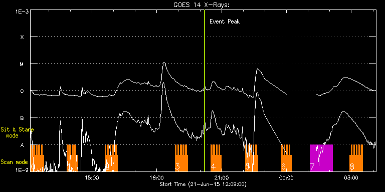EIS Observation timeline overlay to GOES-Xray curve Code 1" 2" 40" 266" EIS Observations list for this event: STUDY ACRONYM ID DATE OBSERVED DESCRIPTION NOAA# TARGET 0 HH_Flare_raster_v6 | 47131 | 2015/06/21 12:10:26 | AR 12371 obs. | 2371 | Flare TIMELINE ID DATE OBSERVED FITS FILE XCEN (+W/-E) YCEN (+N/-S) DUR ----------------------------------------------------------------------------------------------------------------- 47131 | 2015/06/21 12:10:26.000 | eis_l0_20150621_121026.fits.gz | -208.54 | 146.35 | 3m32s 47131 | 2015/06/21 12:14:01.000 | eis_l0_20150621_121401.fits.gz | -208.07 | 146.35 | 3m31s 47131 | 2015/06/21 12:17:35.000 | eis_l0_20150621_121735.fits.gz | -207.46 | 146.43 | 3m31s 47131 | 2015/06/21 12:21:09.000 | eis_l0_20150621_122109.fits.gz | -206.84 | 146.28 | 3m31s 47131 | 2015/06/21 12:24:43.000 | eis_l0_20150621_122443.fits.gz | -206.45 | 146.28 | 3m31s 47131 | 2015/06/21 12:28:16.000 | eis_l0_20150621_122816.fits.gz | -205.91 | 146.28 | 3m32s 47131 | 2015/06/21 12:31:51.000 | eis_l0_20150621_123151.fits.gz | -205.37 | 146.28 | 3m31s 47131 | 2015/06/21 12:35:25.000 | eis_l0_20150621_123525.fits.gz | -204.83 | 146.35 | 3m32s 47131 | 2015/06/21 12:39:00.000 | eis_l0_20150621_123900.fits.gz | -204.29 | 146.28 | 3m32s 47131 | 2015/06/21 12:42:34.000 | eis_l0_20150621_124234.fits.gz | -203.75 | 146.43 | 3m31s 1 HH_Flare_raster_v6 | 47147 | 2015/06/21 13:50:40 | AR 12371 obs. | | Flare TIMELINE ID DATE OBSERVED FITS FILE XCEN (+W/-E) YCEN (+N/-S) DUR ----------------------------------------------------------------------------------------------------------------- 47147 | 2015/06/21 13:50:40.000 | eis_l0_20150621_135040.fits.gz | -192.38 | 155.20 | 3m32s 47147 | 2015/06/21 13:54:14.000 | eis_l0_20150621_135414.fits.gz | -191.84 | 155.20 | 3m32s 47147 | 2015/06/21 13:57:49.000 | eis_l0_20150621_135749.fits.gz | -191.30 | 155.04 | 3m32s 47147 | 2015/06/21 14:01:23.000 | eis_l0_20150621_140123.fits.gz | -190.76 | 155.20 | 3m32s 47147 | 2015/06/21 14:04:58.000 | eis_l0_20150621_140458.fits.gz | -190.29 | 155.20 | 3m31s 47147 | 2015/06/21 14:08:32.000 | eis_l0_20150621_140832.fits.gz | -189.83 | 155.20 | 3m31s 47147 | 2015/06/21 14:12:06.000 | eis_l0_20150621_141206.fits.gz | -189.21 | 155.12 | 3m32s 47147 | 2015/06/21 14:15:41.000 | eis_l0_20150621_141541.fits.gz | -188.75 | 155.12 | 3m32s 2 HH_Flare_raster_v6 | 47132 | 2015/06/21 15:35:40 | AR 12371 obs. | | Flare TIMELINE ID DATE OBSERVED FITS FILE XCEN (+W/-E) YCEN (+N/-S) DUR ----------------------------------------------------------------------------------------------------------------- 47132 | 2015/06/21 15:35:40.000 | eis_l0_20150621_153540.fits.gz | -151.82 | 187.04 | 3m31s 47132 | 2015/06/21 15:39:14.000 | eis_l0_20150621_153914.fits.gz | -151.27 | 186.89 | 3m32s 47132 | 2015/06/21 15:42:48.000 | eis_l0_20150621_154248.fits.gz | -150.73 | 186.97 | 3m31s 47132 | 2015/06/21 15:46:22.000 | eis_l0_20150621_154622.fits.gz | -150.19 | 186.97 | 3m32s 47132 | 2015/06/21 15:49:56.000 | eis_l0_20150621_154956.fits.gz | -149.65 | 186.89 | 3m32s 47132 | 2015/06/21 15:53:31.000 | eis_l0_20150621_155331.fits.gz | -149.19 | 186.81 | 3m31s 47132 | 2015/06/21 15:57:05.000 | eis_l0_20150621_155705.fits.gz | -148.65 | 186.89 | 3m31s 47132 | 2015/06/21 16:00:39.000 | eis_l0_20150621_160039.fits.gz | -148.03 | 186.89 | 3m32s 47132 | 2015/06/21 16:04:14.000 | eis_l0_20150621_160414.fits.gz | -147.57 | 186.89 | 3m31s 47132 | 2015/06/21 16:07:48.000 | eis_l0_20150621_160748.fits.gz | -147.03 | 186.81 | 3m32s 3 HH_Flare_raster_v6 | 47130 | 2015/06/21 18:50:40 | AR 12371 obs. | | Flare TIMELINE ID DATE OBSERVED FITS FILE XCEN (+W/-E) YCEN (+N/-S) DUR ----------------------------------------------------------------------------------------------------------------- 47130 | 2015/06/21 18:50:40.000 | eis_l0_20150621_185040.fits.gz | -113.21 | 190.66 | 3m31s 47130 | 2015/06/21 18:54:14.000 | eis_l0_20150621_185414.fits.gz | -112.67 | 190.74 | 3m31s 47130 | 2015/06/21 18:57:48.000 | eis_l0_20150621_185748.fits.gz | -112.13 | 190.50 | 3m32s 47130 | 2015/06/21 19:01:22.000 | eis_l0_20150621_190122.fits.gz | -111.59 | 190.58 | 3m32s 47130 | 2015/06/21 19:04:57.000 | eis_l0_20150621_190457.fits.gz | -111.12 | 190.50 | 3m32s 47130 | 2015/06/21 19:08:32.000 | eis_l0_20150621_190832.fits.gz | -110.50 | 190.50 | 3m31s 47130 | 2015/06/21 19:12:06.000 | eis_l0_20150621_191206.fits.gz | -109.96 | 190.58 | 3m32s 47130 | 2015/06/21 19:15:41.000 | eis_l0_20150621_191541.fits.gz | -109.42 | 190.66 | 3m31s 47130 | 2015/06/21 19:19:15.000 | eis_l0_20150621_191915.fits.gz | -108.96 | 190.58 | 3m31s 47130 | 2015/06/21 19:22:49.000 | eis_l0_20150621_192249.fits.gz | -108.34 | 190.50 | 3m31s 4 HH_Flare_raster_v6 | 47148 | 2015/06/21 20:30:13 | AR 12371 obs. | | Flare TIMELINE ID DATE OBSERVED FITS FILE XCEN (+W/-E) YCEN (+N/-S) DUR ----------------------------------------------------------------------------------------------------------------- 47148 | 2015/06/21 20:30:13.000 | eis_l0_20150621_203013.fits.gz | -121.34 | 159.50 | 3m31s 47148 | 2015/06/21 20:33:47.000 | eis_l0_20150621_203347.fits.gz | -120.72 | 159.43 | 3m32s 47148 | 2015/06/21 20:37:22.000 | eis_l0_20150621_203722.fits.gz | -120.10 | 159.35 | 3m32s 47148 | 2015/06/21 20:40:57.000 | eis_l0_20150621_204057.fits.gz | -119.64 | 159.35 | 3m31s 47148 | 2015/06/21 20:44:31.000 | eis_l0_20150621_204431.fits.gz | -119.10 | 159.43 | 3m31s 47148 | 2015/06/21 20:48:05.000 | eis_l0_20150621_204805.fits.gz | -118.56 | 159.27 | 3m31s 47148 | 2015/06/21 20:51:39.000 | eis_l0_20150621_205139.fits.gz | -118.10 | 159.35 | 3m32s 47148 | 2015/06/21 20:55:14.000 | eis_l0_20150621_205514.fits.gz | -117.48 | 159.27 | 3m31s 5 HH_Flare_raster_v6 | 47126 | 2015/06/21 22:05:13 | AR 12371 obs. | | Flare TIMELINE ID DATE OBSERVED FITS FILE XCEN (+W/-E) YCEN (+N/-S) DUR ----------------------------------------------------------------------------------------------------------------- 47126 | 2015/06/21 22:05:13.000 | eis_l0_20150621_22051