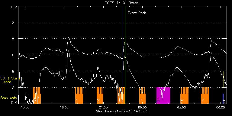 EIS Observation timeline overlay to GOES-Xray curve Code 1" 2" 40" 266" EIS Observations list for this event: STUDY ACRONYM ID DATE OBSERVED DESCRIPTION NOAA# TARGET 0 HH_Flare_raster_v6 | 47132 | 2015/06/21 15:35:40 | AR 12371 obs. | | Flare TIMELINE ID DATE OBSERVED FITS FILE XCEN (+W/-E) YCEN (+N/-S) DUR ----------------------------------------------------------------------------------------------------------------- 47132 | 2015/06/21 15:35:40.000 | eis_l0_20150621_153540.fits.gz | -151.82 | 187.04 | 3m31s 47132 | 2015/06/21 15:39:14.000 | eis_l0_20150621_153914.fits.gz | -151.27 | 186.89 | 3m32s 47132 | 2015/06/21 15:42:48.000 | eis_l0_20150621_154248.fits.gz | -150.73 | 186.97 | 3m31s 47132 | 2015/06/21 15:46:22.000 | eis_l0_20150621_154622.fits.gz | -150.19 | 186.97 | 3m32s 47132 | 2015/06/21 15:49:56.000 | eis_l0_20150621_154956.fits.gz | -149.65 | 186.89 | 3m32s 47132 | 2015/06/21 15:53:31.000 | eis_l0_20150621_155331.fits.gz | -149.19 | 186.81 | 3m31s 47132 | 2015/06/21 15:57:05.000 | eis_l0_20150621_155705.fits.gz | -148.65 | 186.89 | 3m31s 47132 | 2015/06/21 16:00:39.000 | eis_l0_20150621_160039.fits.gz | -148.03 | 186.89 | 3m32s 47132 | 2015/06/21 16:04:14.000 | eis_l0_20150621_160414.fits.gz | -147.57 | 186.89 | 3m31s 47132 | 2015/06/21 16:07:48.000 | eis_l0_20150621_160748.fits.gz | -147.03 | 186.81 | 3m32s 1 HH_Flare_raster_v6 | 47130 | 2015/06/21 18:50:40 | AR 12371 obs. | | Flare TIMELINE ID DATE OBSERVED FITS FILE XCEN (+W/-E) YCEN (+N/-S) DUR ----------------------------------------------------------------------------------------------------------------- 47130 | 2015/06/21 18:50:40.000 | eis_l0_20150621_185040.fits.gz | -113.21 | 190.66 | 3m31s 47130 | 2015/06/21 18:54:14.000 | eis_l0_20150621_185414.fits.gz | -112.67 | 190.74 | 3m31s 47130 | 2015/06/21 18:57:48.000 | eis_l0_20150621_185748.fits.gz | -112.13 | 190.50 | 3m32s 47130 | 2015/06/21 19:01:22.000 | eis_l0_20150621_190122.fits.gz | -111.59 | 190.58 | 3m32s 47130 | 2015/06/21 19:04:57.000 | eis_l0_20150621_190457.fits.gz | -111.12 | 190.50 | 3m32s 47130 | 2015/06/21 19:08:32.000 | eis_l0_20150621_190832.fits.gz | -110.50 | 190.50 | 3m31s 47130 | 2015/06/21 19:12:06.000 | eis_l0_20150621_191206.fits.gz | -109.96 | 190.58 | 3m32s 47130 | 2015/06/21 19:15:41.000 | eis_l0_20150621_191541.fits.gz | -109.42 | 190.66 | 3m31s 47130 | 2015/06/21 19:19:15.000 | eis_l0_20150621_191915.fits.gz | -108.96 | 190.58 | 3m31s 47130 | 2015/06/21 19:22:49.000 | eis_l0_20150621_192249.fits.gz | -108.34 | 190.50 | 3m31s 2 HH_Flare_raster_v6 | 47148 | 2015/06/21 20:30:13 | AR 12371 obs. | | Flare TIMELINE ID DATE OBSERVED FITS FILE XCEN (+W/-E) YCEN (+N/-S) DUR ----------------------------------------------------------------------------------------------------------------- 47148 | 2015/06/21 20:30:13.000 | eis_l0_20150621_203013.fits.gz | -121.34 | 159.50 | 3m31s 47148 | 2015/06/21 20:33:47.000 | eis_l0_20150621_203347.fits.gz | -120.72 | 159.43 | 3m32s 47148 | 2015/06/21 20:37:22.000 | eis_l0_20150621_203722.fits.gz | -120.10 | 159.35 | 3m32s 47148 | 2015/06/21 20:40:57.000 | eis_l0_20150621_204057.fits.gz | -119.64 | 159.35 | 3m31s 47148 | 2015/06/21 20:44:31.000 | eis_l0_20150621_204431.fits.gz | -119.10 | 159.43 | 3m31s 47148 | 2015/06/21 20:48:05.000 | eis_l0_20150621_204805.fits.gz | -118.56 | 159.27 | 3m31s 47148 | 2015/06/21 20:51:39.000 | eis_l0_20150621_205139.fits.gz | -118.10 | 159.35 | 3m32s 47148 | 2015/06/21 20:55:14.000 | eis_l0_20150621_205514.fits.gz | -117.48 | 159.27 | 3m31s 3 HH_Flare_raster_v6 | 47126 | 2015/06/21 22:05:13 | AR 12371 obs. | | Flare TIMELINE ID DATE OBSERVED FITS FILE XCEN (+W/-E) YCEN (+N/-S) DUR ----------------------------------------------------------------------------------------------------------------- 47126 | 2015/06/21 22:05:13.000 | eis_l0_20150621_220513.fits.gz | -79.94 | 179.27 | 3m31s 47126 | 2015/06/21 22:08:47.000 | eis_l0_20150621_220847.fits.gz | -79.47 | 179.20 | 3m32s 47126 | 2015/06/21 22:12:22.000 | eis_l0_20150621_221222.fits.gz | -79.01 | 179.12 | 3m31s 47126 | 2015/06/21 22:15:56.000 | eis_l0_20150621_221556.fits.gz | -78.55 | 179.35 | 3m31s 47126 | 2015/06/21 22:19:30.000 | eis_l0_20150621_221930.fits.gz | -77.85 | 179.20 | 3m31s 47126 | 2015/06/21 22:23:04.000 | eis_l0_20150621_222304.fits.gz | -77.31 | 179.27 | 3m31s 47126 | 2015/06/21 22:26:38.000 | eis_l0_20150621_222638.fits.gz | -76.77 | 179.12 | 3m31s 47126 | 2015/06/21 22:30:12.000 | eis_l0_20150621_223012.fits.gz | -76.23 | 179.04 | 3m32s 47126 | 2015/06/21 22:33:47.000 | eis_l0_20150621_223347.fits.gz | -75.77 | 179.20 | 3m32s 47126 | 2015/06/21 22:37:22.000 | eis_l0_20150621_223722.fits.gz | -75.23 | 179.20 | 3m31s 4 HH_Flare_raster_v6 | 47149 | 2015/06/21 23:45:13 | AR 12371 obs. | | Flare TIMELINE ID DATE OBSERVED FITS FILE XCEN (+W/-E) YCEN (+N/-S) DUR ----------------------------------------------------------------------------------------------------------------- 47149 | 2015/06/21 23:45:13.000 | eis_l0_20150621_234513.fits.gz | -87.42 | 144.20 | 3m31s 47149 | 2015/06/21 23:48:47.000 | eis_l0_20150621_234847.fits.gz | -86.95 | 144.04 | 3m31s 47149 | 2015/06/21 23:52:21.000 | eis_l0_20150621_235221.fits.gz | -86.33 | 143.96 | 3m31s 47149 | 2015/06/21 23:55:55.000 | eis_l0_20150621_235555.fits.gz | -85.87 | 143.96 | 3m31s 47149 | 2015/06/21 23:59:29.000 | eis_l0_20150621_235929.fits.gz | -85.41 | 144.04 | 3m32s 47149 | 2015/06/22 00:03:04.000 | eis_l0_20150622_000304.fits.gz | -84.79 | 144.04 | 3m31s 47149 | 2015/06/22 00:06:38.000 | eis_l0_20150622_000638.fits.gz | -84.17 | 143.89 | 3m31s 47149 | 2015/06/22 00:10:12.000 | eis_l0_20150622_001012.fits.gz | -83.79 | 143.96 | 3m32s 5 HPW021_VEL_120x512v1 | 47122 | 2015/06/22 01:05:26 | AR 12371 obs. | | Active Region TIMELINE ID DATE OBSERVED FITS FILE XCEN (+W/-E) YCEN (+N/-S) DUR ----------------------------------------------------------------------------------------------------------------- 47122 | 2015/06/22 01:05:26.000 | eis_l0_20150622_010526.fits.gz | -