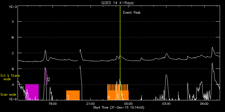 EIS Observation timeline overlay to GOES-Xray curve Code 1" 2" 40" 266" EIS Observations list for this event: STUDY ACRONYM ID DATE OBSERVED DESCRIPTION NOAA# TARGET 0 HPW021VEL120x512v1_b | 50099 | 2015/12/31 15:50:25 | AR 12473 observation | 2473 | Active Region TIMELINE ID DATE OBSERVED FITS FILE XCEN (+W/-E) YCEN (+N/-S) DUR ----------------------------------------------------------------------------------------------------------------- 50099 | 2015/12/31 15:50:25.000 | eis_l0_20151231_155025.fits.gz | 618.24 | -463.37 | 1h1m53s 1 regcal076 | 50100 | 2015/12/31 17:30:11 | Flatfield, 1 exposure, led 100ms, ccd | | Engineering TIMELINE ID DATE OBSERVED FITS FILE XCEN (+W/-E) YCEN (+N/-S) DUR ----------------------------------------------------------------------------------------------------------------- 50100 | 2015/12/31 17:30:11.000 | eis_l0_20151231_173011.fits.gz | 752.46 | -368.84 | 1s 2 regcal070 | 50101 | 2015/12/31 17:35:11 | Flat field with overscan pixels (50*8) | | Engineering TIMELINE ID DATE OBSERVED FITS FILE XCEN (+W/-E) YCEN (+N/-S) DUR ----------------------------------------------------------------------------------------------------------------- 50101 | 2015/12/31 17:35:11.000 | eis_l0_20151231_173511.fits.gz | 753.00 | -113.07 | 2s 3 Atlas_60 | 50102 | 2015/12/31 19:05:26 | AR 12473 observation | 2473 | Quiet Sun TIMELINE ID DATE OBSERVED FITS FILE XCEN (+W/-E) YCEN (+N/-S) DUR ----------------------------------------------------------------------------------------------------------------- 50102 | 2015/12/31 19:05:26.000 | eis_l0_20151231_190526.fits.gz | 680.53 | -330.45 | 1h1m38s 4 HH_Flare_raster_v6 | 50108 | 2015/12/31 22:20:12 | AR 12473 observation | 2473 | Flare TIMELINE ID DATE OBSERVED FITS FILE XCEN (+W/-E) YCEN (+N/-S) DUR ----------------------------------------------------------------------------------------------------------------- 50108 | 2015/12/31 22:20:12.000 | eis_l0_20151231_222012.fits.gz | 682.89 | -353.46 | 3m32s 50108 | 2015/12/31 22:23:47.000 | eis_l0_20151231_222347.fits.gz | 683.20 | -353.46 | 3m31s 50108 | 2015/12/31 22:27:21.000 | eis_l0_20151231_222721.fits.gz | 683.59 | -353.46 | 3m31s 50108 | 2015/12/31 22:30:55.000 | eis_l0_20151231_223055.fits.gz | 683.82 | -353.38 | 3m32s 50108 | 2015/12/31 22:34:30.000 | eis_l0_20151231_223430.fits.gz | 684.05 | -353.46 | 3m32s 50108 | 2015/12/31 22:38:04.000 | eis_l0_20151231_223804.fits.gz | 684.36 | -353.46 | 3m32s 50108 | 2015/12/31 22:41:39.000 | eis_l0_20151231_224139.fits.gz | 684.59 | -353.46 | 3m31s 50108 | 2015/12/31 22:45:13.000 | eis_l0_20151231_224513.fits.gz | 684.90 | -353.46 | 3m31s 50108 | 2015/12/31 22:48:47.000 | eis_l0_20151231_224847.fits.gz | 685.21 | -353.46 | 3m31s 50108 | 2015/12/31 22:52:21.000 | eis_l0_20151231_225221.fits.gz | 685.52 | -353.61 | 3m32s 50108 | 2015/12/31 22:55:55.000 | eis_l0_20151231_225555.fits.gz | 685.75 | -353.54 | 3m32s 50108 | 2015/12/31 22:59:29.000 | eis_l0_20151231_225929.fits.gz | 686.06 | -353.61 | 3m32s 50108 | 2015/12/31 23:03:04.000 | eis_l0_20151231_230304.fits.gz | 686.44 | -353.61 | 3m31s 50108 | 2015/12/31 23:06:38.000 | eis_l0_20151231_230638.fits.gz | 686.68 | -353.85 | 3m31s 50108 | 2015/12/31 23:10:12.000 | eis_l0_20151231_231012.fits.gz | 686.91 | -353.77 | 3m32s 50108 | 2015/12/31 23:13:46.000 | eis_l0_20151231_231346.fits.gz | 687.22 | -353.77 | 3m32s 50108 | 2015/12/31 23:17:20.000 | eis_l0_20151231_231720.fits.gz | 687.53 | -353.61 | 3m32s 50108 | 2015/12/31 23:20:55.000 | eis_l0_20151231_232055.fits.gz | 687.76 | -353.69 | 3m31s 50108 | 2015/12/31 23:24:29.000 | eis_l0_20151231_232429.fits.gz | 688.07 | -353.69 | 3m31s 50108 | 2015/12/31 23:28:03.000 | eis_l0_20151231_232803.fits.gz | 688.38 | -353.69 | 3m31s 50108 | 2015/12/31 23:31:37.000 | eis_l0_20151231_233137.fits.gz | 688.61 | -353.85 | 3m32s 50108 | 2015/12/31 23:35:11.000 | eis_l0_20151231_233511.fits.gz | 688.84 | -353.85 | 3m32s 50108 | 2015/12/31 23:38:46.000 | eis_l0_20151231_233846.fits.gz | 689.15 | -353.69 | 3m32s 50108 | 2015/12/31 23:42:21.000 | eis_l0_20151231_234221.fits.gz | 689.46 | -353.77 | 3m32s 50108 | 2015/12/31 23:45:56.000 | eis_l0_20151231_234556.fits.gz | 689.77 | -353.92 | 3m31s 50108 | 2015/12/31 23:49:30.000 | eis_l0_20151231_234930.fits.gz | 690.00 | -353.92 | 3m32s 50108 | 2015/12/31 23:53:05.000 | eis_l0_20151231_235305.fits.gz | 690.31 | -353.85 | 3m31s 50108 | 2015/12/31 23:56:39.000 | eis_l0_20151231_235639.fits.gz | 690.62 | -353.92 | 3m31s : Check study information : Download file : View thumbnails For this event, also check for: