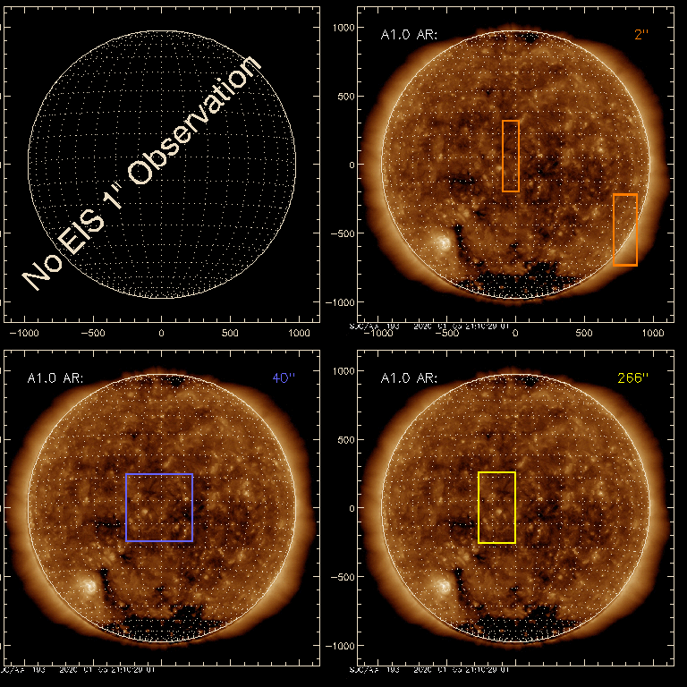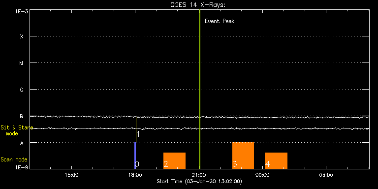 EIS Observation timeline overlay to GOES-Xray curve Code 1" 2" 40" 266" EIS Observations list for this event: STUDY ACRONYM ID DATE OBSERVED DESCRIPTION NOAA# TARGET 0 PRY_slot_contextLITE | 70320 | 2020/01/03 17:58:47 | pointing monitoring | | Active Region TIMELINE ID DATE OBSERVED FITS FILE XCEN (+W/-E) YCEN (+N/-S) DUR ----------------------------------------------------------------------------------------------------------------- 70320 | 2020/01/03 17:58:47.000 | eis_l0_20200103_175847.fits.gz | -15.29 | -0.58 | 2m56s 1 XRT_synop_AIA | 70321 | 2020/01/03 18:02:01 | pointing monitoring | | Quiet Sun TIMELINE ID DATE OBSERVED FITS FILE XCEN (+W/-E) YCEN (+N/-S) DUR ----------------------------------------------------------------------------------------------------------------- 70321 | 2020/01/03 18:02:01.000 | eis_l0_20200103_180201.fits.gz | -132.57 | -0.42 | 10s 2 HPW021VEL260x512v2 | 70327 | 2020/01/03 19:20:16 | AR observation | | Active Region TIMELINE ID DATE OBSERVED FITS FILE XCEN (+W/-E) YCEN (+N/-S) DUR ----------------------------------------------------------------------------------------------------------------- 70327 | 2020/01/03 19:20:16.000 | eis_l0_20200103_192016.fits.gz | 799.92 | -478.20 | 1h0m45s 3 HPW021VEL260x512v2 | 70325 | 2020/01/03 22:34:40 | AR observation | | Active Region TIMELINE ID DATE OBSERVED FITS FILE XCEN (+W/-E) YCEN (+N/-S) DUR ----------------------------------------------------------------------------------------------------------------- 70325 | 2020/01/03 22:34:40.000 | eis_l0_20200103_223440.fits.gz | 801.34 | -482.20 | 1h0m44s 4 Large_CH_Map | 70300 | 2020/01/04 00:07:40 | HOP 393 | | Quiet Sun TIMELINE ID DATE OBSERVED FITS FILE XCEN (+W/-E) YCEN (+N/-S) DUR ----------------------------------------------------------------------------------------------------------------- 70300 | 2020/01/04 00:07:40.000 | eis_l0_20200104_000740.fits.gz | -33.22 | 59.34 | 1h1m53s : Check study information : Download file : View thumbnails For this event, also check for: