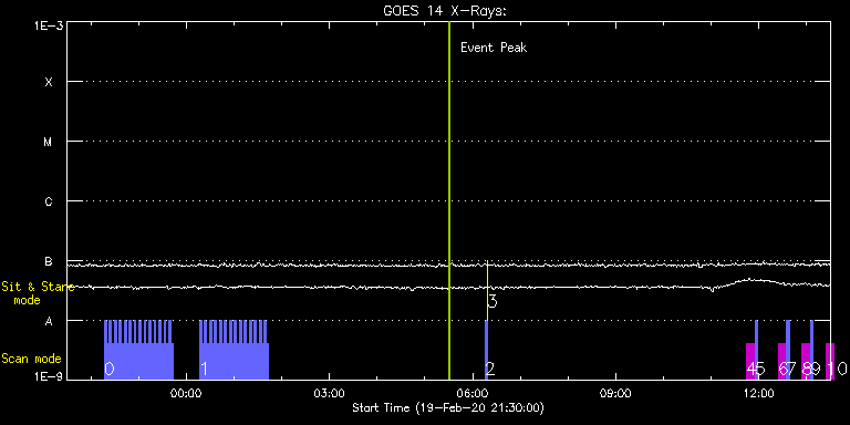 EIS Observation timeline overlay to GOES-Xray curve Code 1" 2" 40" 266" EIS Observations list for this event: STUDY ACRONYM ID DATE OBSERVED DESCRIPTION NOAA# TARGET 0 Alignment_modify_v2 | 71004 | 2020/02/19 22:16:52 | Instrument alignment (N-limb) | | Quiet Sun TIMELINE ID DATE OBSERVED FITS FILE XCEN (+W/-E) YCEN (+N/-S) DUR ----------------------------------------------------------------------------------------------------------------- 71004 | 2020/02/19 22:16:52.000 | eis_l0_20200219_221652.fits.gz | -9.47 | 944.33 | 2m34s 71004 | 2020/02/19 22:20:00.000 | eis_l0_20200219_222000.fits.gz | -9.55 | 944.25 | 2m34s 71004 | 2020/02/19 22:23:07.000 | eis_l0_20200219_222307.fits.gz | -9.55 | 944.33 | 2m34s 71004 | 2020/02/19 22:26:15.000 | eis_l0_20200219_222615.fits.gz | -9.55 | 944.33 | 2m34s 71004 | 2020/02/19 22:29:22.000 | eis_l0_20200219_222922.fits.gz | -9.47 | 944.48 | 2m34s 71004 | 2020/02/19 22:32:30.000 | eis_l0_20200219_223230.fits.gz | -9.47 | 944.41 | 2m34s 71004 | 2020/02/19 22:35:38.000 | eis_l0_20200219_223538.fits.gz | -9.55 | 944.33 | 2m34s 71004 | 2020/02/19 22:38:45.000 | eis_l0_20200219_223845.fits.gz | -9.55 | 944.33 | 2m34s 71004 | 2020/02/19 22:41:53.000 | eis_l0_20200219_224153.fits.gz | -9.55 | 944.41 | 2m34s 71004 | 2020/02/19 22:45:00.000 | eis_l0_20200219_224500.fits.gz | -9.55 | 944.41 | 2m34s 71004 | 2020/02/19 22:48:08.000 | eis_l0_20200219_224808.fits.gz | -9.47 | 944.41 | 2m34s 71004 | 2020/02/19 22:51:15.000 | eis_l0_20200219_225115.fits.gz | -9.47 | 944.33 | 2m34s 71004 | 2020/02/19 22:54:23.000 | eis_l0_20200219_225423.fits.gz | -9.55 | 944.41 | 2m34s 71004 | 2020/02/19 22:57:30.000 | eis_l0_20200219_225730.fits.gz | -9.55 | 944.41 | 2m34s 71004 | 2020/02/19 23:00:38.000 | eis_l0_20200219_230038.fits.gz | -9.55 | 944.41 | 2m34s 71004 | 2020/02/19 23:03:45.000 | eis_l0_20200219_230345.fits.gz | -9.47 | 944.25 | 2m34s 71004 | 2020/02/19 23:06:53.000 | eis_l0_20200219_230653.fits.gz | -9.39 | 944.33 | 2m34s 71004 | 2020/02/19 23:10:00.000 | eis_l0_20200219_231000.fits.gz | -9.47 | 944.41 | 2m34s 71004 | 2020/02/19 23:13:08.000 | eis_l0_20200219_231308.fits.gz | -9.47 | 944.33 | 2m34s 71004 | 2020/02/19 23:16:15.000 | eis_l0_20200219_231615.fits.gz | -9.55 | 944.33 | 2m34s 71004 | 2020/02/19 23:19:23.000 | eis_l0_20200219_231923.fits.gz | -9.47 | 944.41 | 2m34s 71004 | 2020/02/19 23:22:30.000 | eis_l0_20200219_232230.fits.gz | -9.55 | 944.41 | 2m34s 71004 | 2020/02/19 23:25:38.000 | eis_l0_20200219_232538.fits.gz | -9.47 | 944.41 | 2m34s 71004 | 2020/02/19 23:28:45.000 | eis_l0_20200219_232845.fits.gz | -9.63 | 944.41 | 2m34s 71004 | 2020/02/19 23:31:53.000 | eis_l0_20200219_233153.fits.gz | -9.47 | 944.33 | 2m34s 71004 | 2020/02/19 23:35:01.000 | eis_l0_20200219_233501.fits.gz | -9.55 | 944.48 | 2m34s 71004 | 2020/02/19 23:38:08.000 | eis_l0_20200219_233808.fits.gz | -9.47 | 944.33 | 2m34s 71004 | 2020/02/19 23:41:16.000 | eis_l0_20200219_234116.fits.gz | -9.47 | 944.33 | 2m34s 1 Alignment_modify_v2 | 71005 | 2020/02/20 00:16:46 | Instrument alignment (E-limb) | | Quiet Sun TIMELINE ID DATE OBSERVED FITS FILE XCEN (+W/-E) YCEN (+N/-S) DUR ----------------------------------------------------------------------------------------------------------------- 71005 | 2020/02/20 00:16:46.000 | eis_l0_20200220_001646.fits.gz | -9868.96 | -9963.20 | 2m34s 71005 | 2020/02/20 00:19:53.000 | eis_l0_20200220_001953.fits.gz | -9868.96 | -9963.20 | 2m34s 71005 | 2020/02/20 00:23:01.000 | eis_l0_20200220_002301.fits.gz | -9868.96 | -9963.20 | 2m34s 71005 | 2020/02/20 00:26:08.000 | eis_l0_20200220_002608.fits.gz | -9868.96 | -9963.20 | 2m34s 71005 | 2020/02/20 00:29:16.000 | eis_l0_20200220_002916.fits.gz | -9868.96 | -9963.20 | 2m34s 71005 | 2020/02/20 00:32:24.000 | eis_l0_20200220_003224.fits.gz | -9868.96 | -9963.20 | 2m34s 71005 | 2020/02/20 00:35:31.000 | eis_l0_20200220_003531.fits.gz | -9868.96 | -9963.20 | 2m34s 71005 | 2020/02/20 00:38:39.000 | eis_l0_20200220_003839.fits.gz | -9868.96 | -9963.20 | 2m34s 71005 | 2020/02/20 00:41:46.000 | eis_l0_20200220_004146.fits.gz | -9868.96 | -9963.20 | 2m34s 71005 | 2020/02/20 00:44:54.000 | eis_l0_20200220_004454.fits.gz | -9868.96 | -9963.20 | 2m34s 71005 | 2020/02/20 00:48:01.000 | eis_l0_20200220_004801.fits.gz | -9868.96 | -9963.20 | 2m34s 71005 | 2020/02/20 00:51:09.000 | eis_l0_20200220_005109.fits.gz | -9868.96 | -9963.20 | 2m34s 71005 | 2020/02/20 00:54:16.000 | eis_l0_20200220_005416.fits.gz | -9868.96 | -9963.20 | 2m34s 71005 | 2020/02/20 00:57:24.000 | eis_l0_20200220_005724.fits.gz | -9868.96 | -9963.20 | 2m34s 71005 | 2020/02/20 01:00:31.000 | eis_l0_20200220_010031.fits.gz | -9868.96 | -9963.20 | 2m34s 71005 | 2020/02/20 01:03:39.000 | eis_l0_20200220_010339.fits.gz | -9868.96 | -9963.20 | 2m33s 71005 | 2020/02/20 01:06:46.000 | eis_l0_20200220_010646.fits.gz | -9868.96 | -9963.20 | 2m34s 71005 | 2020/02/20 01:09:54.000 | eis_l0_20200220_010954.fits.gz | -9868.96 | -9963.20 | 2m34s 71005 | 2020/02/20 01:13:01.000 | eis_l0_20200220_011301.fits.gz | -9868.96 | -9963.20 | 2m34s 71005 | 2020/02/20 01:16:09.000 | eis_l0_20200220_011609.fits.gz | -9868.96 | -9963.20 | 2m34s 71005 | 2020/02/20 01:19:16.000 | eis_l0_20200220_011916.fits.gz | -9868.96 | -9963.20 | 2m34s 71005 | 2020/02/20 01:22:24.000 | eis_l0_20200220_012224.fits.gz | -9868.96 | -9963.20 | 2m34s 71005 | 2020/02/20 01:25:32.000 | eis_l0_20200220_012532.fits.gz | -9868.96 | -9963.20 | 2m33s 71005 | 2020/02/20 01:28:39.000 | eis_l0_20200220_012839.fits.gz | -9868.96 | -9963.20 | 2m34s 71005 | 2020/02/20 01:31:46.000 | eis_l0_20200220_013146.fits.gz | -9868.96 | -9963.20 | 2m35s 71005 | 2020/02/20 01:34:54.000 | eis_l0_20200220_013454.fits.gz | -9868.96 | -9963.20 | 2m34s 71005 | 2020/02/20 01:38:02.000 | eis_l0_20200220_013802.fits.gz | -9868.96 | -9963.20 | 2m34s 71005 | 2020/02/20 01:41:09.000 | eis_l0_20200220_014109.fits.gz | -9868.96 | -9963.20 | 2m34s 2 PRY_slot_contextLITE | 70996 | 2020/02/20 06:15:14 | Pointing monitoring | | Active Region TIMEL