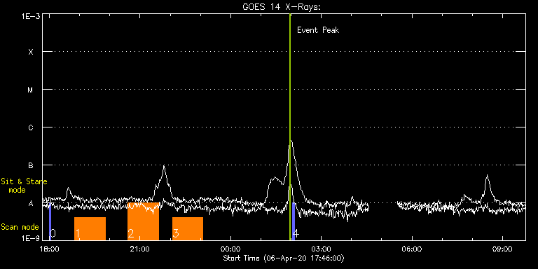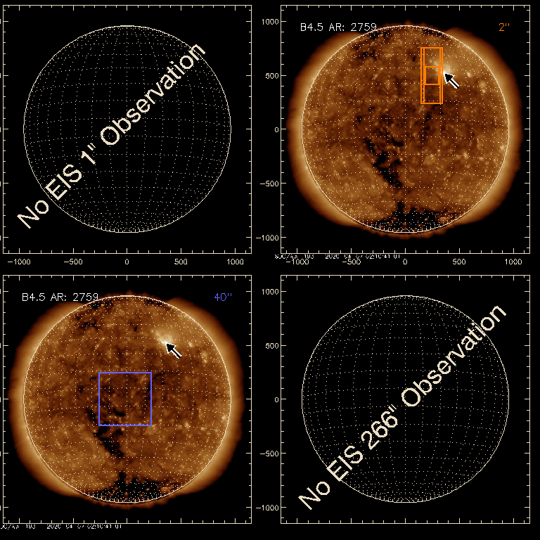 EIS Observation timeline overlay to GOES-Xray curve Code 1" 2" 40" 266" EIS Observations list for this event: STUDY ACRONYM ID DATE OBSERVED DESCRIPTION NOAA# TARGET 0 PRY_slot_contextLITE | 71518 | 2020/04/06 18:00:16 | Synoptic | | Active Region TIMELINE ID DATE OBSERVED FITS FILE XCEN (+W/-E) YCEN (+N/-S) DUR ----------------------------------------------------------------------------------------------------------------- 71518 | 2020/04/06 18:00:16.000 | eis_l0_20200406_180016.fits.gz | -15.14 | -0.35 | 2m57s 1 HPW021VEL260x512v2 | 71570 | 2020/04/06 18:50:30 | AR studies | | Active Region TIMELINE ID DATE OBSERVED FITS FILE XCEN (+W/-E) YCEN (+N/-S) DUR ----------------------------------------------------------------------------------------------------------------- 71570 | 2020/04/06 18:50:30.000 | eis_l0_20200406_185030.fits.gz | 236.64 | 492.83 | 1h0m45s 2 Atlas_60 | 71571 | 2020/04/06 20:35:37 | AR studies | | Quiet Sun TIMELINE ID DATE OBSERVED FITS FILE XCEN (+W/-E) YCEN (+N/-S) DUR ----------------------------------------------------------------------------------------------------------------- 71571 | 2020/04/06 20:35:37.000 | eis_l0_20200406_203537.fits.gz | 249.87 | 492.36 | 1h1m39s 3 HPW021VEL260x512v2 | 71575 | 2020/04/06 22:04:07 | AR studies | | Active Region TIMELINE ID DATE OBSERVED FITS FILE XCEN (+W/-E) YCEN (+N/-S) DUR ----------------------------------------------------------------------------------------------------------------- 71575 | 2020/04/06 22:04:07.000 | eis_l0_20200406_220407.fits.gz | 260.51 | 491.67 | 1h0m45s 4 PRY_slot_contextLITE | 71527 | 2020/04/07 02:03:17 | Synoptic | | Active Region TIMELINE ID DATE OBSERVED FITS FILE XCEN (+W/-E) YCEN (+N/-S) DUR ----------------------------------------------------------------------------------------------------------------- 71527 | 2020/04/07 02:03:17.000 | eis_l0_20200407_020317.fits.gz | -15.29 | -0.58 | 2m56s : Check study information : Download file : View thumbnails For this event, also check for: