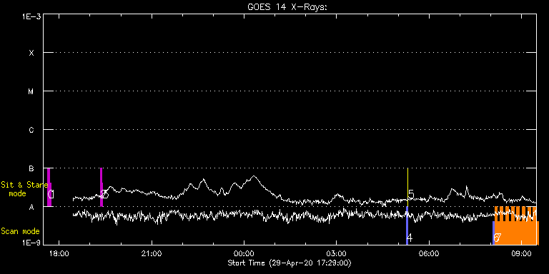 EIS Observation timeline overlay to GOES-Xray curve Code 1" 2" 40" 266" EIS Observations list for this event: STUDY ACRONYM ID DATE OBSERVED DESCRIPTION NOAA# TARGET 0 regcal071 | 71847 | 2020/04/29 17:37:41 | Dark exposures, CCD bottom rows (100s | | Engineering TIMELINE ID DATE OBSERVED FITS FILE XCEN (+W/-E) YCEN (+N/-S) DUR ----------------------------------------------------------------------------------------------------------------- 71847 | 2020/04/29 17:37:41.000 | eis_l0_20200429_173741.fits.gz | 182.06 | -390.32 | 3m22s 1 regcal072 | 71848 | 2020/04/29 17:41:30 | Dark exposures, top CCD rows (100s exp | | Engineering TIMELINE ID DATE OBSERVED FITS FILE XCEN (+W/-E) YCEN (+N/-S) DUR ----------------------------------------------------------------------------------------------------------------- 71848 | 2020/04/29 17:41:30.000 | eis_l0_20200429_174130.fits.gz | 182.60 | 120.68 | 3m22s 2 regcal074 | 71849 | 2020/04/29 19:20:11 | Dark exposures including overscan pixe | | Engineering TIMELINE ID DATE OBSERVED FITS FILE XCEN (+W/-E) YCEN (+N/-S) DUR ----------------------------------------------------------------------------------------------------------------- 71849 | 2020/04/29 19:20:11.000 | eis_l0_20200429_192011.fits.gz | 197.43 | 120.22 | 3m22s 3 regcal076 | 71892 | 2020/04/29 19:24:01 | Flatfield, 1 exposure, led 100ms, ccd | | Engineering TIMELINE ID DATE OBSERVED FITS FILE XCEN (+W/-E) YCEN (+N/-S) DUR ----------------------------------------------------------------------------------------------------------------- 71892 | 2020/04/29 19:24:01.000 | eis_l0_20200429_192401.fits.gz | 197.90 | -135.86 | 1s 4 PRY_slot_contextLITE | 71880 | 2020/04/30 05:15:20 | Pointing Monitoring | | Active Region TIMELINE ID DATE OBSERVED FITS FILE XCEN (+W/-E) YCEN (+N/-S) DUR ----------------------------------------------------------------------------------------------------------------- 71880 | 2020/04/30 05:15:20.000 | eis_l0_20200430_051520.fits.gz | -15.21 | -0.50 | 2m56s 5 XRT_synop_AIA | 71881 | 2020/04/30 05:18:34 | Pointing Monitoring | | Quiet Sun TIMELINE ID DATE OBSERVED FITS FILE XCEN (+W/-E) YCEN (+N/-S) DUR ----------------------------------------------------------------------------------------------------------------- 71881 | 2020/04/30 05:18:34.000 | eis_l0_20200430_051834.fits.gz | -132.57 | -0.50 | 10s 6 PRY_slot_contextLITE | 71896 | 2020/04/30 08:04:27 | New AR Observation | | Active Region TIMELINE ID DATE OBSERVED FITS FILE XCEN (+W/-E) YCEN (+N/-S) DUR ----------------------------------------------------------------------------------------------------------------- 71896 | 2020/04/30 08:04:27.000 | eis_l0_20200430_080427.fits.gz | 582.17 | -247.59 | 2m57s 7 HH_Flare+AR_180x152 | 71897 | 2020/04/30 08:07:49 | New AR Observation | | Flare TIMELINE ID DATE OBSERVED FITS FILE XCEN (+W/-E) YCEN (+N/-S) DUR ----------------------------------------------------------------------------------------------------------------- 71897 | 2020/04/30 08:07:49.000 | eis_l0_20200430_080749.fits.gz | 595.38 | -247.59 | 5m17s 71897 | 2020/04/30 08:13:09.000 | eis_l0_20200430_081309.fits.gz | 596.00 | -247.66 | 5m18s 71897 | 2020/04/30 08:18:30.000 | eis_l0_20200430_081830.fits.gz | 596.46 | -247.74 | 5m18s 71897 | 2020/04/30 08:23:51.000 | eis_l0_20200430_082351.fits.gz | 597.00 | -247.82 | 5m18s 71897 | 2020/04/30 08:29:12.000 | eis_l0_20200430_082912.fits.gz | 597.70 | -247.97 | 5m18s 71897 | 2020/04/30 08:34:33.000 | eis_l0_20200430_083433.fits.gz | 598.16 | -247.82 | 5m17s 71897 | 2020/04/30 08:39:53.000 | eis_l0_20200430_083953.fits.gz | 598.70 | -248.05 | 5m18s 71897 | 2020/04/30 08:45:14.000 | eis_l0_20200430_084514.fits.gz | 599.24 | -247.90 | 5m18s 71897 | 2020/04/30 08:50:35.000 | eis_l0_20200430_085035.fits.gz | 599.86 | -248.13 | 5m18s 71897 | 2020/04/30 08:55:56.000 | eis_l0_20200430_085556.fits.gz | 600.40 | -248.05 | 5m18s 71897 | 2020/04/30 09:01:16.000 | eis_l0_20200430_090116.fits.gz | 601.02 | -248.13 | 5m18s 71897 | 2020/04/30 09:06:37.000 | eis_l0_20200430_090637.fits.gz | 601.64 | -248.05 | 5m18s 71897 | 2020/04/30 09:11:58.000 | eis_l0_20200430_091158.fits.gz | 602.10 | -248.21 | 5m17s 71897 | 2020/04/30 09:17:18.000 | eis_l0_20200430_091718.fits.gz | 602.64 | -248.13 | 5m18s 71897 | 2020/04/30 09:22:39.000 | eis_l0_20200430_092239.fits.gz | 603.26 | -248.21 | 5m17s 71897 | 2020/04/30 09:27:59.000 | eis_l0_20200430_092759.fits.gz | 603.80 | -248.28 | 5m18s 71897 | 2020/04/30 09:33:20.000 | eis_l0_20200430_093320.fits.gz | 604.34 | -248.44 | 5m18s 71897 | 2020/04/30 09:38:41.000 | eis_l0_20200430_093841.fits.gz | 604.80 | -248.36 | 5m17s 71897 | 2020/04/30 09:44:01.000 | eis_l0_20200430_094401.fits.gz | 605.42 | -248.36 | 5m18s 71897 | 2020/04/30 09:49:22.000 | eis_l0_20200430_094922.fits.gz | 606.04 | -248.44 | 5m18s 71897 | 2020/04/30 09:54:43.000 | eis_l0_20200430_095443.fits.gz | 606.50 | -248.51 | 5m17s 71897 | 2020/04/30 10:00:03.000 | eis_l0_20200430_100003.fits.gz | 607.20 | -248.51 | 5m17s 71897 | 2020/04/30 10:05:23.000 | eis_l0_20200430_100523.fits.gz | 607.74 | -248.75 | 5m18s 71897 | 2020/04/30 10:10:44.000 | eis_l0_20200430_101044.fits.gz | 608.20 | -248.75 | 5m17s 71897 | 2020/04/30 10:16:04.000 | eis_l0_20200430_101604.fits.gz | 608.82 | -248.59 | 5m18s 71897 | 2020/04/30 10:21:25.000 | eis_l0_20200430_102125.fits.gz | 609.28 | -248.82 | 5m18s 71897 | 2020/04/30 10:26:46.000 | eis_l0_20200430_102646.fits.gz | 609.90 | -248.90 | 5m18s 71897 | 2020/04/30 10:32:06.000 | eis_l0_20200430_103206.fits.gz | 610.52 | -248.75 | 5m18s 71897 | 2020/04/30 10:37:27.000 | eis_l0_20200430_103727.fits.gz | 610.98 | -248.98 | 5m18s 71897 | 2020/04/30 10:42:48.000 | eis_l0_20200430_104248.fits.gz | 611.52 | -248.82 | 5m18s 71897 | 2020/04/30 10:48:09.000 | eis_l0_20200430_104809.fits.gz | 612.14 | -248.90 | 5m18s 71897 | 2020/04/30 10:53:30.000 | eis_l0_20200430_105330.fits.gz | 612.60 | -248.90 | 5m17s 71897 | 2020/04/30 10:58:50.000 | eis_l0_20200430_105850.fits.gz | 613.2