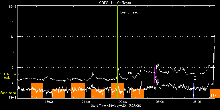 EIS Observation timeline overlay to GOES-Xray curve Code 1" 2" 40" 266" EIS Observations list for this event: STUDY ACRONYM ID DATE OBSERVED DESCRIPTION NOAA# TARGET 0 HPW021VEL260x512v2 | 72220 | 2020/05/28 16:32:08 | Pointing Sun centre | | Active Region TIMELINE ID DATE OBSERVED FITS FILE XCEN (+W/-E) YCEN (+N/-S) DUR ----------------------------------------------------------------------------------------------------------------- 72220 | 2020/05/28 16:32:08.000 | eis_l0_20200528_163208.fits.gz | 441.22 | 19.89 | 1h0m44s 1 GDZ_PLUME1_2_300_50s | 72221 | 2020/05/28 18:13:42 | Pointing: N limb | | Coronal Hole TIMELINE ID DATE OBSERVED FITS FILE XCEN (+W/-E) YCEN (+N/-S) DUR ----------------------------------------------------------------------------------------------------------------- 72221 | 2020/05/28 18:13:42.000 | eis_l0_20200528_181342.fits.gz | -50.78 | 907.56 | 1h4m52s 2 GDZ_PLUME1_2_300_50s | 72222 | 2020/05/28 19:50:12 | Pointing: S limb | | Coronal Hole TIMELINE ID DATE OBSERVED FITS FILE XCEN (+W/-E) YCEN (+N/-S) DUR ----------------------------------------------------------------------------------------------------------------- 72222 | 2020/05/28 19:50:12.000 | eis_l0_20200528_195012.fits.gz | -9870.20 | -9971.20 | 1h4m51s 3 GDZ_PLUME1_2_300_50s | 72223 | 2020/05/28 21:27:42 | Pointing: W limb | | Coronal Hole TIMELINE ID DATE OBSERVED FITS FILE XCEN (+W/-E) YCEN (+N/-S) DUR ----------------------------------------------------------------------------------------------------------------- 72223 | 2020/05/28 21:27:42.000 | eis_l0_20200528_212742.fits.gz | 789.42 | 17.56 | 1h4m52s 4 HPW021VEL260x512v2 | 72258 | 2020/05/28 23:03:42 | AR stdudy | | Active Region TIMELINE ID DATE OBSERVED FITS FILE XCEN (+W/-E) YCEN (+N/-S) DUR ----------------------------------------------------------------------------------------------------------------- 72258 | 2020/05/28 23:03:42.000 | eis_l0_20200528_230342.fits.gz | 754.18 | 477.41 | 1h0m45s 5 Atlas_60 | 72259 | 2020/05/29 00:38:12 | AR study | | Quiet Sun TIMELINE ID DATE OBSERVED FITS FILE XCEN (+W/-E) YCEN (+N/-S) DUR ----------------------------------------------------------------------------------------------------------------- 72259 | 2020/05/29 00:38:12.000 | eis_l0_20200529_003812.fits.gz | 754.75 | 477.34 | 1h1m40s 6 regcal074 | 72271 | 2020/05/29 02:30:10 | Dark exposures including overscan pixe | | Engineering TIMELINE ID DATE OBSERVED FITS FILE XCEN (+W/-E) YCEN (+N/-S) DUR ----------------------------------------------------------------------------------------------------------------- 72271 | 2020/05/29 02:30:10.000 | eis_l0_20200529_023010.fits.gz | 14.51 | 205.58 | 3m22s 7 regcal076 | 72272 | 2020/05/29 02:33:59 | Flatfield, 1 exposure, led 100ms, ccd | | Engineering TIMELINE ID DATE OBSERVED FITS FILE XCEN (+W/-E) YCEN (+N/-S) DUR ----------------------------------------------------------------------------------------------------------------- 72272 | 2020/05/29 02:33:59.000 | eis_l0_20200529_023359.fits.gz | 14.59 | -50.42 | 2s 8 PRY_slot_contextLITE | 72232 | 2020/05/29 05:40:19 | Point Monitoring | | Active Region TIMELINE ID DATE OBSERVED FITS FILE XCEN (+W/-E) YCEN (+N/-S) DUR ----------------------------------------------------------------------------------------------------------------- 72232 | 2020/05/29 05:40:19.000 | eis_l0_20200529_054019.fits.gz | -15.21 | -0.50 | 2m56s 9 XRT_synop_AIA | 72233 | 2020/05/29 05:43:33 | Point Monitoring | | Quiet Sun TIMELINE ID DATE OBSERVED FITS FILE XCEN (+W/-E) YCEN (+N/-S) DUR ----------------------------------------------------------------------------------------------------------------- 72233 | 2020/05/29 05:43:33.000 | eis_l0_20200529_054333.fits.gz | -132.49 | -0.50 | 11s 10 HPW021VEL260x512v1 | 72260 | 2020/05/29 07:03:53 | AR Study | | Active Region TIMELINE ID DATE OBSERVED FITS FILE XCEN (+W/-E) YCEN (+N/-S) DUR ----------------------------------------------------------------------------------------------------------------- 72260 | 2020/05/29 07:03:53.000 | eis_l0_20200529_070353.fits.gz | 819.07 | 511.49 | 1h0m44s : Check study information : Download file : View thumbnails For this event, also check for: