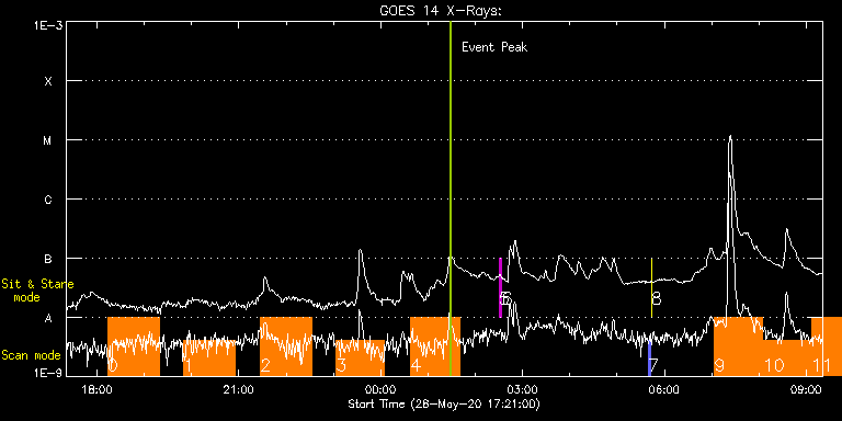 EIS Observation timeline overlay to GOES-Xray curve Code 1" 2" 40" 266" EIS Observations list for this event: STUDY ACRONYM ID DATE OBSERVED DESCRIPTION NOAA# TARGET 0 GDZ_PLUME1_2_300_50s | 72221 | 2020/05/28 18:13:42 | Pointing: N limb | | Coronal Hole TIMELINE ID DATE OBSERVED FITS FILE XCEN (+W/-E) YCEN (+N/-S) DUR ----------------------------------------------------------------------------------------------------------------- 72221 | 2020/05/28 18:13:42.000 | eis_l0_20200528_181342.fits.gz | -50.78 | 907.56 | 1h4m52s 1 GDZ_PLUME1_2_300_50s | 72222 | 2020/05/28 19:50:12 | Pointing: S limb | | Coronal Hole TIMELINE ID DATE OBSERVED FITS FILE XCEN (+W/-E) YCEN (+N/-S) DUR ----------------------------------------------------------------------------------------------------------------- 72222 | 2020/05/28 19:50:12.000 | eis_l0_20200528_195012.fits.gz | -9870.20 | -9971.20 | 1h4m51s 2 GDZ_PLUME1_2_300_50s | 72223 | 2020/05/28 21:27:42 | Pointing: W limb | | Coronal Hole TIMELINE ID DATE OBSERVED FITS FILE XCEN (+W/-E) YCEN (+N/-S) DUR ----------------------------------------------------------------------------------------------------------------- 72223 | 2020/05/28 21:27:42.000 | eis_l0_20200528_212742.fits.gz | 789.42 | 17.56 | 1h4m52s 3 HPW021VEL260x512v2 | 72258 | 2020/05/28 23:03:42 | AR stdudy | | Active Region TIMELINE ID DATE OBSERVED FITS FILE XCEN (+W/-E) YCEN (+N/-S) DUR ----------------------------------------------------------------------------------------------------------------- 72258 | 2020/05/28 23:03:42.000 | eis_l0_20200528_230342.fits.gz | 754.18 | 477.41 | 1h0m45s 4 Atlas_60 | 72259 | 2020/05/29 00:38:12 | AR study | | Quiet Sun TIMELINE ID DATE OBSERVED FITS FILE XCEN (+W/-E) YCEN (+N/-S) DUR ----------------------------------------------------------------------------------------------------------------- 72259 | 2020/05/29 00:38:12.000 | eis_l0_20200529_003812.fits.gz | 754.75 | 477.34 | 1h1m40s 5 regcal074 | 72271 | 2020/05/29 02:30:10 | Dark exposures including overscan pixe | | Engineering TIMELINE ID DATE OBSERVED FITS FILE XCEN (+W/-E) YCEN (+N/-S) DUR ----------------------------------------------------------------------------------------------------------------- 72271 | 2020/05/29 02:30:10.000 | eis_l0_20200529_023010.fits.gz | 14.51 | 205.58 | 3m22s 6 regcal076 | 72272 | 2020/05/29 02:33:59 | Flatfield, 1 exposure, led 100ms, ccd | | Engineering TIMELINE ID DATE OBSERVED FITS FILE XCEN (+W/-E) YCEN (+N/-S) DUR ----------------------------------------------------------------------------------------------------------------- 72272 | 2020/05/29 02:33:59.000 | eis_l0_20200529_023359.fits.gz | 14.59 | -50.42 | 2s 7 PRY_slot_contextLITE | 72232 | 2020/05/29 05:40:19 | Point Monitoring | | Active Region TIMELINE ID DATE OBSERVED FITS FILE XCEN (+W/-E) YCEN (+N/-S) DUR ----------------------------------------------------------------------------------------------------------------- 72232 | 2020/05/29 05:40:19.000 | eis_l0_20200529_054019.fits.gz | -15.21 | -0.50 | 2m56s 8 XRT_synop_AIA | 72233 | 2020/05/29 05:43:33 | Point Monitoring | | Quiet Sun TIMELINE ID DATE OBSERVED FITS FILE XCEN (+W/-E) YCEN (+N/-S) DUR ----------------------------------------------------------------------------------------------------------------- 72233 | 2020/05/29 05:43:33.000 | eis_l0_20200529_054333.fits.gz | -132.49 | -0.50 | 11s 9 HPW021VEL260x512v1 | 72260 | 2020/05/29 07:03:53 | AR Study | | Active Region TIMELINE ID DATE OBSERVED FITS FILE XCEN (+W/-E) YCEN (+N/-S) DUR ----------------------------------------------------------------------------------------------------------------- 72260 | 2020/05/29 07:03:53.000 | eis_l0_20200529_070353.fits.gz | 819.07 | 511.49 | 1h0m44s 10 HPW021VEL260x512v1 | 72261 | 2020/05/29 08:05:10 | AR Study | | Active Region TIMELINE ID DATE OBSERVED FITS FILE XCEN (+W/-E) YCEN (+N/-S) DUR ----------------------------------------------------------------------------------------------------------------- 72261 | 2020/05/29 08:05:10.000 | eis_l0_20200529_080510.fits.gz | 798.01 | 476.34 | 1h0m45s 11 HPW021VEL260x512v1 | 72262 | 2020/05/29 09:06:27 | AR Study | | Active Region TIMELINE ID DATE OBSERVED FITS FILE XCEN (+W/-E) YCEN (+N/-S) DUR ----------------------------------------------------------------------------------------------------------------- 72262 | 2020/05/29 09:06:27.000 | eis_l0_20200529_090627.fits.gz | 797.93 | 476.26 | 1h0m45s : Check study information : Download file : View thumbnails For this event, also check for: