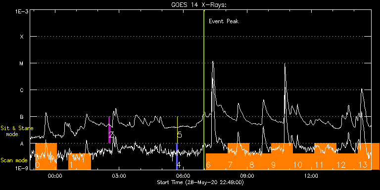 EIS Observation timeline overlay to GOES-Xray curve Code 1" 2" 40" 266" EIS Observations list for this event: STUDY ACRONYM ID DATE OBSERVED DESCRIPTION NOAA# TARGET 0 HPW021VEL260x512v2 | 72258 | 2020/05/28 23:03:42 | AR stdudy | | Active Region TIMELINE ID DATE OBSERVED FITS FILE XCEN (+W/-E) YCEN (+N/-S) DUR ----------------------------------------------------------------------------------------------------------------- 72258 | 2020/05/28 23:03:42.000 | eis_l0_20200528_230342.fits.gz | 754.18 | 477.41 | 1h0m45s 1 Atlas_60 | 72259 | 2020/05/29 00:38:12 | AR study | | Quiet Sun TIMELINE ID DATE OBSERVED FITS FILE XCEN (+W/-E) YCEN (+N/-S) DUR ----------------------------------------------------------------------------------------------------------------- 72259 | 2020/05/29 00:38:12.000 | eis_l0_20200529_003812.fits.gz | 754.75 | 477.34 | 1h1m40s 2 regcal074 | 72271 | 2020/05/29 02:30:10 | Dark exposures including overscan pixe | | Engineering TIMELINE ID DATE OBSERVED FITS FILE XCEN (+W/-E) YCEN (+N/-S) DUR ----------------------------------------------------------------------------------------------------------------- 72271 | 2020/05/29 02:30:10.000 | eis_l0_20200529_023010.fits.gz | 14.51 | 205.58 | 3m22s 3 regcal076 | 72272 | 2020/05/29 02:33:59 | Flatfield, 1 exposure, led 100ms, ccd | | Engineering TIMELINE ID DATE OBSERVED FITS FILE XCEN (+W/-E) YCEN (+N/-S) DUR ----------------------------------------------------------------------------------------------------------------- 72272 | 2020/05/29 02:33:59.000 | eis_l0_20200529_023359.fits.gz | 14.59 | -50.42 | 2s 4 PRY_slot_contextLITE | 72232 | 2020/05/29 05:40:19 | Point Monitoring | | Active Region TIMELINE ID DATE OBSERVED FITS FILE XCEN (+W/-E) YCEN (+N/-S) DUR ----------------------------------------------------------------------------------------------------------------- 72232 | 2020/05/29 05:40:19.000 | eis_l0_20200529_054019.fits.gz | -15.21 | -0.50 | 2m56s 5 XRT_synop_AIA | 72233 | 2020/05/29 05:43:33 | Point Monitoring | | Quiet Sun TIMELINE ID DATE OBSERVED FITS FILE XCEN (+W/-E) YCEN (+N/-S) DUR ----------------------------------------------------------------------------------------------------------------- 72233 | 2020/05/29 05:43:33.000 | eis_l0_20200529_054333.fits.gz | -132.49 | -0.50 | 11s 6 HPW021VEL260x512v1 | 72260 | 2020/05/29 07:03:53 | AR Study | | Active Region TIMELINE ID DATE OBSERVED FITS FILE XCEN (+W/-E) YCEN (+N/-S) DUR ----------------------------------------------------------------------------------------------------------------- 72260 | 2020/05/29 07:03:53.000 | eis_l0_20200529_070353.fits.gz | 819.07 | 511.49 | 1h0m44s 7 HPW021VEL260x512v1 | 72261 | 2020/05/29 08:05:10 | AR Study | | Active Region TIMELINE ID DATE OBSERVED FITS FILE XCEN (+W/-E) YCEN (+N/-S) DUR ----------------------------------------------------------------------------------------------------------------- 72261 | 2020/05/29 08:05:10.000 | eis_l0_20200529_080510.fits.gz | 798.01 | 476.34 | 1h0m45s 8 HPW021VEL260x512v1 | 72262 | 2020/05/29 09:06:27 | AR Study | | Active Region TIMELINE ID DATE OBSERVED FITS FILE XCEN (+W/-E) YCEN (+N/-S) DUR ----------------------------------------------------------------------------------------------------------------- 72262 | 2020/05/29 09:06:27.000 | eis_l0_20200529_090627.fits.gz | 797.93 | 476.26 | 1h0m45s 9 HPW021VEL260x512v1 | 72263 | 2020/05/29 10:07:19 | AR Study | | Active Region TIMELINE ID DATE OBSERVED FITS FILE XCEN (+W/-E) YCEN (+N/-S) DUR ----------------------------------------------------------------------------------------------------------------- 72263 | 2020/05/29 10:07:19.000 | eis_l0_20200529_100719.fits.gz | 797.93 | 476.26 | 1h0m45s 10 HPW021VEL260x512v1 | 72264 | 2020/05/29 11:08:11 | AR Study | | Active Region TIMELINE ID DATE OBSERVED FITS FILE XCEN (+W/-E) YCEN (+N/-S) DUR ----------------------------------------------------------------------------------------------------------------- 72264 | 2020/05/29 11:08:11.000 | eis_l0_20200529_110811.fits.gz | 798.01 | 476.34 | 1h0m44s 11 HPW021VEL260x512v1 | 72265 | 2020/05/29 12:09:02 | AR Study | | Active Region TIMELINE ID DATE OBSERVED FITS FILE XCEN (+W/-E) YCEN (+N/-S) DUR ----------------------------------------------------------------------------------------------------------------- 72265 | 2020/05/29 12:09:02.000 | eis_l0_20200529_120902.fits.gz | 797.93 | 476.26 | 1h0m45s 12 HPW021VEL260x512v1 | 72266 | 2020/05/29 13:09:54 | AR Study | | Active Region TIMELINE ID DATE OBSERVED FITS FILE XCEN (+W/-E) YCEN (+N/-S) DUR ----------------------------------------------------------------------------------------------------------------- 72266 | 2020/05/29 13:09:54.000 | eis_l0_20200529_130954.fits.gz | 797.93 | 476.41 | 1h0m45s 13 HPW021VEL260x512v1 | 72267 | 2020/05/29 14:10:46 | AR Study | | Active Region TIMELINE ID DATE OBSERVED FITS FILE XCEN (+W/-E) YCEN (+N/-S) DUR ----------------------------------------------------------------------------------------------------------------- 72267 | 2020/05/29 14:10:46.000 | eis_l0_20200529_141046.fits.gz | 797.93 | 476.18 | 1h0m45s : Check study information : Download file : View thumbnails For this event, also check for: