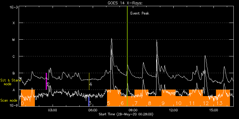 EIS Observation timeline overlay to GOES-Xray curve Code 1" 2" 40" 266" EIS Observations list for this event: STUDY ACRONYM ID DATE OBSERVED DESCRIPTION NOAA# TARGET 0 Atlas_60 | 72259 | 2020/05/29 00:38:12 | AR study | | Quiet Sun TIMELINE ID DATE OBSERVED FITS FILE XCEN (+W/-E) YCEN (+N/-S) DUR ----------------------------------------------------------------------------------------------------------------- 72259 | 2020/05/29 00:38:12.000 | eis_l0_20200529_003812.fits.gz | 754.75 | 477.34 | 1h1m40s 1 regcal074 | 72271 | 2020/05/29 02:30:10 | Dark exposures including overscan pixe | | Engineering TIMELINE ID DATE OBSERVED FITS FILE XCEN (+W/-E) YCEN (+N/-S) DUR ----------------------------------------------------------------------------------------------------------------- 72271 | 2020/05/29 02:30:10.000 | eis_l0_20200529_023010.fits.gz | 14.51 | 205.58 | 3m22s 2 regcal076 | 72272 | 2020/05/29 02:33:59 | Flatfield, 1 exposure, led 100ms, ccd | | Engineering TIMELINE ID DATE OBSERVED FITS FILE XCEN (+W/-E) YCEN (+N/-S) DUR ----------------------------------------------------------------------------------------------------------------- 72272 | 2020/05/29 02:33:59.000 | eis_l0_20200529_023359.fits.gz | 14.59 | -50.42 | 2s 3 PRY_slot_contextLITE | 72232 | 2020/05/29 05:40:19 | Point Monitoring | | Active Region TIMELINE ID DATE OBSERVED FITS FILE XCEN (+W/-E) YCEN (+N/-S) DUR ----------------------------------------------------------------------------------------------------------------- 72232 | 2020/05/29 05:40:19.000 | eis_l0_20200529_054019.fits.gz | -15.21 | -0.50 | 2m56s 4 XRT_synop_AIA | 72233 | 2020/05/29 05:43:33 | Point Monitoring | | Quiet Sun TIMELINE ID DATE OBSERVED FITS FILE XCEN (+W/-E) YCEN (+N/-S) DUR ----------------------------------------------------------------------------------------------------------------- 72233 | 2020/05/29 05:43:33.000 | eis_l0_20200529_054333.fits.gz | -132.49 | -0.50 | 11s 5 HPW021VEL260x512v1 | 72260 | 2020/05/29 07:03:53 | AR Study | | Active Region TIMELINE ID DATE OBSERVED FITS FILE XCEN (+W/-E) YCEN (+N/-S) DUR ----------------------------------------------------------------------------------------------------------------- 72260 | 2020/05/29 07:03:53.000 | eis_l0_20200529_070353.fits.gz | 819.07 | 511.49 | 1h0m44s 6 HPW021VEL260x512v1 | 72261 | 2020/05/29 08:05:10 | AR Study | | Active Region TIMELINE ID DATE OBSERVED FITS FILE XCEN (+W/-E) YCEN (+N/-S) DUR ----------------------------------------------------------------------------------------------------------------- 72261 | 2020/05/29 08:05:10.000 | eis_l0_20200529_080510.fits.gz | 798.01 | 476.34 | 1h0m45s 7 HPW021VEL260x512v1 | 72262 | 2020/05/29 09:06:27 | AR Study | | Active Region TIMELINE ID DATE OBSERVED FITS FILE XCEN (+W/-E) YCEN (+N/-S) DUR ----------------------------------------------------------------------------------------------------------------- 72262 | 2020/05/29 09:06:27.000 | eis_l0_20200529_090627.fits.gz | 797.93 | 476.26 | 1h0m45s 8 HPW021VEL260x512v1 | 72263 | 2020/05/29 10:07:19 | AR Study | | Active Region TIMELINE ID DATE OBSERVED FITS FILE XCEN (+W/-E) YCEN (+N/-S) DUR ----------------------------------------------------------------------------------------------------------------- 72263 | 2020/05/29 10:07:19.000 | eis_l0_20200529_100719.fits.gz | 797.93 | 476.26 | 1h0m45s 9 HPW021VEL260x512v1 | 72264 | 2020/05/29 11:08:11 | AR Study | | Active Region TIMELINE ID DATE OBSERVED FITS FILE XCEN (+W/-E) YCEN (+N/-S) DUR ----------------------------------------------------------------------------------------------------------------- 72264 | 2020/05/29 11:08:11.000 | eis_l0_20200529_110811.fits.gz | 798.01 | 476.34 | 1h0m44s 10 HPW021VEL260x512v1 | 72265 | 2020/05/29 12:09:02 | AR Study | | Active Region TIMELINE ID DATE OBSERVED FITS FILE XCEN (+W/-E) YCEN (+N/-S) DUR ----------------------------------------------------------------------------------------------------------------- 72265 | 2020/05/29 12:09:02.000 | eis_l0_20200529_120902.fits.gz | 797.93 | 476.26 | 1h0m45s 11 HPW021VEL260x512v1 | 72266 | 2020/05/29 13:09:54 | AR Study | | Active Region TIMELINE ID DATE OBSERVED FITS FILE XCEN (+W/-E) YCEN (+N/-S) DUR ----------------------------------------------------------------------------------------------------------------- 72266 | 2020/05/29 13:09:54.000 | eis_l0_20200529_130954.fits.gz | 797.93 | 476.41 | 1h0m45s 12 HPW021VEL260x512v1 | 72267 | 2020/05/29 14:10:46 | AR Study | | Active Region TIMELINE ID DATE OBSERVED FITS FILE XCEN (+W/-E) YCEN (+N/-S) DUR ----------------------------------------------------------------------------------------------------------------- 72267 | 2020/05/29 14:10:46.000 | eis_l0_20200529_141046.fits.gz | 797.93 | 476.18 | 1h0m45s 13 HPW021VEL260x512v1 | 72268 | 2020/05/29 15:11:37 | AR Study | | Active Region TIMELINE ID DATE OBSERVED FITS FILE XCEN (+W/-E) YCEN (+N/-S) DUR ----------------------------------------------------------------------------------------------------------------- 72268 | 2020/05/29 15:11:37.000 | eis_l0_20200529_151137.fits.gz | 798.18 | 476.11 | 1h0m45s : Check study information : Download file : View thumbnails For this event, also check for: