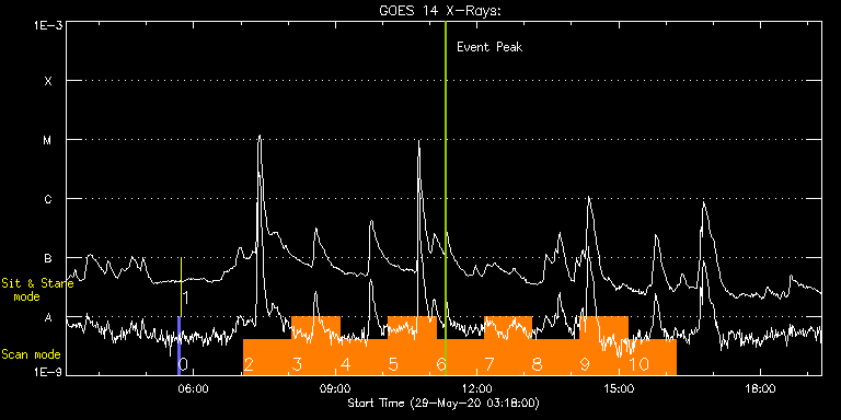 EIS Observation timeline overlay to GOES-Xray curve Code 1" 2" 40" 266" EIS Observations list for this event: STUDY ACRONYM ID DATE OBSERVED DESCRIPTION NOAA# TARGET 0 PRY_slot_contextLITE | 72232 | 2020/05/29 05:40:19 | Point Monitoring | | Active Region TIMELINE ID DATE OBSERVED FITS FILE XCEN (+W/-E) YCEN (+N/-S) DUR ----------------------------------------------------------------------------------------------------------------- 72232 | 2020/05/29 05:40:19.000 | eis_l0_20200529_054019.fits.gz | -15.21 | -0.50 | 2m56s 1 XRT_synop_AIA | 72233 | 2020/05/29 05:43:33 | Point Monitoring | | Quiet Sun TIMELINE ID DATE OBSERVED FITS FILE XCEN (+W/-E) YCEN (+N/-S) DUR ----------------------------------------------------------------------------------------------------------------- 72233 | 2020/05/29 05:43:33.000 | eis_l0_20200529_054333.fits.gz | -132.49 | -0.50 | 11s 2 HPW021VEL260x512v1 | 72260 | 2020/05/29 07:03:53 | AR Study | | Active Region TIMELINE ID DATE OBSERVED FITS FILE XCEN (+W/-E) YCEN (+N/-S) DUR ----------------------------------------------------------------------------------------------------------------- 72260 | 2020/05/29 07:03:53.000 | eis_l0_20200529_070353.fits.gz | 819.07 | 511.49 | 1h0m44s 3 HPW021VEL260x512v1 | 72261 | 2020/05/29 08:05:10 | AR Study | | Active Region TIMELINE ID DATE OBSERVED FITS FILE XCEN (+W/-E) YCEN (+N/-S) DUR ----------------------------------------------------------------------------------------------------------------- 72261 | 2020/05/29 08:05:10.000 | eis_l0_20200529_080510.fits.gz | 798.01 | 476.34 | 1h0m45s 4 HPW021VEL260x512v1 | 72262 | 2020/05/29 09:06:27 | AR Study | | Active Region TIMELINE ID DATE OBSERVED FITS FILE XCEN (+W/-E) YCEN (+N/-S) DUR ----------------------------------------------------------------------------------------------------------------- 72262 | 2020/05/29 09:06:27.000 | eis_l0_20200529_090627.fits.gz | 797.93 | 476.26 | 1h0m45s 5 HPW021VEL260x512v1 | 72263 | 2020/05/29 10:07:19 | AR Study | | Active Region TIMELINE ID DATE OBSERVED FITS FILE XCEN (+W/-E) YCEN (+N/-S) DUR ----------------------------------------------------------------------------------------------------------------- 72263 | 2020/05/29 10:07:19.000 | eis_l0_20200529_100719.fits.gz | 797.93 | 476.26 | 1h0m45s 6 HPW021VEL260x512v1 | 72264 | 2020/05/29 11:08:11 | AR Study | | Active Region TIMELINE ID DATE OBSERVED FITS FILE XCEN (+W/-E) YCEN (+N/-S) DUR ----------------------------------------------------------------------------------------------------------------- 72264 | 2020/05/29 11:08:11.000 | eis_l0_20200529_110811.fits.gz | 798.01 | 476.34 | 1h0m44s 7 HPW021VEL260x512v1 | 72265 | 2020/05/29 12:09:02 | AR Study | | Active Region TIMELINE ID DATE OBSERVED FITS FILE XCEN (+W/-E) YCEN (+N/-S) DUR ----------------------------------------------------------------------------------------------------------------- 72265 | 2020/05/29 12:09:02.000 | eis_l0_20200529_120902.fits.gz | 797.93 | 476.26 | 1h0m45s 8 HPW021VEL260x512v1 | 72266 | 2020/05/29 13:09:54 | AR Study | | Active Region TIMELINE ID DATE OBSERVED FITS FILE XCEN (+W/-E) YCEN (+N/-S) DUR ----------------------------------------------------------------------------------------------------------------- 72266 | 2020/05/29 13:09:54.000 | eis_l0_20200529_130954.fits.gz | 797.93 | 476.41 | 1h0m45s 9 HPW021VEL260x512v1 | 72267 | 2020/05/29 14:10:46 | AR Study | | Active Region TIMELINE ID DATE OBSERVED FITS FILE XCEN (+W/-E) YCEN (+N/-S) DUR ----------------------------------------------------------------------------------------------------------------- 72267 | 2020/05/29 14:10:46.000 | eis_l0_20200529_141046.fits.gz | 797.93 | 476.18 | 1h0m45s 10 HPW021VEL260x512v1 | 72268 | 2020/05/29 15:11:37 | AR Study | | Active Region TIMELINE ID DATE OBSERVED FITS FILE XCEN (+W/-E) YCEN (+N/-S) DUR ----------------------------------------------------------------------------------------------------------------- 72268 | 2020/05/29 15:11:37.000 | eis_l0_20200529_151137.fits.gz | 798.18 | 476.11 | 1h0m45s : Check study information : Download file : View thumbnails For this event, also check for: