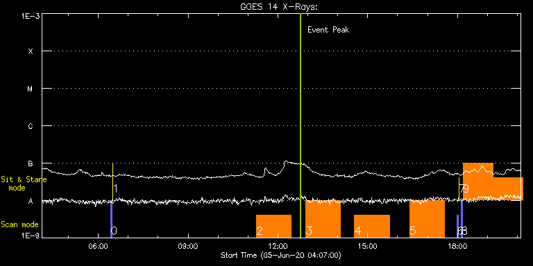 EIS Observation timeline overlay to GOES-Xray curve Code 1" 2" 40" 266" EIS Observations list for this event: STUDY ACRONYM ID DATE OBSERVED DESCRIPTION NOAA# TARGET 0 PRY_slot_contextLITE | 72338 | 2020/06/05 06:25:12 | Change of EIS pointing and alignment w | | Active Region TIMELINE ID DATE OBSERVED FITS FILE XCEN (+W/-E) YCEN (+N/-S) DUR ----------------------------------------------------------------------------------------------------------------- 72338 | 2020/06/05 06:25:12.000 | eis_l0_20200605_062512.fits.gz | -15.21 | -0.50 | 2m56s 1 XRT_synop_AIA | 72339 | 2020/06/05 06:28:27 | Change of EIS pointing and alignment w | | Quiet Sun TIMELINE ID DATE OBSERVED FITS FILE XCEN (+W/-E) YCEN (+N/-S) DUR ----------------------------------------------------------------------------------------------------------------- 72339 | 2020/06/05 06:28:27.000 | eis_l0_20200605_062827.fits.gz | -132.49 | -0.50 | 10s 2 HOP81_new_study | 72318 | 2020/06/05 11:17:21 | HOP 81 S pole | | Coronal Hole TIMELINE ID DATE OBSERVED FITS FILE XCEN (+W/-E) YCEN (+N/-S) DUR ----------------------------------------------------------------------------------------------------------------- 72318 | 2020/06/05 11:17:21.000 | eis_l0_20200605_111721.fits.gz | -35.14 | -978.38 | 1h9m44s 3 HOP81_new_study | 72319 | 2020/06/05 12:55:41 | HOP 81 S pole | | Coronal Hole TIMELINE ID DATE OBSERVED FITS FILE XCEN (+W/-E) YCEN (+N/-S) DUR ----------------------------------------------------------------------------------------------------------------- 72319 | 2020/06/05 12:55:41.000 | eis_l0_20200605_125541.fits.gz | -35.14 | -978.38 | 1h9m45s 4 HOP81_new_study | 72320 | 2020/06/05 14:33:44 | HOP 81 S pole | | Coronal Hole TIMELINE ID DATE OBSERVED FITS FILE XCEN (+W/-E) YCEN (+N/-S) DUR ----------------------------------------------------------------------------------------------------------------- 72320 | 2020/06/05 14:33:44.000 | eis_l0_20200605_143344.fits.gz | -35.14 | -978.38 | 1h9m45s 5 HOP81_new_study | 72321 | 2020/06/05 16:24:13 | HOP 81 S pole | | Coronal Hole TIMELINE ID DATE OBSERVED FITS FILE XCEN (+W/-E) YCEN (+N/-S) DUR ----------------------------------------------------------------------------------------------------------------- 72321 | 2020/06/05 16:24:13.000 | eis_l0_20200605_162413.fits.gz | -35.14 | -978.38 | 1h9m45s 6 PRY_slot_contextLITE | 72340 | 2020/06/05 17:59:20 | Change of EIS pointing and alignment w | | Active Region TIMELINE ID DATE OBSERVED FITS FILE XCEN (+W/-E) YCEN (+N/-S) DUR ----------------------------------------------------------------------------------------------------------------- 72340 | 2020/06/05 17:59:20.000 | eis_l0_20200605_175920.fits.gz | -15.21 | -0.27 | 2m56s 7 XRT_synop_AIA | 72341 | 2020/06/05 18:02:35 | Change of EIS pointing and alignment w | | Quiet Sun TIMELINE ID DATE OBSERVED FITS FILE XCEN (+W/-E) YCEN (+N/-S) DUR ----------------------------------------------------------------------------------------------------------------- 72341 | 2020/06/05 18:02:35.000 | eis_l0_20200605_180235.fits.gz | -132.49 | -0.50 | 10s 8 PRY_slot_contextLITE | 72372 | 2020/06/05 18:07:31 | AR context image | | Active Region TIMELINE ID DATE OBSERVED FITS FILE XCEN (+W/-E) YCEN (+N/-S) DUR ----------------------------------------------------------------------------------------------------------------- 72372 | 2020/06/05 18:07:31.000 | eis_l0_20200605_180731.fits.gz | -0.30 | 475.11 | 2m56s 9 Flare_SNS_v2 | 72373 | 2020/06/05 18:10:52 | SNS flare watch | | Flare TIMELINE ID DATE OBSERVED FITS FILE XCEN (+W/-E) YCEN (+N/-S) DUR ----------------------------------------------------------------------------------------------------------------- 72373 | 2020/06/05 18:10:52.000 | eis_l0_20200605_181052.fits.gz | -7.22 | 436.04 | 1h0m21s 72373 | 2020/06/05 19:11:19.000 | eis_l0_20200605_191119.fits.gz | 0.12 | 436.04 | 1h0m19s 72373 | 2020/06/05 20:11:44.000 | eis_l0_20200605_201144.fits.gz | 7.45 | 435.88 | 1h0m19s 72373 | 2020/06/05 21:12:09.000 | eis_l0_20200605_211209.fits.gz | 14.72 | 435.73 | 1h0m18s 72373 | 2020/06/05 22:12:33.000 | eis_l0_20200605_221233.fits.gz | 22.13 | 435.57 | 1h0m19s 72373 | 2020/06/05 23:12:58.000 | eis_l0_20200605_231258.fits.gz | 29.39 | 435.57 | 1h0m19s 72373 | 2020/06/06 00:13:23.000 | eis_l0_20200606_001323.fits.gz | 36.81 | 435.50 | 1h0m20s : Check study information : Download file : View thumbnails For this event, also check for: