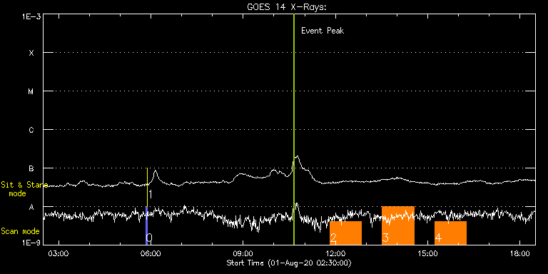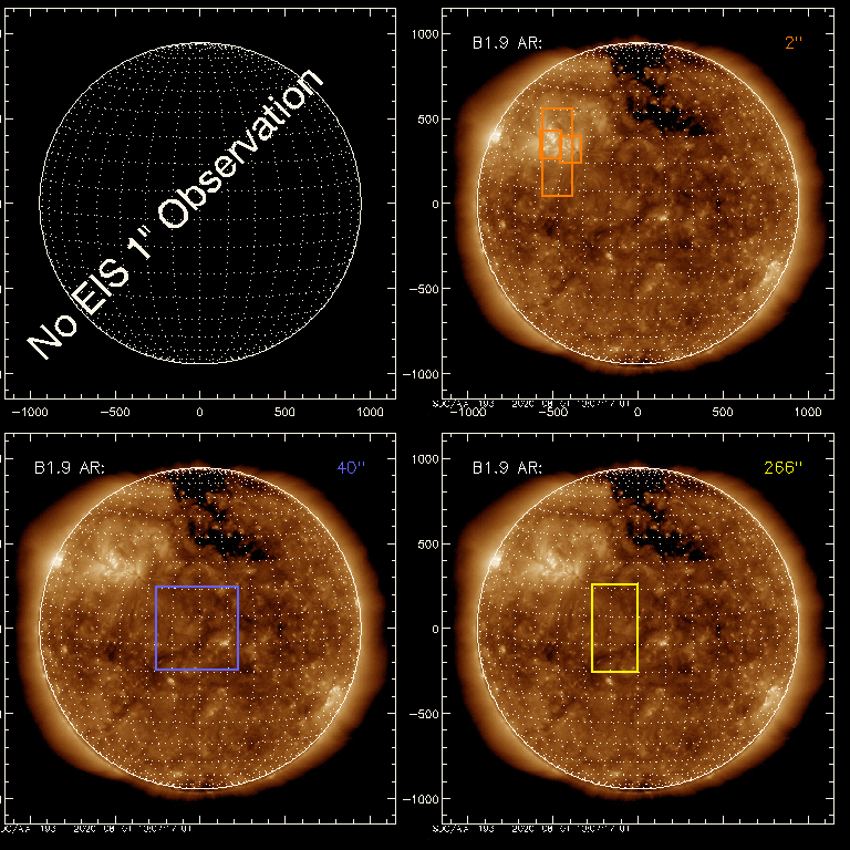 EIS Observation timeline overlay to GOES-Xray curve Code 1" 2" 40" 266" EIS Observations list for this event: STUDY ACRONYM ID DATE OBSERVED DESCRIPTION NOAA# TARGET 0 PRY_slot_contextLITE | 73326 | 2020/08/01 05:50:19 | Pointing monitoring | | Active Region TIMELINE ID DATE OBSERVED FITS FILE XCEN (+W/-E) YCEN (+N/-S) DUR ----------------------------------------------------------------------------------------------------------------- 73326 | 2020/08/01 05:50:19.000 | eis_l0_20200801_055019.fits.gz | -15.21 | -0.50 | 2m57s 1 XRT_synop_AIA | 73327 | 2020/08/01 05:53:34 | Pointing monitoring | | Quiet Sun TIMELINE ID DATE OBSERVED FITS FILE XCEN (+W/-E) YCEN (+N/-S) DUR ----------------------------------------------------------------------------------------------------------------- 73327 | 2020/08/01 05:53:34.000 | eis_l0_20200801_055334.fits.gz | -132.57 | -0.50 | 10s 2 HPW021VEL260x512v2 | 73352 | 2020/08/01 11:49:21 | AR observations | | Active Region TIMELINE ID DATE OBSERVED FITS FILE XCEN (+W/-E) YCEN (+N/-S) DUR ----------------------------------------------------------------------------------------------------------------- 73352 | 2020/08/01 11:49:21.000 | eis_l0_20200801_114921.fits.gz | -471.63 | 299.39 | 1h0m45s 3 Atlas_60 | 73379 | 2020/08/01 13:31:11 | AR observations n-B | | Quiet Sun TIMELINE ID DATE OBSERVED FITS FILE XCEN (+W/-E) YCEN (+N/-S) DUR ----------------------------------------------------------------------------------------------------------------- 73379 | 2020/08/01 13:31:11.000 | eis_l0_20200801_133111.fits.gz | -511.84 | 342.46 | 1h1m39s 4 Atlas_60 | 73354 | 2020/08/01 15:13:44 | AR observations p-B | | Quiet Sun TIMELINE ID DATE OBSERVED FITS FILE XCEN (+W/-E) YCEN (+N/-S) DUR ----------------------------------------------------------------------------------------------------------------- 73354 | 2020/08/01 15:13:44.000 | eis_l0_20200801_151344.fits.gz | -393.67 | 313.69 | 1h1m39s : Check study information : Download file : View thumbnails For this event, also check for: