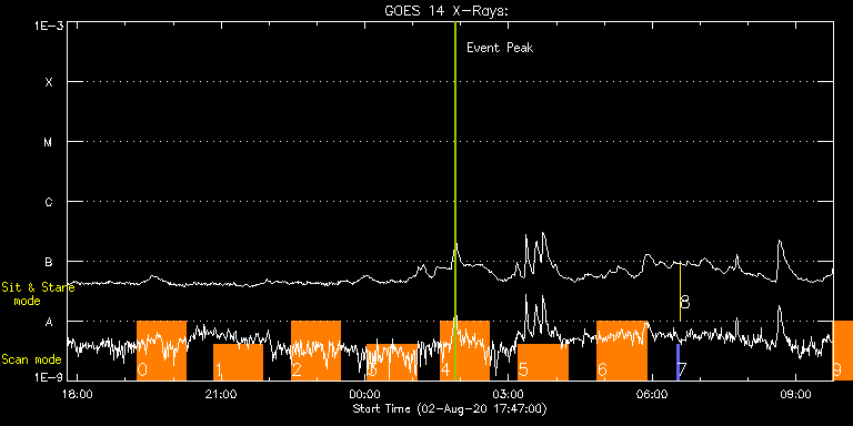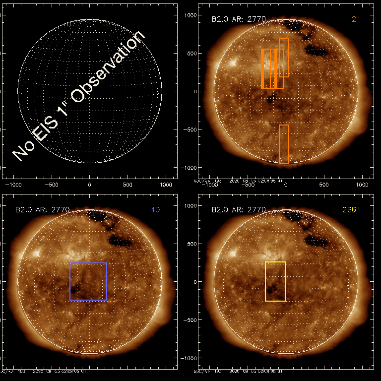 EIS Observation timeline overlay to GOES-Xray curve Code 1" 2" 40" 266" EIS Observations list for this event: STUDY ACRONYM ID DATE OBSERVED DESCRIPTION NOAA# TARGET 0 HPW021VEL260x512v2 | 73366 | 2020/08/02 19:14:43 | AR observations | | Active Region TIMELINE ID DATE OBSERVED FITS FILE XCEN (+W/-E) YCEN (+N/-S) DUR ----------------------------------------------------------------------------------------------------------------- 73366 | 2020/08/02 19:14:43.000 | eis_l0_20200802_191443.fits.gz | -232.70 | 292.96 | 1h0m45s 1 HPW021VEL260x512v2 | 73367 | 2020/08/02 20:51:13 | AR observations | | Active Region TIMELINE ID DATE OBSERVED FITS FILE XCEN (+W/-E) YCEN (+N/-S) DUR ----------------------------------------------------------------------------------------------------------------- 73367 | 2020/08/02 20:51:13.000 | eis_l0_20200802_205113.fits.gz | -219.80 | 292.73 | 1h0m44s 2 HPW021VEL260x512v2 | 73368 | 2020/08/02 22:28:13 | AR observations | | Active Region TIMELINE ID DATE OBSERVED FITS FILE XCEN (+W/-E) YCEN (+N/-S) DUR ----------------------------------------------------------------------------------------------------------------- 73368 | 2020/08/02 22:28:13.000 | eis_l0_20200802_222813.fits.gz | -207.23 | 292.42 | 1h0m45s 3 Large_CH_Map | 73342 | 2020/08/03 00:03:13 | HOP 336 North (Cycle 25 Bright Points) | | Quiet Sun TIMELINE ID DATE OBSERVED FITS FILE XCEN (+W/-E) YCEN (+N/-S) DUR ----------------------------------------------------------------------------------------------------------------- 73342 | 2020/08/03 00:03:13.000 | eis_l0_20200803_000313.fits.gz | -22.16 | 437.65 | 1h1m53s 4 Large_CH_Map | 73343 | 2020/08/03 01:34:13 | HOP 336 North (Cycle 25 Bright Points) | | Quiet Sun TIMELINE ID DATE OBSERVED FITS FILE XCEN (+W/-E) YCEN (+N/-S) DUR ----------------------------------------------------------------------------------------------------------------- 73343 | 2020/08/03 01:34:13.000 | eis_l0_20200803_013413.fits.gz | -22.16 | 437.65 | 1h1m53s 5 Large_CH_Map | 73344 | 2020/08/03 03:12:14 | HOP 336 South (Cycle 25 Bright Points) | | Quiet Sun TIMELINE ID DATE OBSERVED FITS FILE XCEN (+W/-E) YCEN (+N/-S) DUR ----------------------------------------------------------------------------------------------------------------- 73344 | 2020/08/03 03:12:14.000 | eis_l0_20200803_031214.fits.gz | -22.16 | -701.44 | 1h1m53s 6 Large_CH_Map | 73383 | 2020/08/03 04:50:44 | HOP 336 South (Cycle 25 Bright Points) | | Quiet Sun TIMELINE ID DATE OBSERVED FITS FILE XCEN (+W/-E) YCEN (+N/-S) DUR ----------------------------------------------------------------------------------------------------------------- 73383 | 2020/08/03 04:50:44.000 | eis_l0_20200803_045044.fits.gz | -22.16 | -700.29 | 1h1m53s 7 PRY_slot_contextLITE | 73348 | 2020/08/03 06:31:20 | Pointing monitoring | | Active Region TIMELINE ID DATE OBSERVED FITS FILE XCEN (+W/-E) YCEN (+N/-S) DUR ----------------------------------------------------------------------------------------------------------------- 73348 | 2020/08/03 06:31:20.000 | eis_l0_20200803_063120.fits.gz | -15.14 | -0.35 | 2m56s 8 XRT_synop_AIA | 73349 | 2020/08/03 06:34:35 | Pointing monitoring | | Quiet Sun TIMELINE ID DATE OBSERVED FITS FILE XCEN (+W/-E) YCEN (+N/-S) DUR ----------------------------------------------------------------------------------------------------------------- 73349 | 2020/08/03 06:34:35.000 | eis_l0_20200803_063435.fits.gz | -132.57 | -0.35 | 10s 9 HPW021VEL260x512v2 | 73370 | 2020/08/03 09:45:19 | AR observations | | Active Region TIMELINE ID DATE OBSERVED FITS FILE XCEN (+W/-E) YCEN (+N/-S) DUR ----------------------------------------------------------------------------------------------------------------- 73370 | 2020/08/03 09:45:19.000 | eis_l0_20200803_094519.fits.gz | -116.79 | 292.19 | 1h0m45s : Check study information : Download file : View thumbnails For this event, also check for: