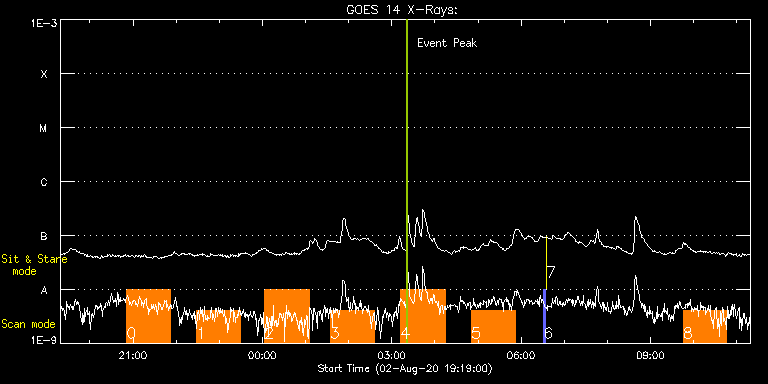 EIS Observation timeline overlay to GOES-Xray curve Code 1" 2" 40" 266" EIS Observations list for this event: STUDY ACRONYM ID DATE OBSERVED DESCRIPTION NOAA# TARGET 0 HPW021VEL260x512v2 | 73367 | 2020/08/02 20:51:13 | AR observations | | Active Region TIMELINE ID DATE OBSERVED FITS FILE XCEN (+W/-E) YCEN (+N/-S) DUR ----------------------------------------------------------------------------------------------------------------- 73367 | 2020/08/02 20:51:13.000 | eis_l0_20200802_205113.fits.gz | -219.80 | 292.73 | 1h0m44s 1 HPW021VEL260x512v2 | 73368 | 2020/08/02 22:28:13 | AR observations | | Active Region TIMELINE ID DATE OBSERVED FITS FILE XCEN (+W/-E) YCEN (+N/-S) DUR ----------------------------------------------------------------------------------------------------------------- 73368 | 2020/08/02 22:28:13.000 | eis_l0_20200802_222813.fits.gz | -207.23 | 292.42 | 1h0m45s 2 Large_CH_Map | 73342 | 2020/08/03 00:03:13 | HOP 336 North (Cycle 25 Bright Points) | | Quiet Sun TIMELINE ID DATE OBSERVED FITS FILE XCEN (+W/-E) YCEN (+N/-S) DUR ----------------------------------------------------------------------------------------------------------------- 73342 | 2020/08/03 00:03:13.000 | eis_l0_20200803_000313.fits.gz | -22.16 | 437.65 | 1h1m53s 3 Large_CH_Map | 73343 | 2020/08/03 01:34:13 | HOP 336 North (Cycle 25 Bright Points) | | Quiet Sun TIMELINE ID DATE OBSERVED FITS FILE XCEN (+W/-E) YCEN (+N/-S) DUR ----------------------------------------------------------------------------------------------------------------- 73343 | 2020/08/03 01:34:13.000 | eis_l0_20200803_013413.fits.gz | -22.16 | 437.65 | 1h1m53s 4 Large_CH_Map | 73344 | 2020/08/03 03:12:14 | HOP 336 South (Cycle 25 Bright Points) | | Quiet Sun TIMELINE ID DATE OBSERVED FITS FILE XCEN (+W/-E) YCEN (+N/-S) DUR ----------------------------------------------------------------------------------------------------------------- 73344 | 2020/08/03 03:12:14.000 | eis_l0_20200803_031214.fits.gz | -22.16 | -701.44 | 1h1m53s 5 Large_CH_Map | 73383 | 2020/08/03 04:50:44 | HOP 336 South (Cycle 25 Bright Points) | | Quiet Sun TIMELINE ID DATE OBSERVED FITS FILE XCEN (+W/-E) YCEN (+N/-S) DUR ----------------------------------------------------------------------------------------------------------------- 73383 | 2020/08/03 04:50:44.000 | eis_l0_20200803_045044.fits.gz | -22.16 | -700.29 | 1h1m53s 6 PRY_slot_contextLITE | 73348 | 2020/08/03 06:31:20 | Pointing monitoring | | Active Region TIMELINE ID DATE OBSERVED FITS FILE XCEN (+W/-E) YCEN (+N/-S) DUR ----------------------------------------------------------------------------------------------------------------- 73348 | 2020/08/03 06:31:20.000 | eis_l0_20200803_063120.fits.gz | -15.14 | -0.35 | 2m56s 7 XRT_synop_AIA | 73349 | 2020/08/03 06:34:35 | Pointing monitoring | | Quiet Sun TIMELINE ID DATE OBSERVED FITS FILE XCEN (+W/-E) YCEN (+N/-S) DUR ----------------------------------------------------------------------------------------------------------------- 73349 | 2020/08/03 06:34:35.000 | eis_l0_20200803_063435.fits.gz | -132.57 | -0.35 | 10s 8 HPW021VEL260x512v2 | 73370 | 2020/08/03 09:45:19 | AR observations | | Active Region TIMELINE ID DATE OBSERVED FITS FILE XCEN (+W/-E) YCEN (+N/-S) DUR ----------------------------------------------------------------------------------------------------------------- 73370 | 2020/08/03 09:45:19.000 | eis_l0_20200803_094519.fits.gz | -116.79 | 292.19 | 1h0m45s : Check study information : Download file : View thumbnails For this event, also check for: