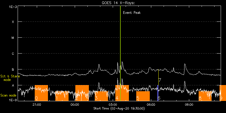 EIS Observation timeline overlay to GOES-Xray curve Code 1" 2" 40" 266" EIS Observations list for this event: STUDY ACRONYM ID DATE OBSERVED DESCRIPTION NOAA# TARGET 0 HPW021VEL260x512v2 | 73367 | 2020/08/02 20:51:13 | AR observations | | Active Region TIMELINE ID DATE OBSERVED FITS FILE XCEN (+W/-E) YCEN (+N/-S) DUR ----------------------------------------------------------------------------------------------------------------- 73367 | 2020/08/02 20:51:13.000 | eis_l0_20200802_205113.fits.gz | -219.80 | 292.73 | 1h0m44s 1 HPW021VEL260x512v2 | 73368 | 2020/08/02 22:28:13 | AR observations | | Active Region TIMELINE ID DATE OBSERVED FITS FILE XCEN (+W/-E) YCEN (+N/-S) DUR ----------------------------------------------------------------------------------------------------------------- 73368 | 2020/08/02 22:28:13.000 | eis_l0_20200802_222813.fits.gz | -207.23 | 292.42 | 1h0m45s 2 Large_CH_Map | 73342 | 2020/08/03 00:03:13 | HOP 336 North (Cycle 25 Bright Points) | | Quiet Sun TIMELINE ID DATE OBSERVED FITS FILE XCEN (+W/-E) YCEN (+N/-S) DUR ----------------------------------------------------------------------------------------------------------------- 73342 | 2020/08/03 00:03:13.000 | eis_l0_20200803_000313.fits.gz | -22.16 | 437.65 | 1h1m53s 3 Large_CH_Map | 73343 | 2020/08/03 01:34:13 | HOP 336 North (Cycle 25 Bright Points) | | Quiet Sun TIMELINE ID DATE OBSERVED FITS FILE XCEN (+W/-E) YCEN (+N/-S) DUR ----------------------------------------------------------------------------------------------------------------- 73343 | 2020/08/03 01:34:13.000 | eis_l0_20200803_013413.fits.gz | -22.16 | 437.65 | 1h1m53s 4 Large_CH_Map | 73344 | 2020/08/03 03:12:14 | HOP 336 South (Cycle 25 Bright Points) | | Quiet Sun TIMELINE ID DATE OBSERVED FITS FILE XCEN (+W/-E) YCEN (+N/-S) DUR ----------------------------------------------------------------------------------------------------------------- 73344 | 2020/08/03 03:12:14.000 | eis_l0_20200803_031214.fits.gz | -22.16 | -701.44 | 1h1m53s 5 Large_CH_Map | 73383 | 2020/08/03 04:50:44 | HOP 336 South (Cycle 25 Bright Points) | | Quiet Sun TIMELINE ID DATE OBSERVED FITS FILE XCEN (+W/-E) YCEN (+N/-S) DUR ----------------------------------------------------------------------------------------------------------------- 73383 | 2020/08/03 04:50:44.000 | eis_l0_20200803_045044.fits.gz | -22.16 | -700.29 | 1h1m53s 6 PRY_slot_contextLITE | 73348 | 2020/08/03 06:31:20 | Pointing monitoring | | Active Region TIMELINE ID DATE OBSERVED FITS FILE XCEN (+W/-E) YCEN (+N/-S) DUR ----------------------------------------------------------------------------------------------------------------- 73348 | 2020/08/03 06:31:20.000 | eis_l0_20200803_063120.fits.gz | -15.14 | -0.35 | 2m56s 7 XRT_synop_AIA | 73349 | 2020/08/03 06:34:35 | Pointing monitoring | | Quiet Sun TIMELINE ID DATE OBSERVED FITS FILE XCEN (+W/-E) YCEN (+N/-S) DUR ----------------------------------------------------------------------------------------------------------------- 73349 | 2020/08/03 06:34:35.000 | eis_l0_20200803_063435.fits.gz | -132.57 | -0.35 | 10s 8 HPW021VEL260x512v2 | 73370 | 2020/08/03 09:45:19 | AR observations | | Active Region TIMELINE ID DATE OBSERVED FITS FILE XCEN (+W/-E) YCEN (+N/-S) DUR ----------------------------------------------------------------------------------------------------------------- 73370 | 2020/08/03 09:45:19.000 | eis_l0_20200803_094519.fits.gz | -116.79 | 292.19 | 1h0m45s 9 HPW021VEL260x512v2 | 73371 | 2020/08/03 11:24:41 | AR observations | | Active Region TIMELINE ID DATE OBSERVED FITS FILE XCEN (+W/-E) YCEN (+N/-S) DUR ----------------------------------------------------------------------------------------------------------------- 73371 | 2020/08/03 11:24:41.000 | eis_l0_20200803_112441.fits.gz | -103.42 | 292.27 | 1h0m44s : Check study information : Download file : View thumbnails For this event, also check for: