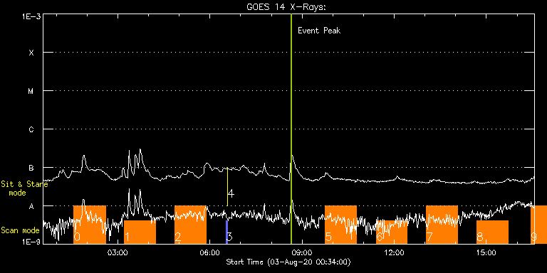 EIS Observation timeline overlay to GOES-Xray curve Code 1" 2" 40" 266" EIS Observations list for this event: STUDY ACRONYM ID DATE OBSERVED DESCRIPTION NOAA# TARGET 0 Large_CH_Map | 73343 | 2020/08/03 01:34:13 | HOP 336 North (Cycle 25 Bright Points) | | Quiet Sun TIMELINE ID DATE OBSERVED FITS FILE XCEN (+W/-E) YCEN (+N/-S) DUR ----------------------------------------------------------------------------------------------------------------- 73343 | 2020/08/03 01:34:13.000 | eis_l0_20200803_013413.fits.gz | -22.16 | 437.65 | 1h1m53s 1 Large_CH_Map | 73344 | 2020/08/03 03:12:14 | HOP 336 South (Cycle 25 Bright Points) | | Quiet Sun TIMELINE ID DATE OBSERVED FITS FILE XCEN (+W/-E) YCEN (+N/-S) DUR ----------------------------------------------------------------------------------------------------------------- 73344 | 2020/08/03 03:12:14.000 | eis_l0_20200803_031214.fits.gz | -22.16 | -701.44 | 1h1m53s 2 Large_CH_Map | 73383 | 2020/08/03 04:50:44 | HOP 336 South (Cycle 25 Bright Points) | | Quiet Sun TIMELINE ID DATE OBSERVED FITS FILE XCEN (+W/-E) YCEN (+N/-S) DUR ----------------------------------------------------------------------------------------------------------------- 73383 | 2020/08/03 04:50:44.000 | eis_l0_20200803_045044.fits.gz | -22.16 | -700.29 | 1h1m53s 3 PRY_slot_contextLITE | 73348 | 2020/08/03 06:31:20 | Pointing monitoring | | Active Region TIMELINE ID DATE OBSERVED FITS FILE XCEN (+W/-E) YCEN (+N/-S) DUR ----------------------------------------------------------------------------------------------------------------- 73348 | 2020/08/03 06:31:20.000 | eis_l0_20200803_063120.fits.gz | -15.14 | -0.35 | 2m56s 4 XRT_synop_AIA | 73349 | 2020/08/03 06:34:35 | Pointing monitoring | | Quiet Sun TIMELINE ID DATE OBSERVED FITS FILE XCEN (+W/-E) YCEN (+N/-S) DUR ----------------------------------------------------------------------------------------------------------------- 73349 | 2020/08/03 06:34:35.000 | eis_l0_20200803_063435.fits.gz | -132.57 | -0.35 | 10s 5 HPW021VEL260x512v2 | 73370 | 2020/08/03 09:45:19 | AR observations | | Active Region TIMELINE ID DATE OBSERVED FITS FILE XCEN (+W/-E) YCEN (+N/-S) DUR ----------------------------------------------------------------------------------------------------------------- 73370 | 2020/08/03 09:45:19.000 | eis_l0_20200803_094519.fits.gz | -116.79 | 292.19 | 1h0m45s 6 HPW021VEL260x512v2 | 73371 | 2020/08/03 11:24:41 | AR observations | | Active Region TIMELINE ID DATE OBSERVED FITS FILE XCEN (+W/-E) YCEN (+N/-S) DUR ----------------------------------------------------------------------------------------------------------------- 73371 | 2020/08/03 11:24:41.000 | eis_l0_20200803_112441.fits.gz | -103.42 | 292.27 | 1h0m44s 7 Atlas_60 | 73382 | 2020/08/03 13:02:41 | AR observations p-N | | Quiet Sun TIMELINE ID DATE OBSERVED FITS FILE XCEN (+W/-E) YCEN (+N/-S) DUR ----------------------------------------------------------------------------------------------------------------- 73382 | 2020/08/03 13:02:41.000 | eis_l0_20200803_130241.fits.gz | -179.90 | 329.11 | 1h1m39s 8 Atlas_60 | 73373 | 2020/08/03 14:41:10 | AR observations p-B | | Quiet Sun TIMELINE ID DATE OBSERVED FITS FILE XCEN (+W/-E) YCEN (+N/-S) DUR ----------------------------------------------------------------------------------------------------------------- 73373 | 2020/08/03 14:41:10.000 | eis_l0_20200803_144110.fits.gz | -29.33 | 311.96 | 1h1m39s 9 HPW021VEL260x512v2 | 73374 | 2020/08/03 16:26:43 | AR observations | | Active Region TIMELINE ID DATE OBSERVED FITS FILE XCEN (+W/-E) YCEN (+N/-S) DUR ----------------------------------------------------------------------------------------------------------------- 73374 | 2020/08/03 16:26:43.000 | eis_l0_20200803_162643.fits.gz | -63.12 | 292.88 | 1h0m45s : Check study information : Download file : View thumbnails For this event, also check for: