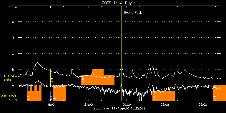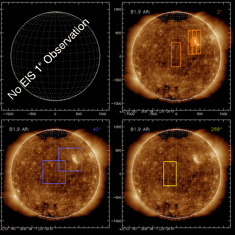 EIS Observation timeline overlay to GOES-Xray curve Code 1" 2" 40" 266" EIS Observations list for this event: STUDY ACRONYM ID DATE OBSERVED DESCRIPTION NOAA# TARGET 0 PRY_slot_context_v3 | 73506 | 2020/08/11 16:07:43 | Context raster for sunspot study | 2770 | Active Region TIMELINE ID DATE OBSERVED FITS FILE XCEN (+W/-E) YCEN (+N/-S) DUR ----------------------------------------------------------------------------------------------------------------- 73506 | 2020/08/11 16:07:43.000 | eis_l0_20200811_160743.fits.gz | 316.48 | 297.62 | 2m56s 1 Cool_loop_response | 73507 | 2020/08/11 16:11:05 | Sunspot loop study | | Active Region TIMELINE ID DATE OBSERVED FITS FILE XCEN (+W/-E) YCEN (+N/-S) DUR ----------------------------------------------------------------------------------------------------------------- 73507 | 2020/08/11 16:11:05.000 | eis_l0_20200811_161105.fits.gz | 341.92 | 280.39 | 10m48s 73507 | 2020/08/11 16:21:56.000 | eis_l0_20200811_162156.fits.gz | 343.15 | 280.54 | 10m48s 73507 | 2020/08/11 16:32:47.000 | eis_l0_20200811_163247.fits.gz | 344.55 | 280.70 | 10m48s 73507 | 2020/08/11 16:43:38.000 | eis_l0_20200811_164338.fits.gz | 345.86 | 280.70 | 10m49s 73507 | 2020/08/11 16:54:30.000 | eis_l0_20200811_165430.fits.gz | 347.17 | 280.77 | 10m48s 73507 | 2020/08/11 17:05:21.000 | eis_l0_20200811_170521.fits.gz | 348.48 | 280.93 | 10m48s 2 PRY_slot_contextLITE | 73515 | 2020/08/11 17:56:00 | Pointing monitoring | | Active Region TIMELINE ID DATE OBSERVED FITS FILE XCEN (+W/-E) YCEN (+N/-S) DUR ----------------------------------------------------------------------------------------------------------------- 73515 | 2020/08/11 17:56:00.000 | eis_l0_20200811_175600.fits.gz | -20.78 | 31.27 | 2m56s 3 XRT_synop_AIA | 73516 | 2020/08/11 17:59:15 | Pointing Monitoring | | Quiet Sun TIMELINE ID DATE OBSERVED FITS FILE XCEN (+W/-E) YCEN (+N/-S) DUR ----------------------------------------------------------------------------------------------------------------- 73516 | 2020/08/11 17:59:15.000 | eis_l0_20200811_175915.fits.gz | -132.49 | -0.50 | 10s 4 HPW021VEL260x512v2 | 73517 | 2020/08/11 18:11:17 | Active region study (AR 12770) | 2770 | Active Region TIMELINE ID DATE OBSERVED FITS FILE XCEN (+W/-E) YCEN (+N/-S) DUR ----------------------------------------------------------------------------------------------------------------- 73517 | 2020/08/11 18:11:17.000 | eis_l0_20200811_181117.fits.gz | 343.01 | 295.24 | 1h0m49s 5 TimeLag_quietAR_QS | 73512 | 2020/08/11 20:25:53 | Active region time lag study | | Active Region TIMELINE ID DATE OBSERVED FITS FILE XCEN (+W/-E) YCEN (+N/-S) DUR ----------------------------------------------------------------------------------------------------------------- 73512 | 2020/08/11 20:25:53.000 | eis_l0_20200811_202553.fits.gz | 337.34 | 320.16 | 51m57s 73512 | 2020/08/11 21:17:53.000 | eis_l0_20200811_211753.fits.gz | 343.76 | 320.39 | 51m58s 73512 | 2020/08/11 22:09:53.000 | eis_l0_20200811_220953.fits.gz | 349.93 | 320.63 | 51m57s 6 CH_FunnelsFIP | 73518 | 2020/08/12 02:02:48 | CH_FunnelsFIP test | | Coronal Hole TIMELINE ID DATE OBSERVED FITS FILE XCEN (+W/-E) YCEN (+N/-S) DUR ----------------------------------------------------------------------------------------------------------------- 73518 | 2020/08/12 02:02:48.000 | eis_l0_20200812_020248.fits.gz | -5.79 | 31.42 | 1h43m10s 7 HPW021VEL260x512v2 | 73519 | 2020/08/12 06:49:12 | Active region study (AR 12770) | | Active Region TIMELINE ID DATE OBSERVED FITS FILE XCEN (+W/-E) YCEN (+N/-S) DUR ----------------------------------------------------------------------------------------------------------------- 73519 | 2020/08/12 06:49:12.000 | eis_l0_20200812_064912.fits.gz | 432.70 | 300.41 | 1h0m45s : Check study information : Download file : View thumbnails For this event, also check for: