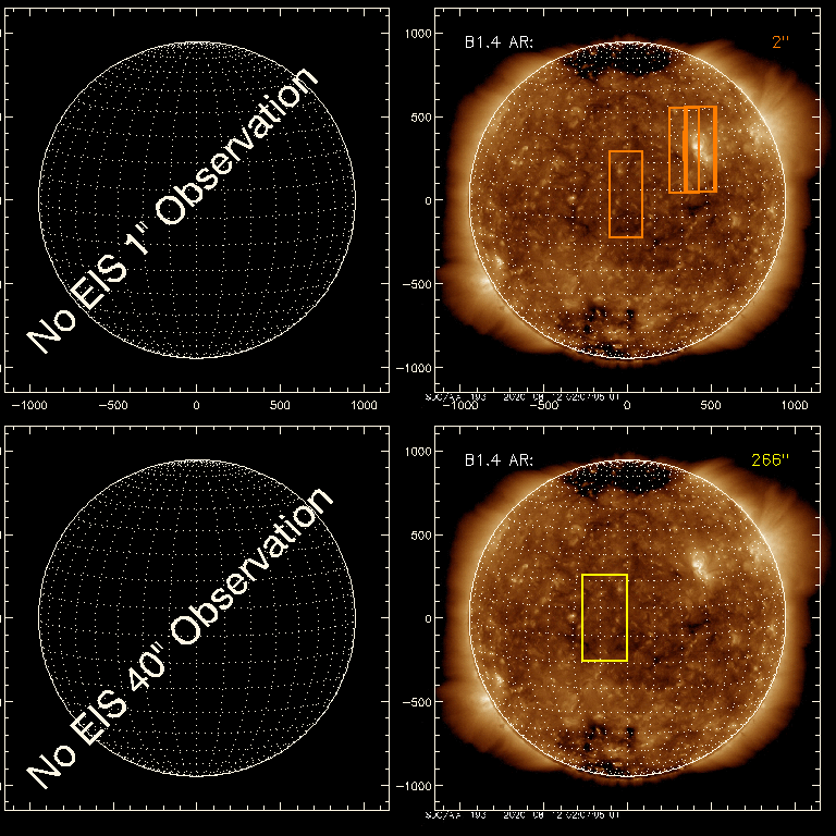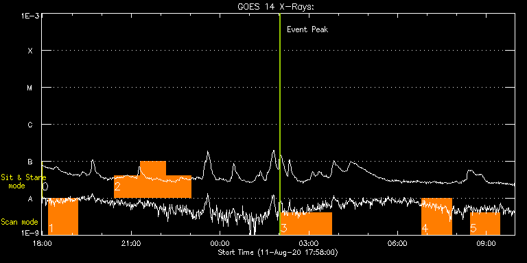 EIS Observation timeline overlay to GOES-Xray curve Code 1" 2" 40" 266" EIS Observations list for this event: STUDY ACRONYM ID DATE OBSERVED DESCRIPTION NOAA# TARGET 0 XRT_synop_AIA | 73516 | 2020/08/11 17:59:15 | Pointing Monitoring | | Quiet Sun TIMELINE ID DATE OBSERVED FITS FILE XCEN (+W/-E) YCEN (+N/-S) DUR ----------------------------------------------------------------------------------------------------------------- 73516 | 2020/08/11 17:59:15.000 | eis_l0_20200811_175915.fits.gz | -132.49 | -0.50 | 10s 1 HPW021VEL260x512v2 | 73517 | 2020/08/11 18:11:17 | Active region study (AR 12770) | 2770 | Active Region TIMELINE ID DATE OBSERVED FITS FILE XCEN (+W/-E) YCEN (+N/-S) DUR ----------------------------------------------------------------------------------------------------------------- 73517 | 2020/08/11 18:11:17.000 | eis_l0_20200811_181117.fits.gz | 343.01 | 295.24 | 1h0m49s 2 TimeLag_quietAR_QS | 73512 | 2020/08/11 20:25:53 | Active region time lag study | | Active Region TIMELINE ID DATE OBSERVED FITS FILE XCEN (+W/-E) YCEN (+N/-S) DUR ----------------------------------------------------------------------------------------------------------------- 73512 | 2020/08/11 20:25:53.000 | eis_l0_20200811_202553.fits.gz | 337.34 | 320.16 | 51m57s 73512 | 2020/08/11 21:17:53.000 | eis_l0_20200811_211753.fits.gz | 343.76 | 320.39 | 51m58s 73512 | 2020/08/11 22:09:53.000 | eis_l0_20200811_220953.fits.gz | 349.93 | 320.63 | 51m57s 3 CH_FunnelsFIP | 73518 | 2020/08/12 02:02:48 | CH_FunnelsFIP test | | Coronal Hole TIMELINE ID DATE OBSERVED FITS FILE XCEN (+W/-E) YCEN (+N/-S) DUR ----------------------------------------------------------------------------------------------------------------- 73518 | 2020/08/12 02:02:48.000 | eis_l0_20200812_020248.fits.gz | -5.79 | 31.42 | 1h43m10s 4 HPW021VEL260x512v2 | 73519 | 2020/08/12 06:49:12 | Active region study (AR 12770) | | Active Region TIMELINE ID DATE OBSERVED FITS FILE XCEN (+W/-E) YCEN (+N/-S) DUR ----------------------------------------------------------------------------------------------------------------- 73519 | 2020/08/12 06:49:12.000 | eis_l0_20200812_064912.fits.gz | 432.70 | 300.41 | 1h0m45s 5 HPW021VEL260x512v2 | 73531 | 2020/08/12 08:26:54 | Active region study (AR 12770) | | Active Region TIMELINE ID DATE OBSERVED FITS FILE XCEN (+W/-E) YCEN (+N/-S) DUR ----------------------------------------------------------------------------------------------------------------- 73531 | 2020/08/12 08:26:54.000 | eis_l0_20200812_082654.fits.gz | 443.82 | 301.26 | 1h0m46s : Check study information : Download file : View thumbnails For this event, also check for: