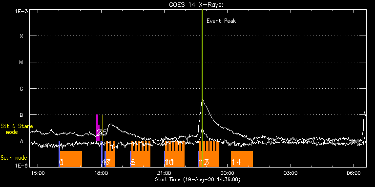 EIS Observation timeline overlay to GOES-Xray curve Code 1" 2" 40" 266" EIS Observations list for this event: STUDY ACRONYM ID DATE OBSERVED DESCRIPTION NOAA# TARGET 0 PRY_slot_contextLITE | 73731 | 2020/08/19 15:59:50 | AR observation | | Active Region TIMELINE ID DATE OBSERVED FITS FILE XCEN (+W/-E) YCEN (+N/-S) DUR ----------------------------------------------------------------------------------------------------------------- 73731 | 2020/08/19 15:59:50.000 | eis_l0_20200819_155950.fits.gz | 134.15 | -576.22 | 2m56s 1 Atlas_60 | 73732 | 2020/08/19 16:03:11 | AR observation | | Quiet Sun TIMELINE ID DATE OBSERVED FITS FILE XCEN (+W/-E) YCEN (+N/-S) DUR ----------------------------------------------------------------------------------------------------------------- 73732 | 2020/08/19 16:03:11.000 | eis_l0_20200819_160311.fits.gz | 149.36 | -576.22 | 1h1m40s 2 regcal071 | 73716 | 2020/08/19 17:47:11 | Dark exposures, CCD bottom rows (100s | | Engineering TIMELINE ID DATE OBSERVED FITS FILE XCEN (+W/-E) YCEN (+N/-S) DUR ----------------------------------------------------------------------------------------------------------------- 73716 | 2020/08/19 17:47:11.000 | eis_l0_20200819_174711.fits.gz | 188.32 | -915.83 | 3m22s 3 regcal072 | 73717 | 2020/08/19 17:51:00 | Dark exposures, top CCD rows (100s exp | | Engineering TIMELINE ID DATE OBSERVED FITS FILE XCEN (+W/-E) YCEN (+N/-S) DUR ----------------------------------------------------------------------------------------------------------------- 73717 | 2020/08/19 17:51:00.000 | eis_l0_20200819_175100.fits.gz | 188.86 | -404.91 | 3m22s 4 PRY_slot_contextLITE | 73714 | 2020/08/19 18:00:51 | pointing monitoring | | Active Region TIMELINE ID DATE OBSERVED FITS FILE XCEN (+W/-E) YCEN (+N/-S) DUR ----------------------------------------------------------------------------------------------------------------- 73714 | 2020/08/19 18:00:51.000 | eis_l0_20200819_180051.fits.gz | -15.37 | -0.42 | 2m56s 5 XRT_synop_AIA | 73715 | 2020/08/19 18:04:06 | pointing monitoring | | Quiet Sun TIMELINE ID DATE OBSERVED FITS FILE XCEN (+W/-E) YCEN (+N/-S) DUR ----------------------------------------------------------------------------------------------------------------- 73715 | 2020/08/19 18:04:06.000 | eis_l0_20200819_180406.fits.gz | -132.57 | -0.42 | 10s 6 PRY_slot_contextLITE | 73733 | 2020/08/19 18:10:57 | HOP 396 Collaboration with Chandarayan | | Active Region TIMELINE ID DATE OBSERVED FITS FILE XCEN (+W/-E) YCEN (+N/-S) DUR ----------------------------------------------------------------------------------------------------------------- 73733 | 2020/08/19 18:10:57.000 | eis_l0_20200819_181057.fits.gz | 150.38 | -576.91 | 2m56s 7 cam_flare_hot1_study | 73734 | 2020/08/19 18:14:18 | HOP 396 Collaboration with Chandarayan | | Flare TIMELINE ID DATE OBSERVED FITS FILE XCEN (+W/-E) YCEN (+N/-S) DUR ----------------------------------------------------------------------------------------------------------------- 73734 | 2020/08/19 18:14:18.000 | eis_l0_20200819_181418.fits.gz | 164.58 | -575.68 | 4m50s 73734 | 2020/08/19 18:19:11.000 | eis_l0_20200819_181911.fits.gz | 165.12 | -575.91 | 4m50s 73734 | 2020/08/19 18:24:04.000 | eis_l0_20200819_182404.fits.gz | 165.74 | -575.76 | 4m50s 73734 | 2020/08/19 18:28:56.000 | eis_l0_20200819_182856.fits.gz | 166.28 | -575.91 | 4m50s 73734 | 2020/08/19 18:33:49.000 | eis_l0_20200819_183349.fits.gz | 166.82 | -575.68 | 4m50s 8 PRY_slot_contextLITE | 73735 | 2020/08/19 19:22:50 | HOP 396 Collaboration with Chandarayan | | Active Region TIMELINE ID DATE OBSERVED FITS FILE XCEN (+W/-E) YCEN (+N/-S) DUR ----------------------------------------------------------------------------------------------------------------- 73735 | 2020/08/19 19:22:50.000 | eis_l0_20200819_192250.fits.gz | 159.03 | -576.52 | 2m56s 9 cam_flare_hot1_study | 73736 | 2020/08/19 19:26:11 | HOP 396 Collaboration with Chandarayan | | Flare TIMELINE ID DATE OBSERVED FITS FILE XCEN (+W/-E) YCEN (+N/-S) DUR ----------------------------------------------------------------------------------------------------------------- 73736 | 2020/08/19 19:26:11.000 | eis_l0_20200819_192611.fits.gz | 173.23 | -575.76 | 4m50s 73736 | 2020/08/19 19:31:03.000 | eis_l0_20200819_193103.fits.gz | 173.85 | -575.45 | 4m50s 73736 | 2020/08/19 19:35:56.000 | eis_l0_20200819_193556.fits.gz | 174.39 | -575.60 | 4m50s 73736 | 2020/08/19 19:40:49.000 | eis_l0_20200819_194049.fits.gz | 175.01 | -575.52 | 4m50s 73736 | 2020/08/19 19:45:42.000 | eis_l0_20200819_194542.fits.gz | 175.63 | -575.68 | 4m50s 73736 | 2020/08/19 19:50:35.000 | eis_l0_20200819_195035.fits.gz | 176.24 | -575.45 | 4m50s 73736 | 2020/08/19 19:55:28.000 | eis_l0_20200819_195528.fits.gz | 176.86 | -575.45 | 4m50s 73736 | 2020/08/19 20:00:21.000 | eis_l0_20200819_200021.fits.gz | 177.48 | -575.37 | 4m50s 73736 | 2020/08/19 20:05:13.000 | eis_l0_20200819_200513.fits.gz | 178.10 | -575.45 | 4m50s 73736 | 2020/08/19 20:10:06.000 | eis_l0_20200819_201006.fits.gz | 178.64 | -575.45 | 4m50s 73736 | 2020/08/19 20:14:59.000 | eis_l0_20200819_201459.fits.gz | 179.26 | -575.37 | 4m50s 10 PRY_slot_contextLITE | 73737 | 2020/08/19 20:59:49 | HOP 396 Collaboration with Chandarayan | | Active Region TIMELINE ID DATE OBSERVED FITS FILE XCEN (+W/-E) YCEN (+N/-S) DUR ----------------------------------------------------------------------------------------------------------------- 73737 | 2020/08/19 20:59:49.000 | eis_l0_20200819_205949.fits.gz | 170.92 | -576.22 | 2m57s 11 cam_flare_hot1_study | 73738 | 2020/08/19 21:03:11 | HOP 396 Collaboration with Chandarayan | | Flare TIMELINE ID DATE OBSERVED FITS FILE XCEN (+W/-E) YCEN (+N/-S) DUR ----------------------------------------------------------------------------------------------------------------- 73738 | 2020/08/19 21:03:11.000 | eis_l0_20200819_210311.fits.gz | 185.05 | -575.29 | 4m50s 73738 | 2020/08/19 21:08:04.000 | eis_l0_20200819_210804.fits.gz | 185.67 | -575.22 | 4m50s 73738 | 202