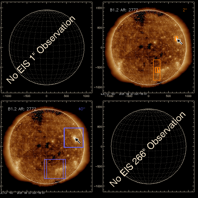 EIS Observation timeline overlay to GOES-Xray curve Code 1" 2" 40" 266" EIS Observations list for this event: STUDY ACRONYM ID DATE OBSERVED DESCRIPTION NOAA# TARGET 0 PRY_slot_contextLITE | 73739 | 2020/08/19 22:36:49 | HOP 396 Collaboration with Chandarayan | | Active Region TIMELINE ID DATE OBSERVED FITS FILE XCEN (+W/-E) YCEN (+N/-S) DUR ----------------------------------------------------------------------------------------------------------------- 73739 | 2020/08/19 22:36:49.000 | eis_l0_20200819_223649.fits.gz | 182.74 | -575.83 | 2m57s 1 cam_flare_hot1_study | 73740 | 2020/08/19 22:40:11 | HOP 396 Collaboration with Chandarayan | | Flare TIMELINE ID DATE OBSERVED FITS FILE XCEN (+W/-E) YCEN (+N/-S) DUR ----------------------------------------------------------------------------------------------------------------- 73740 | 2020/08/19 22:40:11.000 | eis_l0_20200819_224011.fits.gz | 196.95 | -574.83 | 4m50s 73740 | 2020/08/19 22:45:04.000 | eis_l0_20200819_224504.fits.gz | 197.56 | -574.91 | 4m50s 73740 | 2020/08/19 22:49:57.000 | eis_l0_20200819_224957.fits.gz | 198.10 | -574.83 | 4m50s 73740 | 2020/08/19 22:54:50.000 | eis_l0_20200819_225450.fits.gz | 198.65 | -574.83 | 4m50s 73740 | 2020/08/19 22:59:42.000 | eis_l0_20200819_225942.fits.gz | 199.34 | -574.60 | 4m51s 73740 | 2020/08/19 23:04:35.000 | eis_l0_20200819_230435.fits.gz | 199.88 | -574.83 | 4m50s 73740 | 2020/08/19 23:09:28.000 | eis_l0_20200819_230928.fits.gz | 200.42 | -574.67 | 4m50s 73740 | 2020/08/19 23:14:21.000 | eis_l0_20200819_231421.fits.gz | 201.04 | -574.67 | 4m50s 73740 | 2020/08/19 23:19:14.000 | eis_l0_20200819_231914.fits.gz | 201.66 | -574.83 | 4m50s 73740 | 2020/08/19 23:24:06.000 | eis_l0_20200819_232406.fits.gz | 202.28 | -574.52 | 4m50s 73740 | 2020/08/19 23:28:59.000 | eis_l0_20200819_232859.fits.gz | 202.89 | -574.75 | 4m50s 2 HPW021VEL260x512v2 | 73741 | 2020/08/20 00:11:13 | AR observation | | Active Region TIMELINE ID DATE OBSERVED FITS FILE XCEN (+W/-E) YCEN (+N/-S) DUR ----------------------------------------------------------------------------------------------------------------- 73741 | 2020/08/20 00:11:13.000 | eis_l0_20200820_001113.fits.gz | 208.66 | -574.37 | 1h0m44s 3 PRY_slot_contextLITE | 73742 | 2020/08/20 06:47:49 | HOP 396 Collaboration with Chandarayan | | Active Region TIMELINE ID DATE OBSERVED FITS FILE XCEN (+W/-E) YCEN (+N/-S) DUR ----------------------------------------------------------------------------------------------------------------- 73742 | 2020/08/20 06:47:49.000 | eis_l0_20200820_064749.fits.gz | 241.68 | -573.67 | 2m57s 4 cam_flare_hot1_study | 73743 | 2020/08/20 06:51:11 | HOP 396 Collaboration with Chandarayan | | Flare TIMELINE ID DATE OBSERVED FITS FILE XCEN (+W/-E) YCEN (+N/-S) DUR ----------------------------------------------------------------------------------------------------------------- 73743 | 2020/08/20 06:51:11.000 | eis_l0_20200820_065111.fits.gz | 255.73 | -572.59 | 4m50s 73743 | 2020/08/20 06:56:04.000 | eis_l0_20200820_065604.fits.gz | 256.35 | -572.74 | 4m50s 73743 | 2020/08/20 07:00:56.000 | eis_l0_20200820_070056.fits.gz | 256.97 | -572.67 | 4m50s 73743 | 2020/08/20 07:05:49.000 | eis_l0_20200820_070549.fits.gz | 257.43 | -572.67 | 4m50s 73743 | 2020/08/20 07:10:42.000 | eis_l0_20200820_071042.fits.gz | 257.97 | -572.51 | 4m50s 73743 | 2020/08/20 07:15:35.000 | eis_l0_20200820_071535.fits.gz | 258.59 | -572.51 | 4m50s 73743 | 2020/08/20 07:20:28.000 | eis_l0_20200820_072028.fits.gz | 259.21 | -572.51 | 4m50s 5 PRY_slot_contextLITE | 73746 | 2020/08/20 11:29:21 | HOP 396 Collaboration with Chandarayan | 2772 | Active Region TIMELINE ID DATE OBSERVED FITS FILE XCEN (+W/-E) YCEN (+N/-S) DUR ----------------------------------------------------------------------------------------------------------------- 73746 | 2020/08/20 11:29:21.000 | eis_l0_20200820_112921.fits.gz | 682.17 | 216.03 | 2m56s 6 cam_flare_hot1_study | 73747 | 2020/08/20 11:32:43 | HOP 396 Collaboration with Chandarayan | | Flare TIMELINE ID DATE OBSERVED FITS FILE XCEN (+W/-E) YCEN (+N/-S) DUR ----------------------------------------------------------------------------------------------------------------- 73747 | 2020/08/20 11:32:43.000 | eis_l0_20200820_113243.fits.gz | 696.14 | 215.96 | 4m50s 73747 | 2020/08/20 11:37:36.000 | eis_l0_20200820_113736.fits.gz | 696.68 | 216.03 | 4m50s 73747 | 2020/08/20 11:42:29.000 | eis_l0_20200820_114229.fits.gz | 697.14 | 216.03 | 4m50s 73747 | 2020/08/20 11:47:21.000 | eis_l0_20200820_114721.fits.gz | 697.53 | 216.19 | 4m51s 73747 | 2020/08/20 11:52:14.000 | eis_l0_20200820_115214.fits.gz | 697.99 | 216.03 | 4m51s 73747 | 2020/08/20 11:57:07.000 | eis_l0_20200820_115707.fits.gz | 698.46 | 216.19 | 4m50s 73747 | 2020/08/20 12:02:00.000 | eis_l0_20200820_120200.fits.gz | 698.92 | 216.34 | 4m50s 73747 | 2020/08/20 12:06:53.000 | eis_l0_20200820_120653.fits.gz | 699.30 | 216.42 | 4m50s 73747 | 2020/08/20 12:11:46.000 | eis_l0_20200820_121146.fits.gz | 699.85 | 216.34 | 4m50s 73747 | 2020/08/20 12:16:38.000 | eis_l0_20200820_121638.fits.gz | 700.31 | 216.49 | 4m51s 73747 | 2020/08/20 12:21:31.000 | eis_l0_20200820_122131.fits.gz | 700.85 | 216.49 | 4m50s 73747 | 2020/08/20 12:26:24.000 | eis_l0_20200820_122624.fits.gz | 701.24 | 216.49 | 4m50s 73747 | 2020/08/20 12:31:17.000 | eis_l0_20200820_123117.fits.gz | 701.62 | 216.57 | 4m50s 73747 | 2020/08/20 12:36:10.000 | eis_l0_20200820_123610.fits.gz | 702.01 | 216.80 | 4m51s 7 PRY_slot_contextLITE | 73748 | 2020/08/20 13:08:20 | HOP 396 Collaboration with Chandarayan | 2772 | Active Region TIMELINE ID DATE OBSERVED FITS FILE XCEN (+W/-E) YCEN (+N/-S) DUR ----------------------------------------------------------------------------------------------------------------- 73748 | 2020/08/20 13:08:20.000 | eis_l0_20200820_130820.fits.gz | 691.28 | 217.11 | 2m57s 8 cam_flare_hot1_study | 73749 | 2020/08/20 13:11:42 | HOP 396 Collaboration with Chandarayan | | Flare TIMELINE ID DATE OBSERVED FITS FILE XCEN (+W