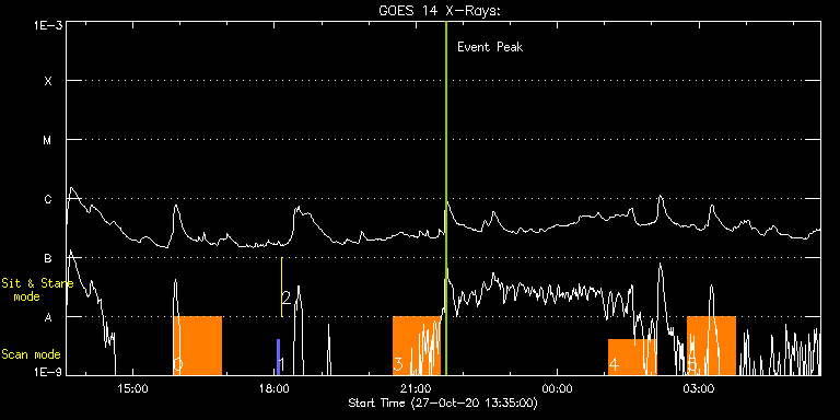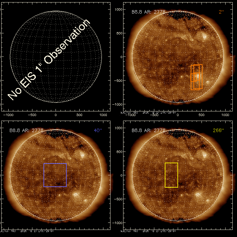 EIS Observation timeline overlay to GOES-Xray curve Code 1" 2" 40" 266" EIS Observations list for this event: STUDY ACRONYM ID DATE OBSERVED DESCRIPTION NOAA# TARGET 0 Atlas_60 | 74860 | 2020/10/27 15:50:40 | AR Observation | | Quiet Sun TIMELINE ID DATE OBSERVED FITS FILE XCEN (+W/-E) YCEN (+N/-S) DUR ----------------------------------------------------------------------------------------------------------------- 74860 | 2020/10/27 15:50:40.000 | eis_l0_20201027_155040.fits.gz | 331.20 | -444.82 | 1h1m40s 1 PRY_slot_contextLITE | 74848 | 2020/10/27 18:03:20 | Pointing Monitoring | | Active Region TIMELINE ID DATE OBSERVED FITS FILE XCEN (+W/-E) YCEN (+N/-S) DUR ----------------------------------------------------------------------------------------------------------------- 74848 | 2020/10/27 18:03:20.000 | eis_l0_20201027_180320.fits.gz | -14.12 | -1.50 | 2m57s 2 XRT_synop_AIA | 74850 | 2020/10/27 18:08:26 | Pointing Monitoring | | Quiet Sun TIMELINE ID DATE OBSERVED FITS FILE XCEN (+W/-E) YCEN (+N/-S) DUR ----------------------------------------------------------------------------------------------------------------- 74850 | 2020/10/27 18:08:26.000 | eis_l0_20201027_180826.fits.gz | -131.57 | -1.42 | 11s 3 HPW021VEL260x512v2 | 74867 | 2020/10/27 20:30:19 | AR Observation | 2778 | Active Region TIMELINE ID DATE OBSERVED FITS FILE XCEN (+W/-E) YCEN (+N/-S) DUR ----------------------------------------------------------------------------------------------------------------- 74867 | 2020/10/27 20:30:19.000 | eis_l0_20201027_203019.fits.gz | 367.09 | -443.20 | 1h0m45s 4 Atlas_60 | 74862 | 2020/10/28 01:05:13 | AR Observation | | Quiet Sun TIMELINE ID DATE OBSERVED FITS FILE XCEN (+W/-E) YCEN (+N/-S) DUR ----------------------------------------------------------------------------------------------------------------- 74862 | 2020/10/28 01:05:13.000 | eis_l0_20201028_010513.fits.gz | 404.42 | -421.19 | 1h1m39s 5 HPW021VEL260x512v2 | 74863 | 2020/10/28 02:45:13 | AR Observation | 2779 | Active Region TIMELINE ID DATE OBSERVED FITS FILE XCEN (+W/-E) YCEN (+N/-S) DUR ----------------------------------------------------------------------------------------------------------------- 74863 | 2020/10/28 02:45:13.000 | eis_l0_20201028_024513.fits.gz | 424.42 | -420.57 | 1h0m45s : Check study information : Download file : View thumbnails For this event, also check for:
