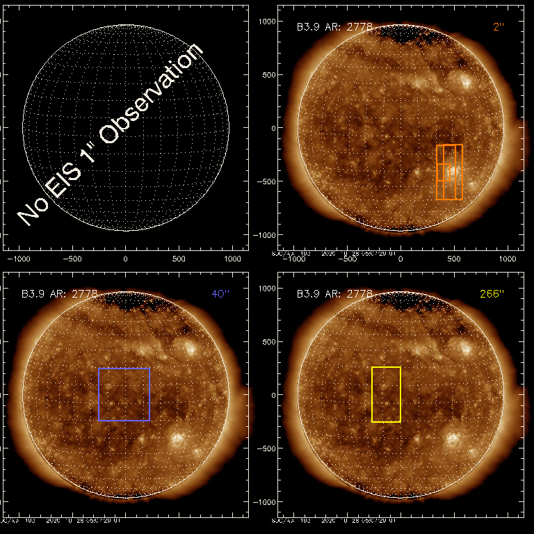 EIS Observation timeline overlay to GOES-Xray curve Code 1" 2" 40" 266" EIS Observations list for this event: STUDY ACRONYM ID DATE OBSERVED DESCRIPTION NOAA# TARGET 0 Atlas_60 | 74862 | 2020/10/28 01:05:13 | AR Observation | | Quiet Sun TIMELINE ID DATE OBSERVED FITS FILE XCEN (+W/-E) YCEN (+N/-S) DUR ----------------------------------------------------------------------------------------------------------------- 74862 | 2020/10/28 01:05:13.000 | eis_l0_20201028_010513.fits.gz | 404.42 | -421.19 | 1h1m39s 1 HPW021VEL260x512v2 | 74863 | 2020/10/28 02:45:13 | AR Observation | 2779 | Active Region TIMELINE ID DATE OBSERVED FITS FILE XCEN (+W/-E) YCEN (+N/-S) DUR ----------------------------------------------------------------------------------------------------------------- 74863 | 2020/10/28 02:45:13.000 | eis_l0_20201028_024513.fits.gz | 424.42 | -420.57 | 1h0m45s 2 PRY_slot_contextLITE | 74851 | 2020/10/28 12:43:20 | Pointing Monitoring | | Active Region TIMELINE ID DATE OBSERVED FITS FILE XCEN (+W/-E) YCEN (+N/-S) DUR ----------------------------------------------------------------------------------------------------------------- 74851 | 2020/10/28 12:43:20.000 | eis_l0_20201028_124320.fits.gz | -13.96 | -1.27 | 2m56s 3 XRT_synop_AIA | 74852 | 2020/10/28 12:48:26 | Pointing Monitoring | | Quiet Sun TIMELINE ID DATE OBSERVED FITS FILE XCEN (+W/-E) YCEN (+N/-S) DUR ----------------------------------------------------------------------------------------------------------------- 74852 | 2020/10/28 12:48:26.000 | eis_l0_20201028_124826.fits.gz | -131.57 | -1.50 | 10s 4 HPW021VEL260x512v2 | 74864 | 2020/10/28 12:55:19 | AR Observation | 2779 | Active Region TIMELINE ID DATE OBSERVED FITS FILE XCEN (+W/-E) YCEN (+N/-S) DUR ----------------------------------------------------------------------------------------------------------------- 74864 | 2020/10/28 12:55:19.000 | eis_l0_20201028_125519.fits.gz | 489.90 | -416.09 | 1h0m45s 74864 | 2020/10/28 13:56:12.000 | eis_l0_20201028_135612.fits.gz | 496.93 | -415.47 | 1h0m44s : Check study information : Download file : View thumbnails For this event, also check for: