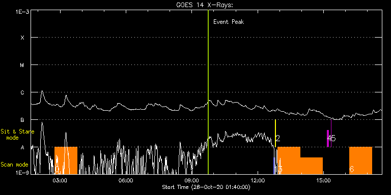EIS Observation timeline overlay to GOES-Xray curve Code 1" 2" 40" 266" EIS Observations list for this event: STUDY ACRONYM ID DATE OBSERVED DESCRIPTION NOAA# TARGET 0 HPW021VEL260x512v2 | 74863 | 2020/10/28 02:45:13 | AR Observation | 2779 | Active Region TIMELINE ID DATE OBSERVED FITS FILE XCEN (+W/-E) YCEN (+N/-S) DUR ----------------------------------------------------------------------------------------------------------------- 74863 | 2020/10/28 02:45:13.000 | eis_l0_20201028_024513.fits.gz | 424.42 | -420.57 | 1h0m45s 1 PRY_slot_contextLITE | 74851 | 2020/10/28 12:43:20 | Pointing Monitoring | | Active Region TIMELINE ID DATE OBSERVED FITS FILE XCEN (+W/-E) YCEN (+N/-S) DUR ----------------------------------------------------------------------------------------------------------------- 74851 | 2020/10/28 12:43:20.000 | eis_l0_20201028_124320.fits.gz | -13.96 | -1.27 | 2m56s 2 XRT_synop_AIA | 74852 | 2020/10/28 12:48:26 | Pointing Monitoring | | Quiet Sun TIMELINE ID DATE OBSERVED FITS FILE XCEN (+W/-E) YCEN (+N/-S) DUR ----------------------------------------------------------------------------------------------------------------- 74852 | 2020/10/28 12:48:26.000 | eis_l0_20201028_124826.fits.gz | -131.57 | -1.50 | 10s 3 HPW021VEL260x512v2 | 74864 | 2020/10/28 12:55:19 | AR Observation | 2779 | Active Region TIMELINE ID DATE OBSERVED FITS FILE XCEN (+W/-E) YCEN (+N/-S) DUR ----------------------------------------------------------------------------------------------------------------- 74864 | 2020/10/28 12:55:19.000 | eis_l0_20201028_125519.fits.gz | 489.90 | -416.09 | 1h0m45s 74864 | 2020/10/28 13:56:12.000 | eis_l0_20201028_135612.fits.gz | 496.93 | -415.47 | 1h0m44s 4 regcal074 | 74868 | 2020/10/28 15:10:11 | Dark exposures including overscan pixe | | Engineering TIMELINE ID DATE OBSERVED FITS FILE XCEN (+W/-E) YCEN (+N/-S) DUR ----------------------------------------------------------------------------------------------------------------- 74868 | 2020/10/28 15:10:11.000 | eis_l0_20201028_151011.fits.gz | 541.03 | -226.93 | 3m22s 5 regcal076 | 74869 | 2020/10/28 15:20:11 | Flatfield, 1 exposure, led 100ms, ccd | | Engineering TIMELINE ID DATE OBSERVED FITS FILE XCEN (+W/-E) YCEN (+N/-S) DUR ----------------------------------------------------------------------------------------------------------------- 74869 | 2020/10/28 15:20:11.000 | eis_l0_20201028_152011.fits.gz | 542.19 | -482.86 | 1s 6 Atlas_60 | 74865 | 2020/10/28 16:10:41 | AR Observation | | Quiet Sun TIMELINE ID DATE OBSERVED FITS FILE XCEN (+W/-E) YCEN (+N/-S) DUR ----------------------------------------------------------------------------------------------------------------- 74865 | 2020/10/28 16:10:41.000 | eis_l0_20201028_161041.fits.gz | 512.88 | -414.47 | 1h1m39s : Check study information : Download file : View thumbnails For this event, also check for: