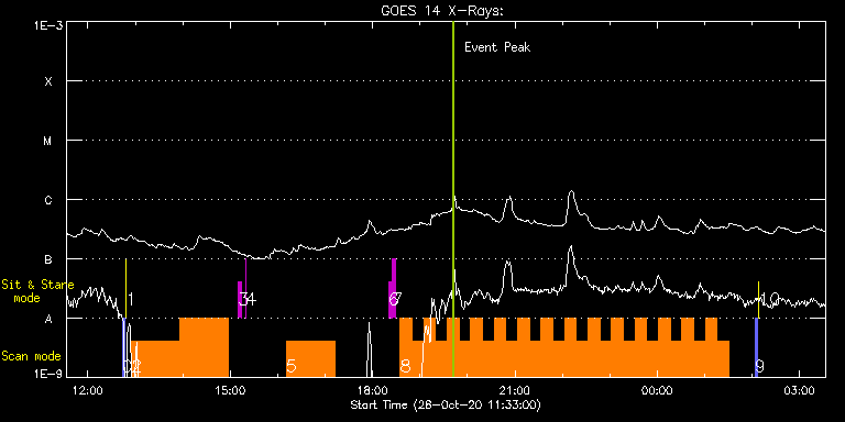 EIS Observation timeline overlay to GOES-Xray curve Code 1" 2" 40" 266" EIS Observations list for this event: STUDY ACRONYM ID DATE OBSERVED DESCRIPTION NOAA# TARGET 0 PRY_slot_contextLITE | 74851 | 2020/10/28 12:43:20 | Pointing Monitoring | | Active Region TIMELINE ID DATE OBSERVED FITS FILE XCEN (+W/-E) YCEN (+N/-S) DUR ----------------------------------------------------------------------------------------------------------------- 74851 | 2020/10/28 12:43:20.000 | eis_l0_20201028_124320.fits.gz | -13.96 | -1.27 | 2m56s 1 XRT_synop_AIA | 74852 | 2020/10/28 12:48:26 | Pointing Monitoring | | Quiet Sun TIMELINE ID DATE OBSERVED FITS FILE XCEN (+W/-E) YCEN (+N/-S) DUR ----------------------------------------------------------------------------------------------------------------- 74852 | 2020/10/28 12:48:26.000 | eis_l0_20201028_124826.fits.gz | -131.57 | -1.50 | 10s 2 HPW021VEL260x512v2 | 74864 | 2020/10/28 12:55:19 | AR Observation | 2779 | Active Region TIMELINE ID DATE OBSERVED FITS FILE XCEN (+W/-E) YCEN (+N/-S) DUR ----------------------------------------------------------------------------------------------------------------- 74864 | 2020/10/28 12:55:19.000 | eis_l0_20201028_125519.fits.gz | 489.90 | -416.09 | 1h0m45s 74864 | 2020/10/28 13:56:12.000 | eis_l0_20201028_135612.fits.gz | 496.93 | -415.47 | 1h0m44s 3 regcal074 | 74868 | 2020/10/28 15:10:11 | Dark exposures including overscan pixe | | Engineering TIMELINE ID DATE OBSERVED FITS FILE XCEN (+W/-E) YCEN (+N/-S) DUR ----------------------------------------------------------------------------------------------------------------- 74868 | 2020/10/28 15:10:11.000 | eis_l0_20201028_151011.fits.gz | 541.03 | -226.93 | 3m22s 4 regcal076 | 74869 | 2020/10/28 15:20:11 | Flatfield, 1 exposure, led 100ms, ccd | | Engineering TIMELINE ID DATE OBSERVED FITS FILE XCEN (+W/-E) YCEN (+N/-S) DUR ----------------------------------------------------------------------------------------------------------------- 74869 | 2020/10/28 15:20:11.000 | eis_l0_20201028_152011.fits.gz | 542.19 | -482.86 | 1s 5 Atlas_60 | 74865 | 2020/10/28 16:10:41 | AR Observation | | Quiet Sun TIMELINE ID DATE OBSERVED FITS FILE XCEN (+W/-E) YCEN (+N/-S) DUR ----------------------------------------------------------------------------------------------------------------- 74865 | 2020/10/28 16:10:41.000 | eis_l0_20201028_161041.fits.gz | 512.88 | -414.47 | 1h1m39s 6 regcal071 | 74870 | 2020/10/28 18:20:11 | Dark exposures, CCD bottom rows (100s | | Engineering TIMELINE ID DATE OBSERVED FITS FILE XCEN (+W/-E) YCEN (+N/-S) DUR ----------------------------------------------------------------------------------------------------------------- 74870 | 2020/10/28 18:20:11.000 | eis_l0_20201028_182011.fits.gz | 562.58 | -736.39 | 3m21s 7 regcal072 | 74871 | 2020/10/28 18:25:11 | Dark exposures, top CCD rows (100s exp | | Engineering TIMELINE ID DATE OBSERVED FITS FILE XCEN (+W/-E) YCEN (+N/-S) DUR ----------------------------------------------------------------------------------------------------------------- 74871 | 2020/10/28 18:25:11.000 | eis_l0_20201028_182511.fits.gz | 563.20 | -225.39 | 3m22s 8 ar_evolution | 74855 | 2020/10/28 18:35:12 | AR Evolution Study | | Active Region TIMELINE ID DATE OBSERVED FITS FILE XCEN (+W/-E) YCEN (+N/-S) DUR ----------------------------------------------------------------------------------------------------------------- 74855 | 2020/10/28 18:35:12.000 | eis_l0_20201028_183512.fits.gz | 526.26 | -433.23 | 14m47s 74855 | 2020/10/28 18:50:02.000 | eis_l0_20201028_185002.fits.gz | 527.96 | -433.08 | 14m47s 74855 | 2020/10/28 19:04:52.000 | eis_l0_20201028_190452.fits.gz | 529.58 | -433.08 | 14m48s 74855 | 2020/10/28 19:19:42.000 | eis_l0_20201028_191942.fits.gz | 531.20 | -433.00 | 14m48s 74855 | 2020/10/28 19:34:33.000 | eis_l0_20201028_193433.fits.gz | 532.90 | -432.85 | 14m47s 74855 | 2020/10/28 19:49:23.000 | eis_l0_20201028_194923.fits.gz | 534.52 | -432.61 | 14m47s 74855 | 2020/10/28 20:04:13.000 | eis_l0_20201028_200413.fits.gz | 536.15 | -432.54 | 14m48s 74855 | 2020/10/28 20:19:04.000 | eis_l0_20201028_201904.fits.gz | 537.84 | -432.54 | 14m47s 74855 | 2020/10/28 20:33:54.000 | eis_l0_20201028_203354.fits.gz | 539.47 | -432.23 | 14m47s 74855 | 2020/10/28 20:48:44.000 | eis_l0_20201028_204844.fits.gz | 541.09 | -432.15 | 14m48s 74855 | 2020/10/28 21:03:35.000 | eis_l0_20201028_210335.fits.gz | 542.79 | -432.07 | 14m47s 74855 | 2020/10/28 21:18:25.000 | eis_l0_20201028_211825.fits.gz | 544.26 | -431.92 | 14m47s 74855 | 2020/10/28 21:33:15.000 | eis_l0_20201028_213315.fits.gz | 545.88 | -431.84 | 14m47s 74855 | 2020/10/28 21:48:05.000 | eis_l0_20201028_214805.fits.gz | 547.58 | -431.61 | 14m48s 74855 | 2020/10/28 22:02:55.000 | eis_l0_20201028_220255.fits.gz | 549.20 | -431.61 | 14m47s 74855 | 2020/10/28 22:17:45.000 | eis_l0_20201028_221745.fits.gz | 550.82 | -431.38 | 14m47s 74855 | 2020/10/28 22:32:35.000 | eis_l0_20201028_223235.fits.gz | 552.44 | -431.30 | 14m47s 74855 | 2020/10/28 22:47:25.000 | eis_l0_20201028_224725.fits.gz | 553.99 | -431.22 | 14m47s 74855 | 2020/10/28 23:02:14.000 | eis_l0_20201028_230214.fits.gz | 555.69 | -430.92 | 14m47s 74855 | 2020/10/28 23:17:04.000 | eis_l0_20201028_231704.fits.gz | 557.23 | -430.84 | 14m47s 74855 | 2020/10/28 23:31:54.000 | eis_l0_20201028_233154.fits.gz | 558.70 | -430.76 | 14m46s 74855 | 2020/10/28 23:46:43.000 | eis_l0_20201028_234643.fits.gz | 560.40 | -430.68 | 14m47s 74855 | 2020/10/29 00:01:33.000 | eis_l0_20201029_000133.fits.gz | 561.95 | -430.45 | 14m46s 74855 | 2020/10/29 00:16:22.000 | eis_l0_20201029_001622.fits.gz | 563.57 | -430.38 | 14m47s 74855 | 2020/10/29 00:31:12.000 | eis_l0_20201029_003112.fits.gz | 565.19 | -430.30 | 14m46s 74855 | 2020/10/29 00:46:01.000 | eis_l0_20201029_004601.fits.gz | 566.73 | -430.07 | 14m47s 74855 | 2020/10/29 01:00:51.000 | eis_l0_20201029_010051.fits.gz | 568.36 | -429.91 | 14m47s 74855 | 2020/10/29 01:15:41.000 | eis_l0_20201029_011541.fits