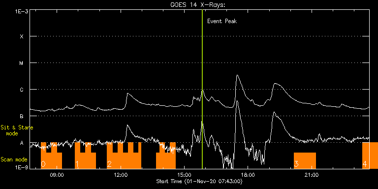 EIS Observation timeline overlay to GOES-Xray curve Code 1" 2" 40" 266" EIS Observations list for this event: STUDY ACRONYM ID DATE OBSERVED DESCRIPTION NOAA# TARGET 0 ar_evolution | 74919 | 2020/11/01 08:14:40 | AR Evolution Study | 2779 | Active Region TIMELINE ID DATE OBSERVED FITS FILE XCEN (+W/-E) YCEN (+N/-S) DUR ----------------------------------------------------------------------------------------------------------------- 74919 | 2020/11/01 08:14:40.000 | eis_l0_20201101_081440.fits.gz | 892.19 | -281.40 | 14m47s 74919 | 2020/11/01 08:29:30.000 | eis_l0_20201101_082930.fits.gz | 892.12 | -281.40 | 14m47s 74919 | 2020/11/01 08:44:20.000 | eis_l0_20201101_084420.fits.gz | 892.19 | -281.33 | 14m47s 74919 | 2020/11/01 08:59:10.000 | eis_l0_20201101_085910.fits.gz | 892.19 | -281.56 | 14m47s 1 ar_evolution | 74920 | 2020/11/01 09:50:43 | AR Evolution Study | 2779 | Active Region TIMELINE ID DATE OBSERVED FITS FILE XCEN (+W/-E) YCEN (+N/-S) DUR ----------------------------------------------------------------------------------------------------------------- 74920 | 2020/11/01 09:50:43.000 | eis_l0_20201101_095043.fits.gz | 892.19 | -281.48 | 14m47s 74920 | 2020/11/01 10:05:33.000 | eis_l0_20201101_100533.fits.gz | 892.12 | -281.48 | 14m47s 74920 | 2020/11/01 10:20:23.000 | eis_l0_20201101_102023.fits.gz | 892.19 | -281.33 | 14m46s 74920 | 2020/11/01 10:35:12.000 | eis_l0_20201101_103512.fits.gz | 892.19 | -281.40 | 14m47s 2 ar_evolution | 74921 | 2020/11/01 11:21:43 | AR Evolution Study | 2779 | Active Region TIMELINE ID DATE OBSERVED FITS FILE XCEN (+W/-E) YCEN (+N/-S) DUR ----------------------------------------------------------------------------------------------------------------- 74921 | 2020/11/01 11:21:43.000 | eis_l0_20201101_112143.fits.gz | 892.12 | -281.33 | 14m47s 74921 | 2020/11/01 11:36:33.000 | eis_l0_20201101_113633.fits.gz | 892.19 | -281.48 | 14m47s 74921 | 2020/11/01 11:51:23.000 | eis_l0_20201101_115123.fits.gz | 892.19 | -281.40 | 14m47s 74921 | 2020/11/01 12:06:13.000 | eis_l0_20201101_120613.fits.gz | 892.27 | -281.40 | 14m46s 74921 | 2020/11/01 12:21:02.000 | eis_l0_20201101_122102.fits.gz | 892.19 | -281.40 | 14m47s 74921 | 2020/11/01 12:35:52.000 | eis_l0_20201101_123552.fits.gz | 892.27 | -281.33 | 14m46s 74921 | 2020/11/01 12:50:41.000 | eis_l0_20201101_125041.fits.gz | 892.19 | -281.56 | 6m7s 74921 | 2020/11/01 13:39:52.000 | eis_l0_20201101_133952.fits.gz | 892.12 | -281.40 | 10m5s 74921 | 2020/11/01 13:50:00.000 | eis_l0_20201101_135000.fits.gz | 892.19 | -281.40 | 14m47s 74921 | 2020/11/01 14:04:49.000 | eis_l0_20201101_140449.fits.gz | 892.19 | -281.48 | 14m48s 74921 | 2020/11/01 14:19:40.000 | eis_l0_20201101_141940.fits.gz | 892.19 | -281.48 | 14m47s 3 Large_CH_Map | 74891 | 2020/11/01 20:09:43 | HOP 336 (Cycle 25 bright points) North | | Quiet Sun TIMELINE ID DATE OBSERVED FITS FILE XCEN (+W/-E) YCEN (+N/-S) DUR ----------------------------------------------------------------------------------------------------------------- 74891 | 2020/11/01 20:09:43.000 | eis_l0_20201101_200943.fits.gz | -24.74 | 494.34 | 1h1m53s 4 Large_CH_Map | 74893 | 2020/11/01 23:23:10 | HOP 336 (Cycle 25 bright points) South | | Quiet Sun TIMELINE ID DATE OBSERVED FITS FILE XCEN (+W/-E) YCEN (+N/-S) DUR ----------------------------------------------------------------------------------------------------------------- 74893 | 2020/11/01 23:23:10.000 | eis_l0_20201101_232310.fits.gz | -24.58 | -678.51 | 1h1m53s : Check study information : Download file : View thumbnails For this event, also check for: