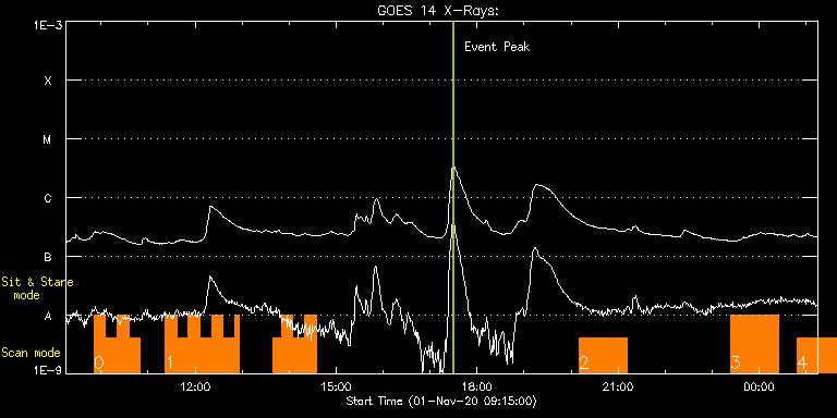 EIS Observation timeline overlay to GOES-Xray curve Code 1" 2" 40" 266" EIS Observations list for this event: STUDY ACRONYM ID DATE OBSERVED DESCRIPTION NOAA# TARGET 0 ar_evolution | 74920 | 2020/11/01 09:50:43 | AR Evolution Study | 2779 | Active Region TIMELINE ID DATE OBSERVED FITS FILE XCEN (+W/-E) YCEN (+N/-S) DUR ----------------------------------------------------------------------------------------------------------------- 74920 | 2020/11/01 09:50:43.000 | eis_l0_20201101_095043.fits.gz | 892.19 | -281.48 | 14m47s 74920 | 2020/11/01 10:05:33.000 | eis_l0_20201101_100533.fits.gz | 892.12 | -281.48 | 14m47s 74920 | 2020/11/01 10:20:23.000 | eis_l0_20201101_102023.fits.gz | 892.19 | -281.33 | 14m46s 74920 | 2020/11/01 10:35:12.000 | eis_l0_20201101_103512.fits.gz | 892.19 | -281.40 | 14m47s 1 ar_evolution | 74921 | 2020/11/01 11:21:43 | AR Evolution Study | 2779 | Active Region TIMELINE ID DATE OBSERVED FITS FILE XCEN (+W/-E) YCEN (+N/-S) DUR ----------------------------------------------------------------------------------------------------------------- 74921 | 2020/11/01 11:21:43.000 | eis_l0_20201101_112143.fits.gz | 892.12 | -281.33 | 14m47s 74921 | 2020/11/01 11:36:33.000 | eis_l0_20201101_113633.fits.gz | 892.19 | -281.48 | 14m47s 74921 | 2020/11/01 11:51:23.000 | eis_l0_20201101_115123.fits.gz | 892.19 | -281.40 | 14m47s 74921 | 2020/11/01 12:06:13.000 | eis_l0_20201101_120613.fits.gz | 892.27 | -281.40 | 14m46s 74921 | 2020/11/01 12:21:02.000 | eis_l0_20201101_122102.fits.gz | 892.19 | -281.40 | 14m47s 74921 | 2020/11/01 12:35:52.000 | eis_l0_20201101_123552.fits.gz | 892.27 | -281.33 | 14m46s 74921 | 2020/11/01 12:50:41.000 | eis_l0_20201101_125041.fits.gz | 892.19 | -281.56 | 6m7s 74921 | 2020/11/01 13:39:52.000 | eis_l0_20201101_133952.fits.gz | 892.12 | -281.40 | 10m5s 74921 | 2020/11/01 13:50:00.000 | eis_l0_20201101_135000.fits.gz | 892.19 | -281.40 | 14m47s 74921 | 2020/11/01 14:04:49.000 | eis_l0_20201101_140449.fits.gz | 892.19 | -281.48 | 14m48s 74921 | 2020/11/01 14:19:40.000 | eis_l0_20201101_141940.fits.gz | 892.19 | -281.48 | 14m47s 2 Large_CH_Map | 74891 | 2020/11/01 20:09:43 | HOP 336 (Cycle 25 bright points) North | | Quiet Sun TIMELINE ID DATE OBSERVED FITS FILE XCEN (+W/-E) YCEN (+N/-S) DUR ----------------------------------------------------------------------------------------------------------------- 74891 | 2020/11/01 20:09:43.000 | eis_l0_20201101_200943.fits.gz | -24.74 | 494.34 | 1h1m53s 3 Large_CH_Map | 74893 | 2020/11/01 23:23:10 | HOP 336 (Cycle 25 bright points) South | | Quiet Sun TIMELINE ID DATE OBSERVED FITS FILE XCEN (+W/-E) YCEN (+N/-S) DUR ----------------------------------------------------------------------------------------------------------------- 74893 | 2020/11/01 23:23:10.000 | eis_l0_20201101_232310.fits.gz | -24.58 | -678.51 | 1h1m53s 4 Large_CH_Map | 74894 | 2020/11/02 00:49:09 | HOP 336 (Cycle 25 bright points) South | | Quiet Sun TIMELINE ID DATE OBSERVED FITS FILE XCEN (+W/-E) YCEN (+N/-S) DUR ----------------------------------------------------------------------------------------------------------------- 74894 | 2020/11/02 00:49:09.000 | eis_l0_20201102_004909.fits.gz | -24.66 | -678.51 | 1h1m53s : Check study information : Download file : View thumbnails For this event, also check for: