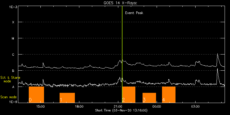 EIS Observation timeline overlay to GOES-Xray curve Code 1" 2" 40" 266" EIS Observations list for this event: STUDY ACRONYM ID DATE OBSERVED DESCRIPTION NOAA# TARGET 0 HOP81_new_study | 74932 | 2020/11/03 14:05:53 | Polar Monitoring Campaign during the S | | Coronal Hole TIMELINE ID DATE OBSERVED FITS FILE XCEN (+W/-E) YCEN (+N/-S) DUR ----------------------------------------------------------------------------------------------------------------- 74932 | 2020/11/03 14:05:53.000 | eis_l0_20201103_140553.fits.gz | -25.33 | 898.66 | 1h9m45s 1 HOP81_new_study | 74946 | 2020/11/03 16:28:43 | Polar Monitoring Campaign during the S | | Coronal Hole TIMELINE ID DATE OBSERVED FITS FILE XCEN (+W/-E) YCEN (+N/-S) DUR ----------------------------------------------------------------------------------------------------------------- 74946 | 2020/11/03 16:28:43.000 | eis_l0_20201103_162843.fits.gz | -25.48 | 898.73 | 1h9m45s 2 HPW021VEL260x512v2 | 74934 | 2020/11/03 21:19:13 | Solar Orbiter/SPICE observation suppor | 2781 | Active Region TIMELINE ID DATE OBSERVED FITS FILE XCEN (+W/-E) YCEN (+N/-S) DUR ----------------------------------------------------------------------------------------------------------------- 74934 | 2020/11/03 21:19:13.000 | eis_l0_20201103_211913.fits.gz | -835.47 | -408.84 | 1h0m44s 3 Atlas_60 | 74935 | 2020/11/03 22:54:43 | Solar Orbiter/SPICE observation suppor | 2781 | Quiet Sun TIMELINE ID DATE OBSERVED FITS FILE XCEN (+W/-E) YCEN (+N/-S) DUR ----------------------------------------------------------------------------------------------------------------- 74935 | 2020/11/03 22:54:43.000 | eis_l0_20201103_225443.fits.gz | -829.66 | -409.69 | 1h1m40s 4 HPW021VEL260x512v2 | 74936 | 2020/11/04 00:25:43 | Solar Orbiter/SPICE observation suppor | | Active Region TIMELINE ID DATE OBSERVED FITS FILE XCEN (+W/-E) YCEN (+N/-S) DUR ----------------------------------------------------------------------------------------------------------------- 74936 | 2020/11/04 00:25:43.000 | eis_l0_20201104_002543.fits.gz | -454.71 | -409.99 | 1h0m45s : Check study information : Download file : View thumbnails For this event, also check for: