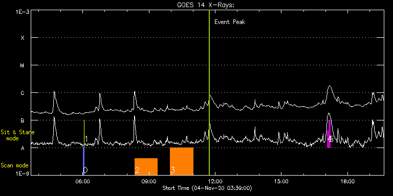 EIS Observation timeline overlay to GOES-Xray curve Code 1" 2" 40" 266" EIS Observations list for this event: STUDY ACRONYM ID DATE OBSERVED DESCRIPTION NOAA# TARGET 0 PRY_slot_contextLITE | 74947 | 2020/11/04 06:00:20 | Pointing Monitoring | | Active Region TIMELINE ID DATE OBSERVED FITS FILE XCEN (+W/-E) YCEN (+N/-S) DUR ----------------------------------------------------------------------------------------------------------------- 74947 | 2020/11/04 06:00:20.000 | eis_l0_20201104_060020.fits.gz | -15.29 | -0.42 | 2m56s 1 XRT_synop_AIA | 74948 | 2020/11/04 06:03:35 | Pointing Monitoring | | Quiet Sun TIMELINE ID DATE OBSERVED FITS FILE XCEN (+W/-E) YCEN (+N/-S) DUR ----------------------------------------------------------------------------------------------------------------- 74948 | 2020/11/04 06:03:35.000 | eis_l0_20201104_060335.fits.gz | -132.57 | -0.35 | 10s 2 HPW021VEL260x512v2 | 74937 | 2020/11/04 08:21:49 | Solar Orbiter/SPICE observation suppor | | Active Region TIMELINE ID DATE OBSERVED FITS FILE XCEN (+W/-E) YCEN (+N/-S) DUR ----------------------------------------------------------------------------------------------------------------- 74937 | 2020/11/04 08:21:49.000 | eis_l0_20201104_082149.fits.gz | -641.52 | 292.88 | 1h0m45s 3 Atlas_60 | 74938 | 2020/11/04 09:57:43 | Solar Orbiter/SPICE observation suppor | | Quiet Sun TIMELINE ID DATE OBSERVED FITS FILE XCEN (+W/-E) YCEN (+N/-S) DUR ----------------------------------------------------------------------------------------------------------------- 74938 | 2020/11/04 09:57:43.000 | eis_l0_20201104_095743.fits.gz | -630.82 | 292.42 | 1h1m40s 4 regcal071 | 74944 | 2020/11/04 17:05:11 | Dark exposures, CCD bottom rows (100s | | Engineering TIMELINE ID DATE OBSERVED FITS FILE XCEN (+W/-E) YCEN (+N/-S) DUR ----------------------------------------------------------------------------------------------------------------- 74944 | 2020/11/04 17:05:11.000 | eis_l0_20201104_170511.fits.gz | -566.54 | -53.05 | 3m22s 5 regcal072 | 74945 | 2020/11/04 17:09:00 | Dark exposures, top CCD rows (100s exp | | Engineering TIMELINE ID DATE OBSERVED FITS FILE XCEN (+W/-E) YCEN (+N/-S) DUR ----------------------------------------------------------------------------------------------------------------- 74945 | 2020/11/04 17:09:00.000 | eis_l0_20201104_170900.fits.gz | -566.08 | 457.95 | 3m22s : Check study information : Download file : View thumbnails For this event, also check for: