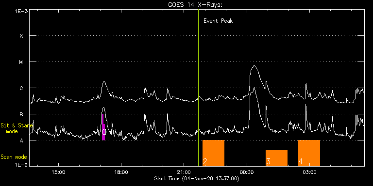 EIS Observation timeline overlay to GOES-Xray curve Code 1" 2" 40" 266" EIS Observations list for this event: STUDY ACRONYM ID DATE OBSERVED DESCRIPTION NOAA# TARGET 0 regcal071 | 74944 | 2020/11/04 17:05:11 | Dark exposures, CCD bottom rows (100s | | Engineering TIMELINE ID DATE OBSERVED FITS FILE XCEN (+W/-E) YCEN (+N/-S) DUR ----------------------------------------------------------------------------------------------------------------- 74944 | 2020/11/04 17:05:11.000 | eis_l0_20201104_170511.fits.gz | -566.54 | -53.05 | 3m22s 1 regcal072 | 74945 | 2020/11/04 17:09:00 | Dark exposures, top CCD rows (100s exp | | Engineering TIMELINE ID DATE OBSERVED FITS FILE XCEN (+W/-E) YCEN (+N/-S) DUR ----------------------------------------------------------------------------------------------------------------- 74945 | 2020/11/04 17:09:00.000 | eis_l0_20201104_170900.fits.gz | -566.08 | 457.95 | 3m22s 2 HPW021VEL260x512v2 | 74939 | 2020/11/04 21:54:10 | Solar Orbiter/SPICE observation suppor | 2781 | Active Region TIMELINE ID DATE OBSERVED FITS FILE XCEN (+W/-E) YCEN (+N/-S) DUR ----------------------------------------------------------------------------------------------------------------- 74939 | 2020/11/04 21:54:10.000 | eis_l0_20201104_215410.fits.gz | -730.04 | -421.04 | 1h0m45s 3 HPW021VEL260x512v2 | 74940 | 2020/11/05 00:54:42 | Solar Orbiter/SPICE observation suppor | | Active Region TIMELINE ID DATE OBSERVED FITS FILE XCEN (+W/-E) YCEN (+N/-S) DUR ----------------------------------------------------------------------------------------------------------------- 74940 | 2020/11/05 00:54:42.000 | eis_l0_20201105_005442.fits.gz | -260.70 | -414.17 | 1h0m46s 4 Atlas_60 | 74941 | 2020/11/05 02:27:43 | Solar Orbiter/SPICE observation suppor | | Quiet Sun TIMELINE ID DATE OBSERVED FITS FILE XCEN (+W/-E) YCEN (+N/-S) DUR ----------------------------------------------------------------------------------------------------------------- 74941 | 2020/11/05 02:27:43.000 | eis_l0_20201105_022743.fits.gz | -247.38 | -414.24 | 1h1m39s : Check study information : Download file : View thumbnails For this event, also check for: