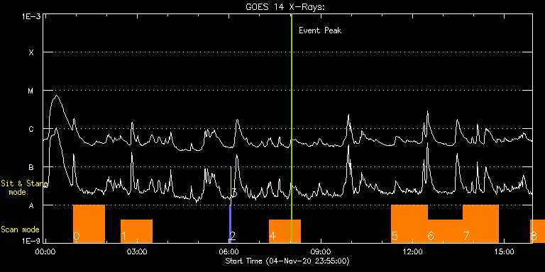 EIS Observation timeline overlay to GOES-Xray curve Code 1" 2" 40" 266" EIS Observations list for this event: STUDY ACRONYM ID DATE OBSERVED DESCRIPTION NOAA# TARGET 0 HPW021VEL260x512v2 | 74940 | 2020/11/05 00:54:42 | Solar Orbiter/SPICE observation suppor | | Active Region TIMELINE ID DATE OBSERVED FITS FILE XCEN (+W/-E) YCEN (+N/-S) DUR ----------------------------------------------------------------------------------------------------------------- 74940 | 2020/11/05 00:54:42.000 | eis_l0_20201105_005442.fits.gz | -260.70 | -414.17 | 1h0m46s 1 Atlas_60 | 74941 | 2020/11/05 02:27:43 | Solar Orbiter/SPICE observation suppor | | Quiet Sun TIMELINE ID DATE OBSERVED FITS FILE XCEN (+W/-E) YCEN (+N/-S) DUR ----------------------------------------------------------------------------------------------------------------- 74941 | 2020/11/05 02:27:43.000 | eis_l0_20201105_022743.fits.gz | -247.38 | -414.24 | 1h1m39s 2 PRY_slot_contextLITE | 74949 | 2020/11/05 06:00:19 | Pointing Monitoring | | Active Region TIMELINE ID DATE OBSERVED FITS FILE XCEN (+W/-E) YCEN (+N/-S) DUR ----------------------------------------------------------------------------------------------------------------- 74949 | 2020/11/05 06:00:19.000 | eis_l0_20201105_060019.fits.gz | -15.21 | -0.42 | 2m56s 3 XRT_synop_AIA | 74950 | 2020/11/05 06:03:34 | Pointing Monitoring | | Quiet Sun TIMELINE ID DATE OBSERVED FITS FILE XCEN (+W/-E) YCEN (+N/-S) DUR ----------------------------------------------------------------------------------------------------------------- 74950 | 2020/11/05 06:03:34.000 | eis_l0_20201105_060334.fits.gz | -132.57 | -0.58 | 10s 4 HPW021VEL260x512v2 | 74942 | 2020/11/05 07:19:19 | Solar Orbiter/SPICE observation suppor | | Active Region TIMELINE ID DATE OBSERVED FITS FILE XCEN (+W/-E) YCEN (+N/-S) DUR ----------------------------------------------------------------------------------------------------------------- 74942 | 2020/11/05 07:19:19.000 | eis_l0_20201105_071919.fits.gz | -483.25 | 286.16 | 1h0m45s 5 HOP81_new_study | 74951 | 2020/11/05 11:18:42 | Polar Monitoring Campaign during the S | | Coronal Hole TIMELINE ID DATE OBSERVED FITS FILE XCEN (+W/-E) YCEN (+N/-S) DUR ----------------------------------------------------------------------------------------------------------------- 74951 | 2020/11/05 11:18:42.000 | eis_l0_20201105_111842.fits.gz | -25.83 | -921.61 | 1h9m45s 6 HOP81_new_study | 74952 | 2020/11/05 12:28:59 | Polar Monitoring Campaign during the S | | Coronal Hole TIMELINE ID DATE OBSERVED FITS FILE XCEN (+W/-E) YCEN (+N/-S) DUR ----------------------------------------------------------------------------------------------------------------- 74952 | 2020/11/05 12:28:59.000 | eis_l0_20201105_122859.fits.gz | -25.91 | -921.38 | 1h9m45s 7 HOP81_new_study | 74953 | 2020/11/05 13:38:48 | Polar Monitoring Campaign during the S | | Coronal Hole TIMELINE ID DATE OBSERVED FITS FILE XCEN (+W/-E) YCEN (+N/-S) DUR ----------------------------------------------------------------------------------------------------------------- 74953 | 2020/11/05 13:38:48.000 | eis_l0_20201105_133848.fits.gz | -25.91 | -921.45 | 1h9m45s 8 HOP81_new_study | 74954 | 2020/11/05 15:50:44 | Polar Monitoring Campaign during the S | | Coronal Hole TIMELINE ID DATE OBSERVED FITS FILE XCEN (+W/-E) YCEN (+N/-S) DUR ----------------------------------------------------------------------------------------------------------------- 74954 | 2020/11/05 15:50:44.000 | eis_l0_20201105_155044.fits.gz | -25.91 | -921.53 | 1h9m44s : Check study information : Download file : View thumbnails For this event, also check for: