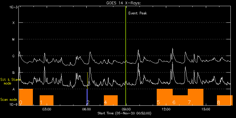 EIS Observation timeline overlay to GOES-Xray curve Code 1" 2" 40" 266" EIS Observations list for this event: STUDY ACRONYM ID DATE OBSERVED DESCRIPTION NOAA# TARGET 0 HPW021VEL260x512v2 | 74940 | 2020/11/05 00:54:42 | Solar Orbiter/SPICE observation suppor | | Active Region TIMELINE ID DATE OBSERVED FITS FILE XCEN (+W/-E) YCEN (+N/-S) DUR ----------------------------------------------------------------------------------------------------------------- 74940 | 2020/11/05 00:54:42.000 | eis_l0_20201105_005442.fits.gz | -260.70 | -414.17 | 1h0m46s 1 Atlas_60 | 74941 | 2020/11/05 02:27:43 | Solar Orbiter/SPICE observation suppor | | Quiet Sun TIMELINE ID DATE OBSERVED FITS FILE XCEN (+W/-E) YCEN (+N/-S) DUR ----------------------------------------------------------------------------------------------------------------- 74941 | 2020/11/05 02:27:43.000 | eis_l0_20201105_022743.fits.gz | -247.38 | -414.24 | 1h1m39s 2 PRY_slot_contextLITE | 74949 | 2020/11/05 06:00:19 | Pointing Monitoring | | Active Region TIMELINE ID DATE OBSERVED FITS FILE XCEN (+W/-E) YCEN (+N/-S) DUR ----------------------------------------------------------------------------------------------------------------- 74949 | 2020/11/05 06:00:19.000 | eis_l0_20201105_060019.fits.gz | -15.21 | -0.42 | 2m56s 3 XRT_synop_AIA | 74950 | 2020/11/05 06:03:34 | Pointing Monitoring | | Quiet Sun TIMELINE ID DATE OBSERVED FITS FILE XCEN (+W/-E) YCEN (+N/-S) DUR ----------------------------------------------------------------------------------------------------------------- 74950 | 2020/11/05 06:03:34.000 | eis_l0_20201105_060334.fits.gz | -132.57 | -0.58 | 10s 4 HPW021VEL260x512v2 | 74942 | 2020/11/05 07:19:19 | Solar Orbiter/SPICE observation suppor | | Active Region TIMELINE ID DATE OBSERVED FITS FILE XCEN (+W/-E) YCEN (+N/-S) DUR ----------------------------------------------------------------------------------------------------------------- 74942 | 2020/11/05 07:19:19.000 | eis_l0_20201105_071919.fits.gz | -483.25 | 286.16 | 1h0m45s 5 HOP81_new_study | 74951 | 2020/11/05 11:18:42 | Polar Monitoring Campaign during the S | | Coronal Hole TIMELINE ID DATE OBSERVED FITS FILE XCEN (+W/-E) YCEN (+N/-S) DUR ----------------------------------------------------------------------------------------------------------------- 74951 | 2020/11/05 11:18:42.000 | eis_l0_20201105_111842.fits.gz | -25.83 | -921.61 | 1h9m45s 6 HOP81_new_study | 74952 | 2020/11/05 12:28:59 | Polar Monitoring Campaign during the S | | Coronal Hole TIMELINE ID DATE OBSERVED FITS FILE XCEN (+W/-E) YCEN (+N/-S) DUR ----------------------------------------------------------------------------------------------------------------- 74952 | 2020/11/05 12:28:59.000 | eis_l0_20201105_122859.fits.gz | -25.91 | -921.38 | 1h9m45s 7 HOP81_new_study | 74953 | 2020/11/05 13:38:48 | Polar Monitoring Campaign during the S | | Coronal Hole TIMELINE ID DATE OBSERVED FITS FILE XCEN (+W/-E) YCEN (+N/-S) DUR ----------------------------------------------------------------------------------------------------------------- 74953 | 2020/11/05 13:38:48.000 | eis_l0_20201105_133848.fits.gz | -25.91 | -921.45 | 1h9m45s 8 HOP81_new_study | 74954 | 2020/11/05 15:50:44 | Polar Monitoring Campaign during the S | | Coronal Hole TIMELINE ID DATE OBSERVED FITS FILE XCEN (+W/-E) YCEN (+N/-S) DUR ----------------------------------------------------------------------------------------------------------------- 74954 | 2020/11/05 15:50:44.000 | eis_l0_20201105_155044.fits.gz | -25.91 | -921.53 | 1h9m44s : Check study information : Download file : View thumbnails For this event, also check for: