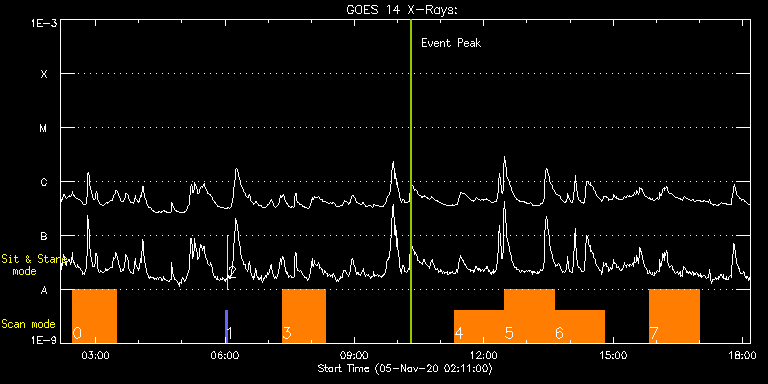 EIS Observation timeline overlay to GOES-Xray curve Code 1" 2" 40" 266" EIS Observations list for this event: STUDY ACRONYM ID DATE OBSERVED DESCRIPTION NOAA# TARGET 0 Atlas_60 | 74941 | 2020/11/05 02:27:43 | Solar Orbiter/SPICE observation suppor | | Quiet Sun TIMELINE ID DATE OBSERVED FITS FILE XCEN (+W/-E) YCEN (+N/-S) DUR ----------------------------------------------------------------------------------------------------------------- 74941 | 2020/11/05 02:27:43.000 | eis_l0_20201105_022743.fits.gz | -247.38 | -414.24 | 1h1m39s 1 PRY_slot_contextLITE | 74949 | 2020/11/05 06:00:19 | Pointing Monitoring | | Active Region TIMELINE ID DATE OBSERVED FITS FILE XCEN (+W/-E) YCEN (+N/-S) DUR ----------------------------------------------------------------------------------------------------------------- 74949 | 2020/11/05 06:00:19.000 | eis_l0_20201105_060019.fits.gz | -15.21 | -0.42 | 2m56s 2 XRT_synop_AIA | 74950 | 2020/11/05 06:03:34 | Pointing Monitoring | | Quiet Sun TIMELINE ID DATE OBSERVED FITS FILE XCEN (+W/-E) YCEN (+N/-S) DUR ----------------------------------------------------------------------------------------------------------------- 74950 | 2020/11/05 06:03:34.000 | eis_l0_20201105_060334.fits.gz | -132.57 | -0.58 | 10s 3 HPW021VEL260x512v2 | 74942 | 2020/11/05 07:19:19 | Solar Orbiter/SPICE observation suppor | | Active Region TIMELINE ID DATE OBSERVED FITS FILE XCEN (+W/-E) YCEN (+N/-S) DUR ----------------------------------------------------------------------------------------------------------------- 74942 | 2020/11/05 07:19:19.000 | eis_l0_20201105_071919.fits.gz | -483.25 | 286.16 | 1h0m45s 4 HOP81_new_study | 74951 | 2020/11/05 11:18:42 | Polar Monitoring Campaign during the S | | Coronal Hole TIMELINE ID DATE OBSERVED FITS FILE XCEN (+W/-E) YCEN (+N/-S) DUR ----------------------------------------------------------------------------------------------------------------- 74951 | 2020/11/05 11:18:42.000 | eis_l0_20201105_111842.fits.gz | -25.83 | -921.61 | 1h9m45s 5 HOP81_new_study | 74952 | 2020/11/05 12:28:59 | Polar Monitoring Campaign during the S | | Coronal Hole TIMELINE ID DATE OBSERVED FITS FILE XCEN (+W/-E) YCEN (+N/-S) DUR ----------------------------------------------------------------------------------------------------------------- 74952 | 2020/11/05 12:28:59.000 | eis_l0_20201105_122859.fits.gz | -25.91 | -921.38 | 1h9m45s 6 HOP81_new_study | 74953 | 2020/11/05 13:38:48 | Polar Monitoring Campaign during the S | | Coronal Hole TIMELINE ID DATE OBSERVED FITS FILE XCEN (+W/-E) YCEN (+N/-S) DUR ----------------------------------------------------------------------------------------------------------------- 74953 | 2020/11/05 13:38:48.000 | eis_l0_20201105_133848.fits.gz | -25.91 | -921.45 | 1h9m45s 7 HOP81_new_study | 74954 | 2020/11/05 15:50:44 | Polar Monitoring Campaign during the S | | Coronal Hole TIMELINE ID DATE OBSERVED FITS FILE XCEN (+W/-E) YCEN (+N/-S) DUR ----------------------------------------------------------------------------------------------------------------- 74954 | 2020/11/05 15:50:44.000 | eis_l0_20201105_155044.fits.gz | -25.91 | -921.53 | 1h9m44s : Check study information : Download file : View thumbnails For this event, also check for: